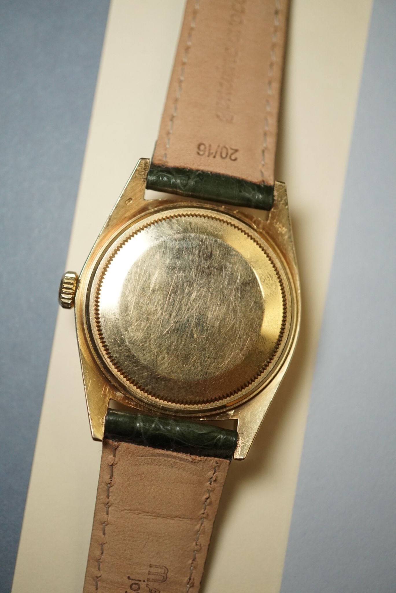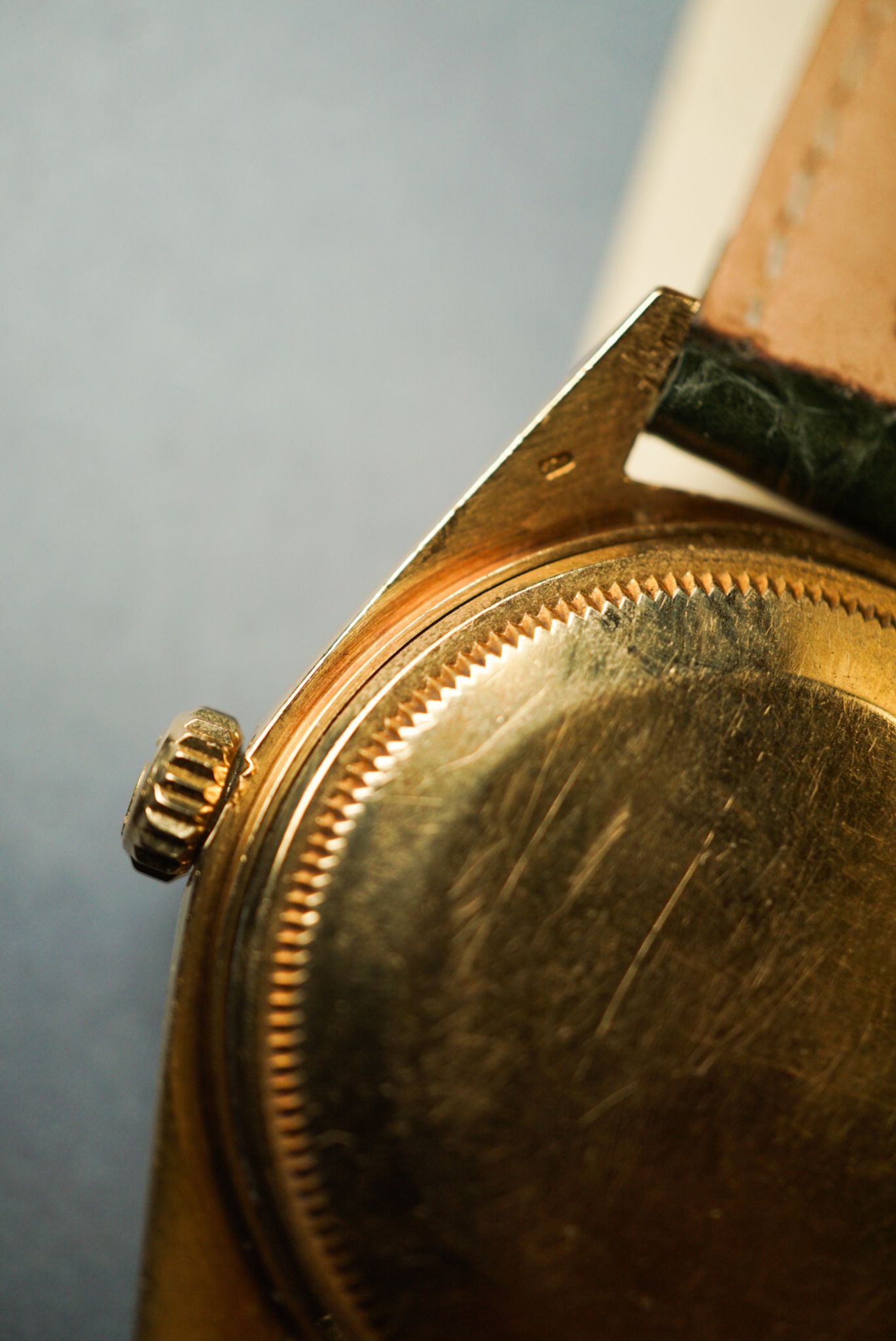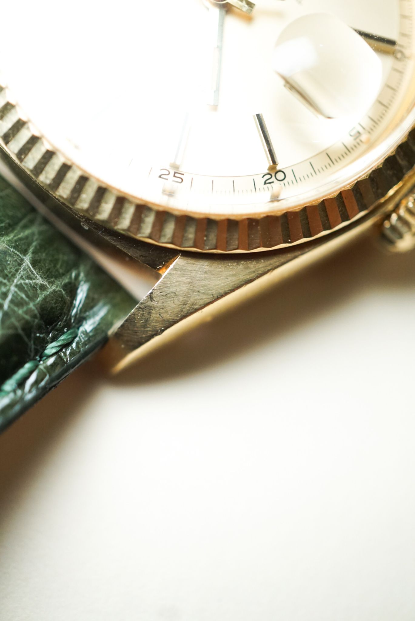 The case is in amazing unpolished condition. Showing thick lugs and normal wear on the sides of the case. It remains super sharp with subtle tones of rose oxidation on the top of the lugs.