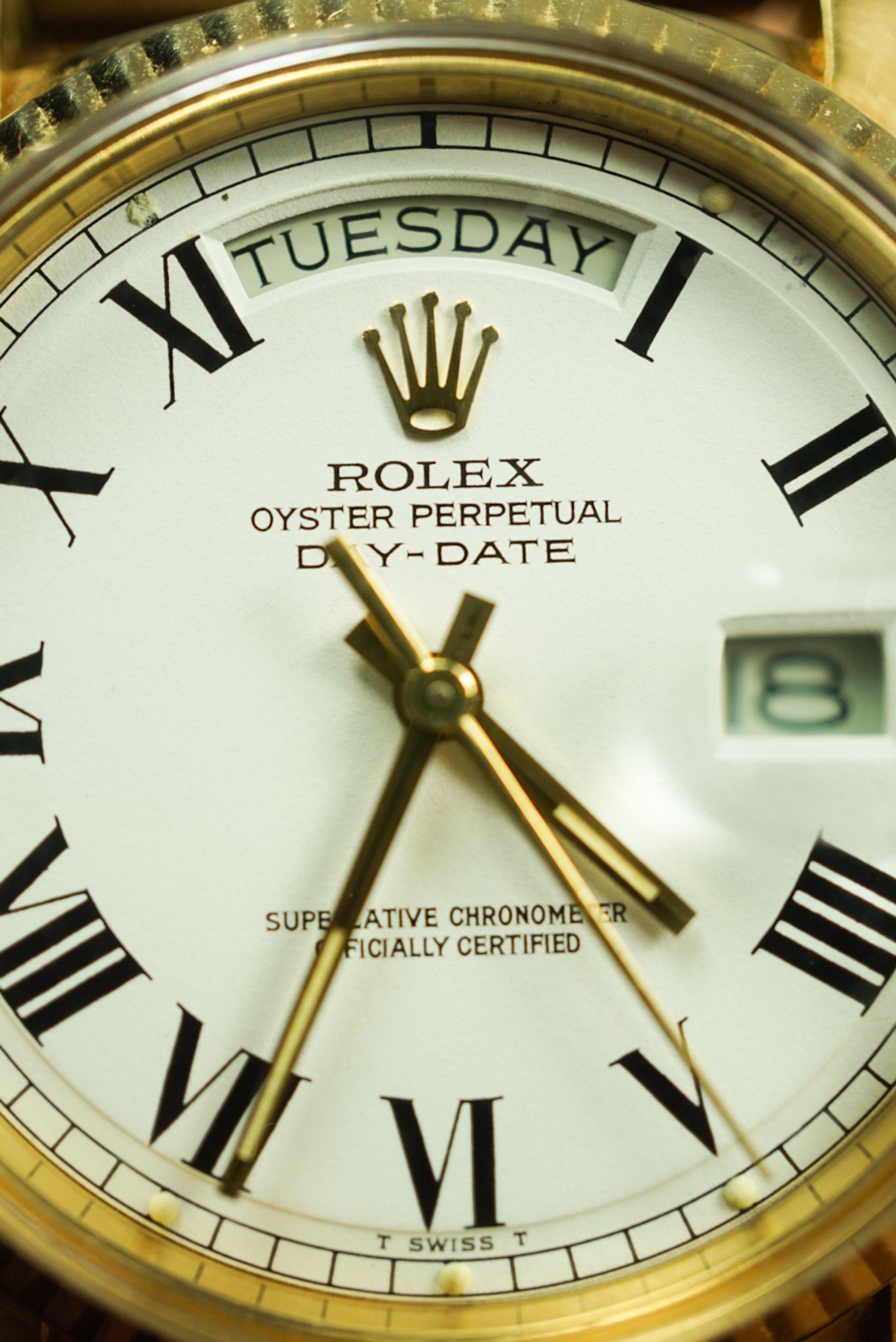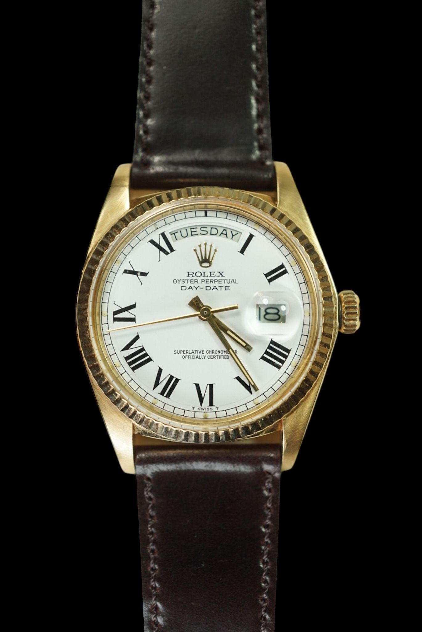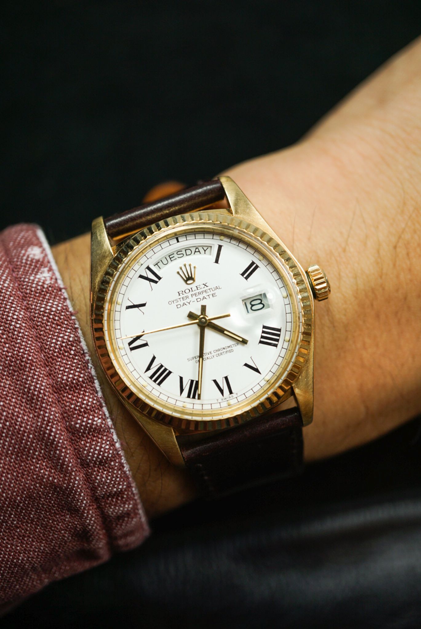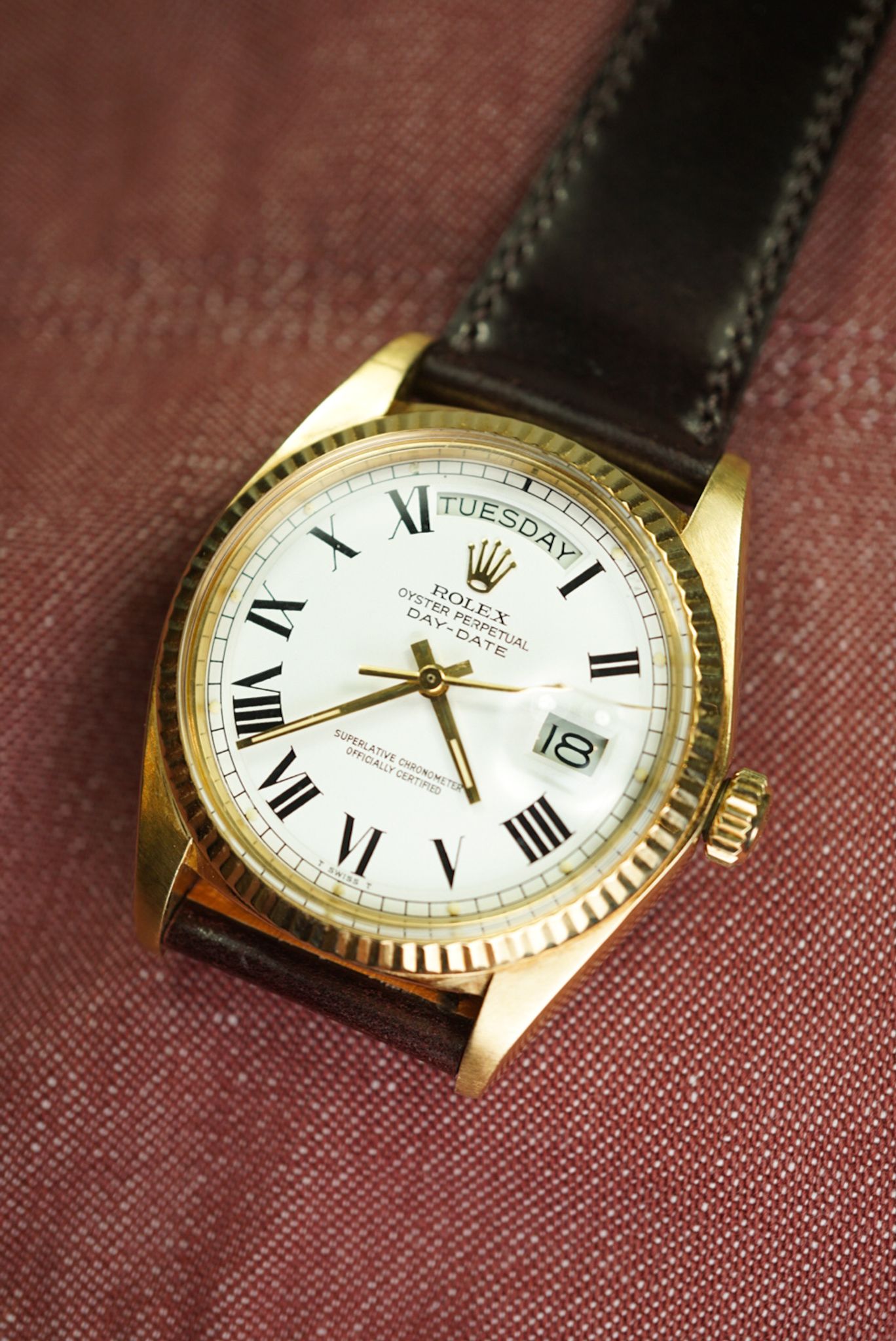 Another beautiful Day-Date — this one featuring a particularly attractive white matte Buckley dial. The Roman numerals give the piece a distinct personality, adding elegant contrast to the serious character the Day-Date naturally embodies. Now available!