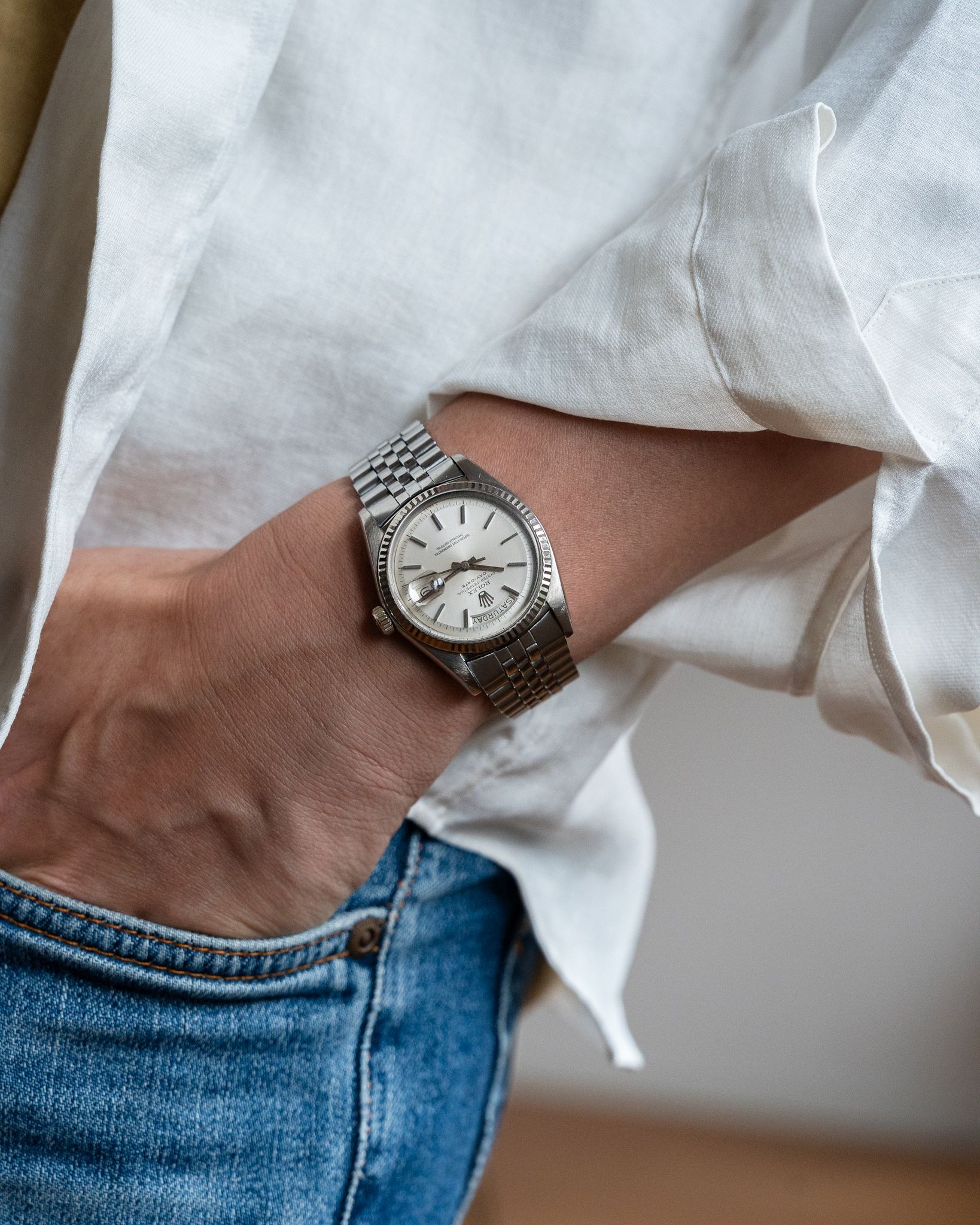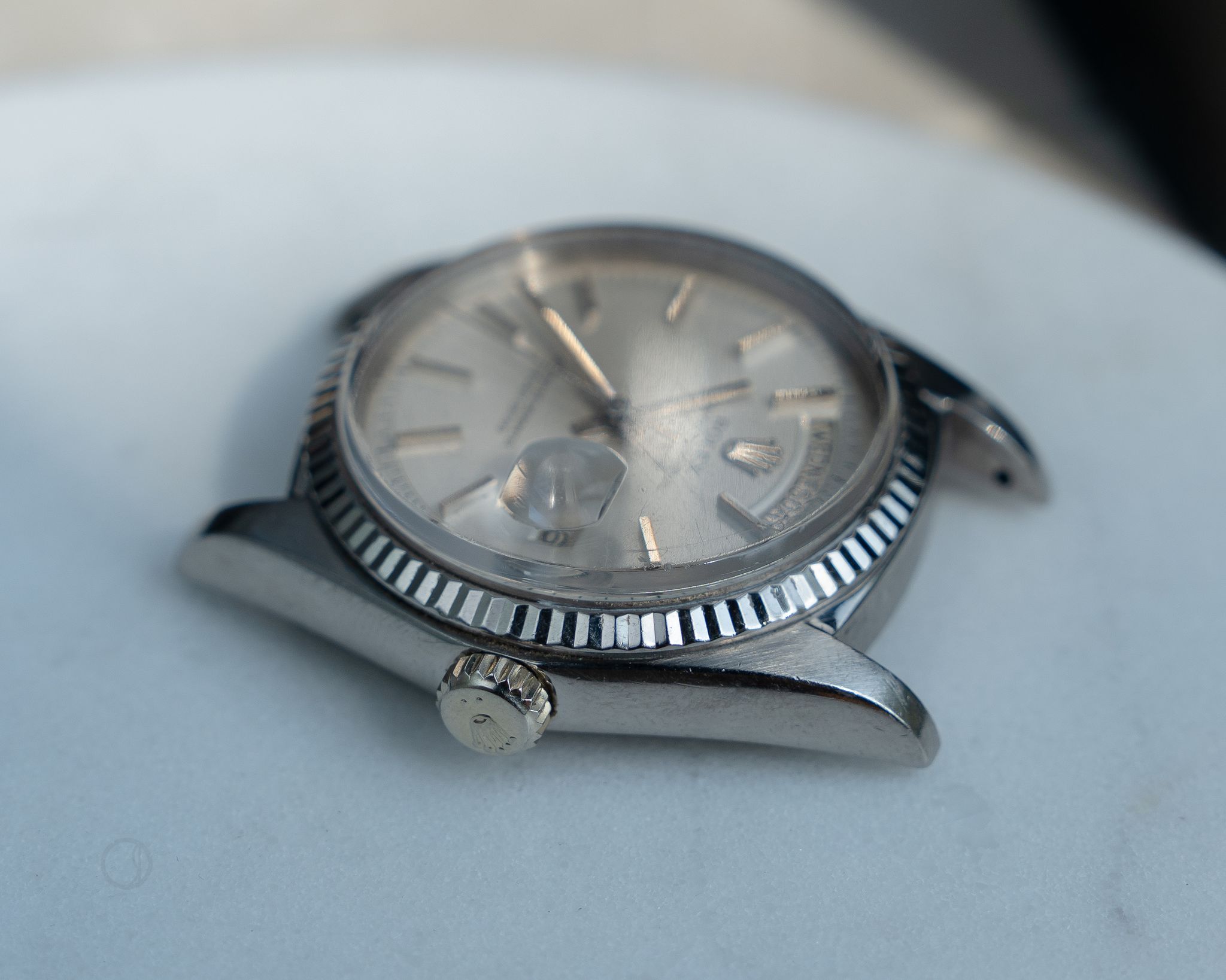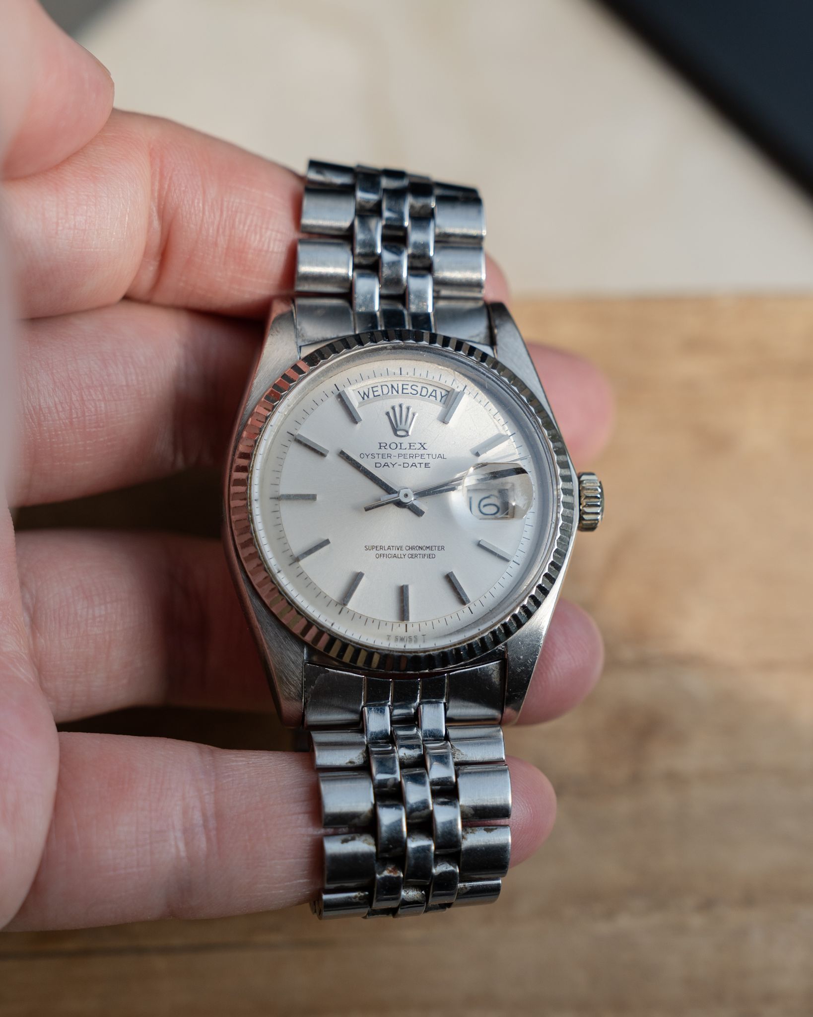The 18k white gold Day-Date Ref. 1803 was produced around 1974, based on the case serial, and remains a well-preserved vintage example. All components — including the case, crown, dial, movement, and bracelet — are signed by Rolex. The watch was last serviced in 2022 by the previous owner and is currently running at -6.3 seconds per day.