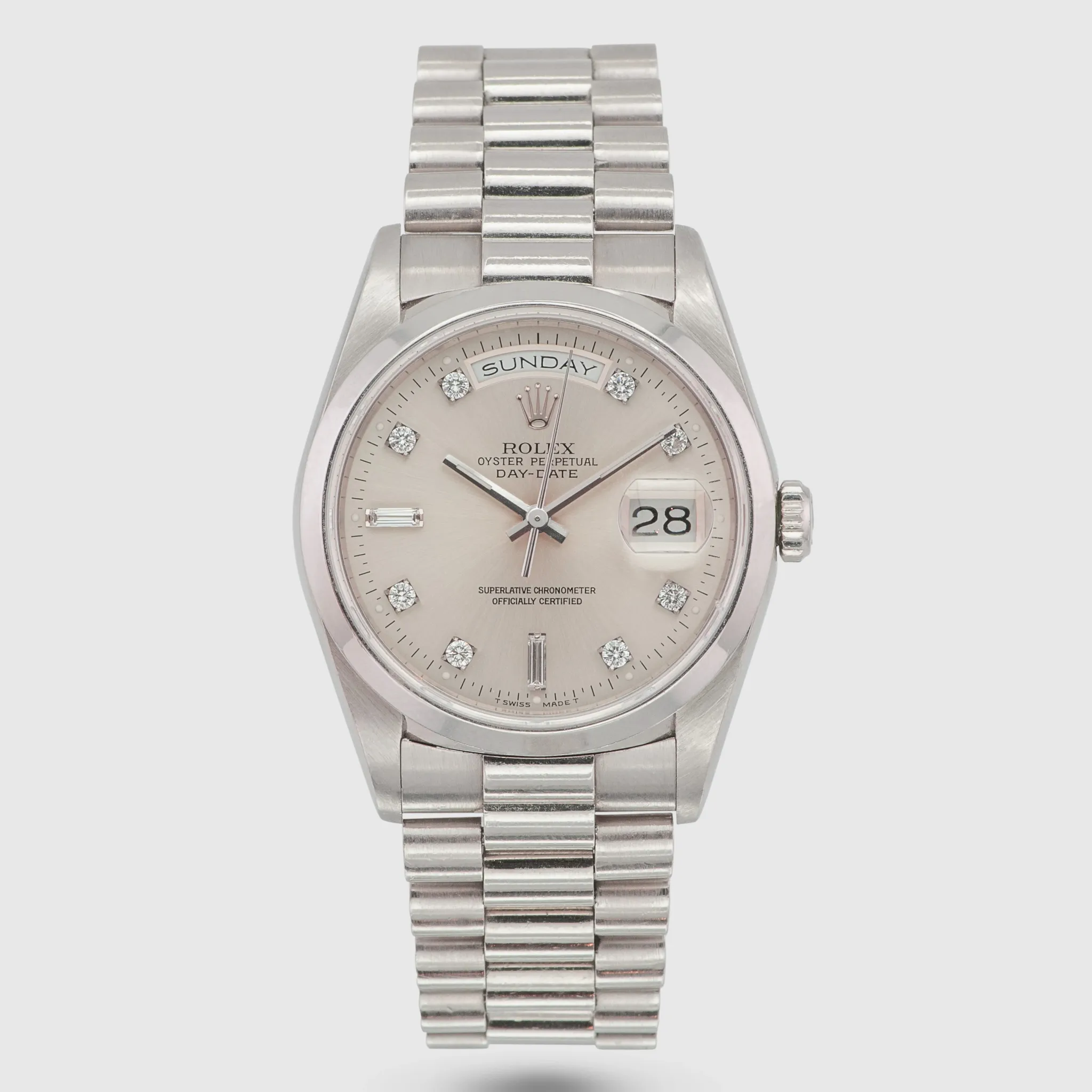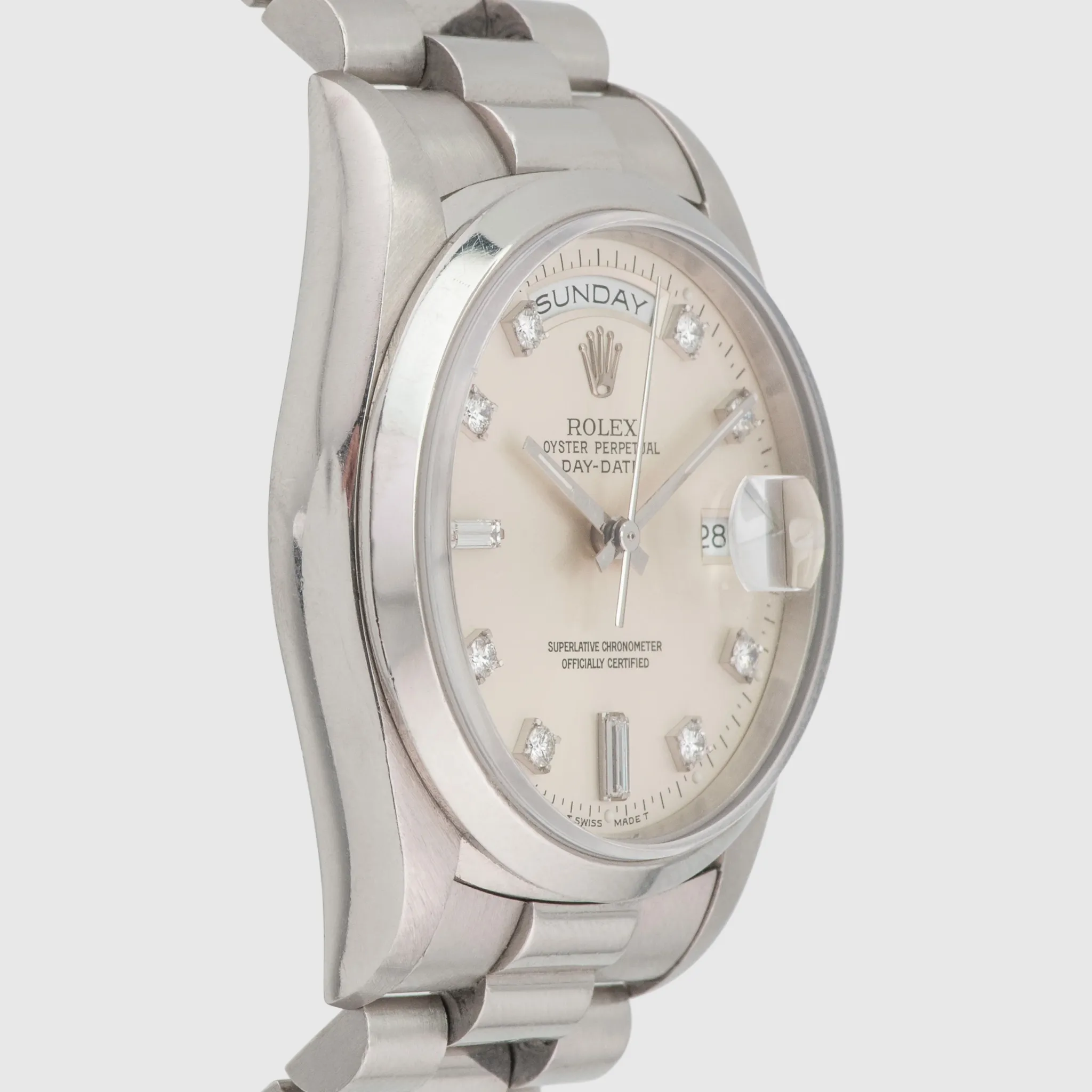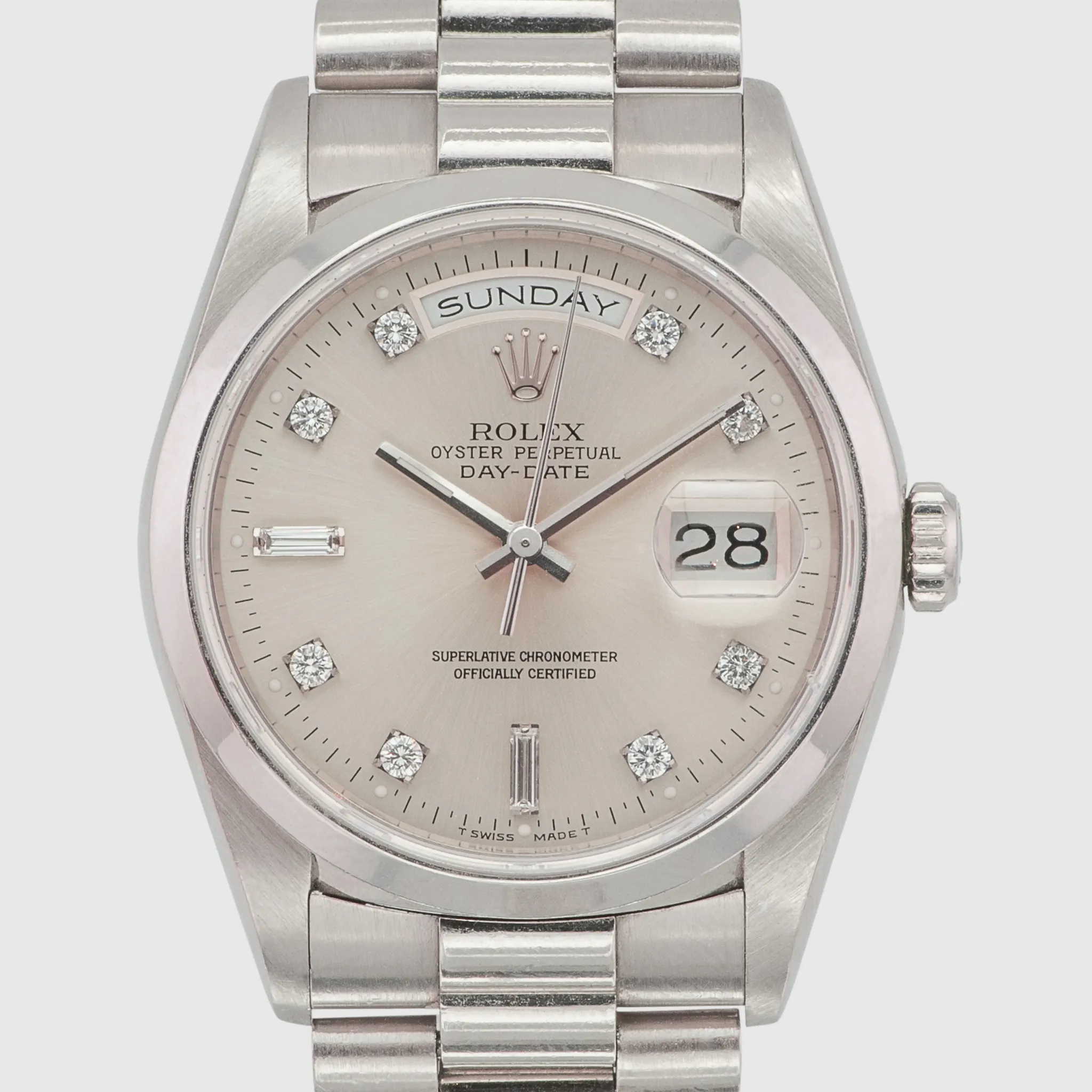This example features the smooth, domed bezel, exclusively reserved for platinum in the 182xx series. Its silver dial is adorned with noticeably larger diamonds, unique to platinum models from this era.