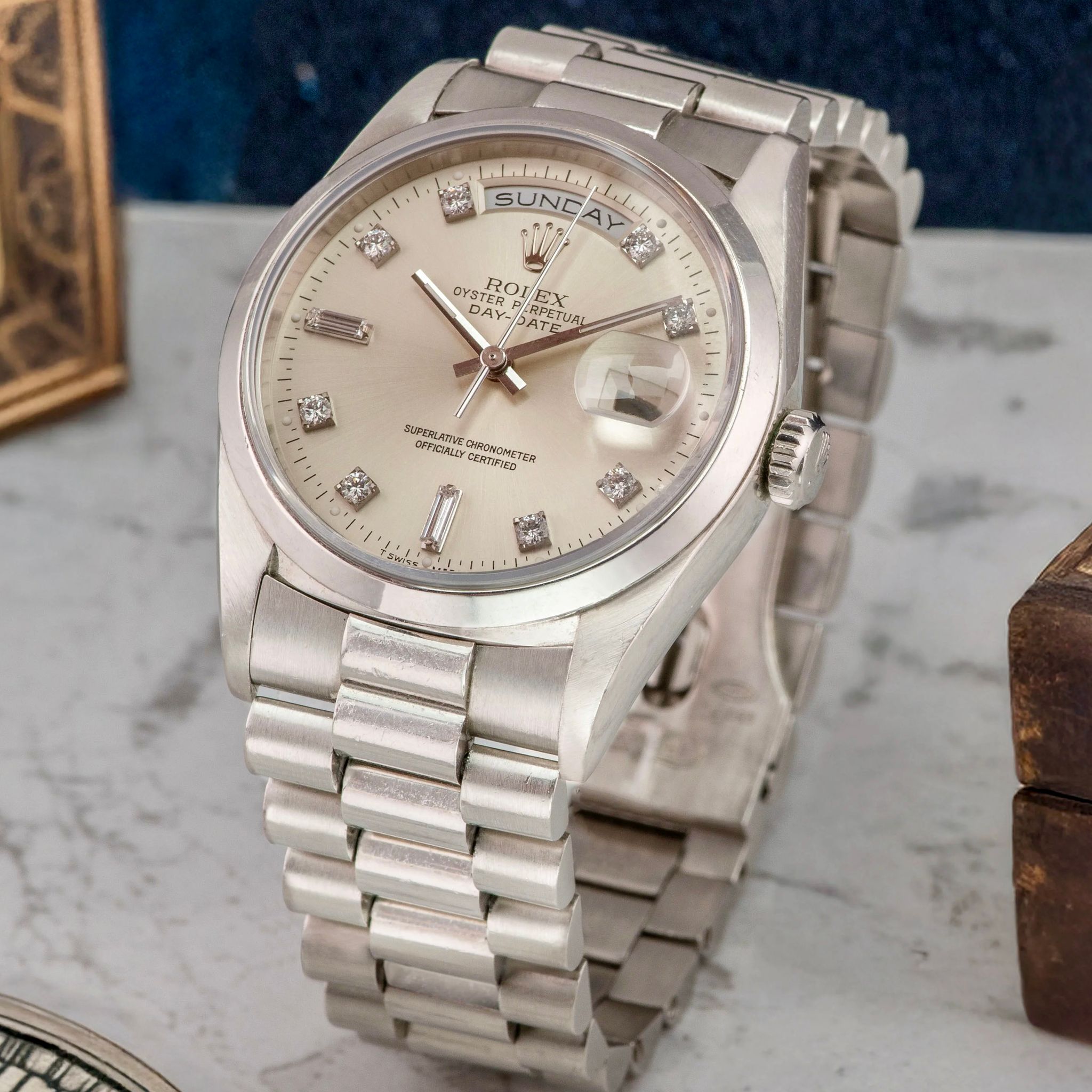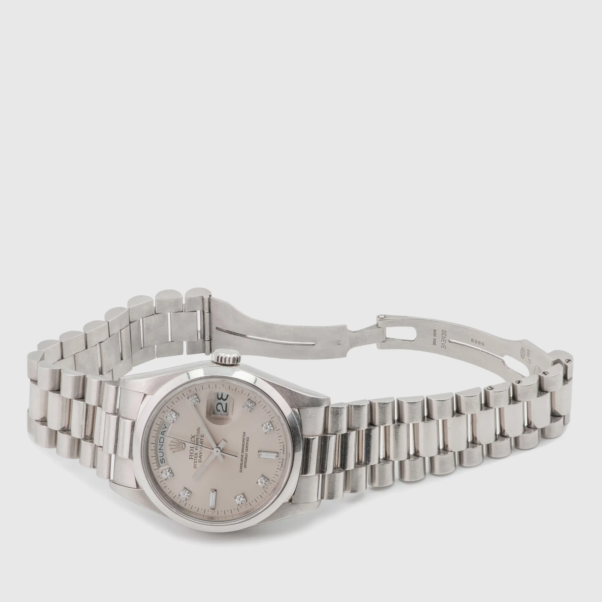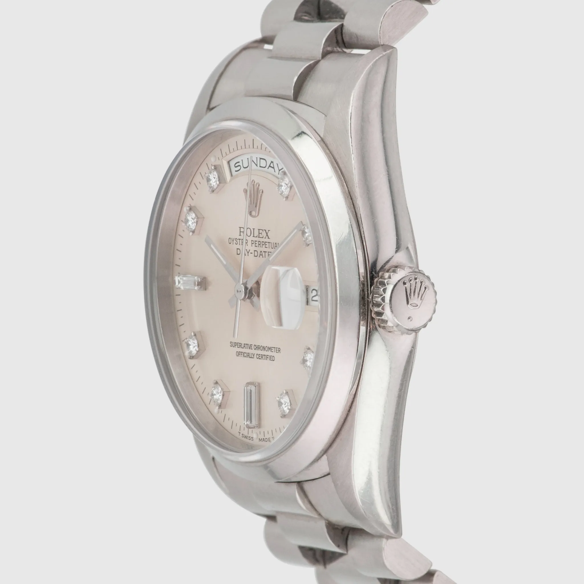 This example features the smooth, domed bezel, exclusively reserved for platinum in the 182xx series. Its silver dial is adorned with noticeably larger diamonds, unique to platinum models from this era.