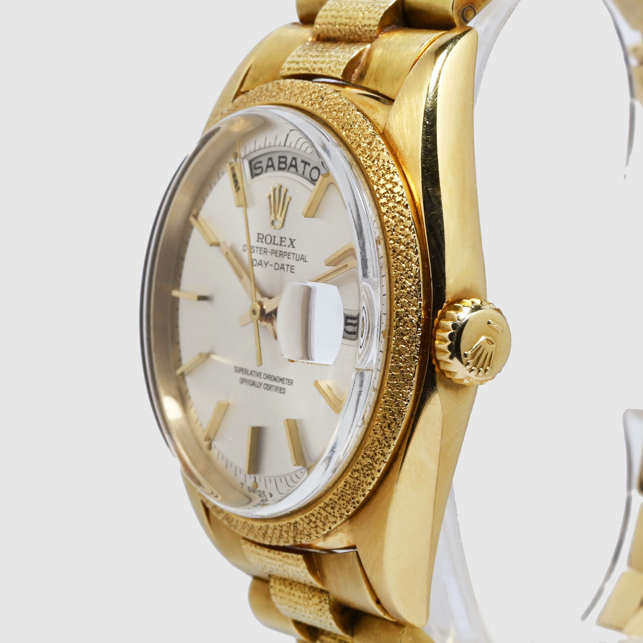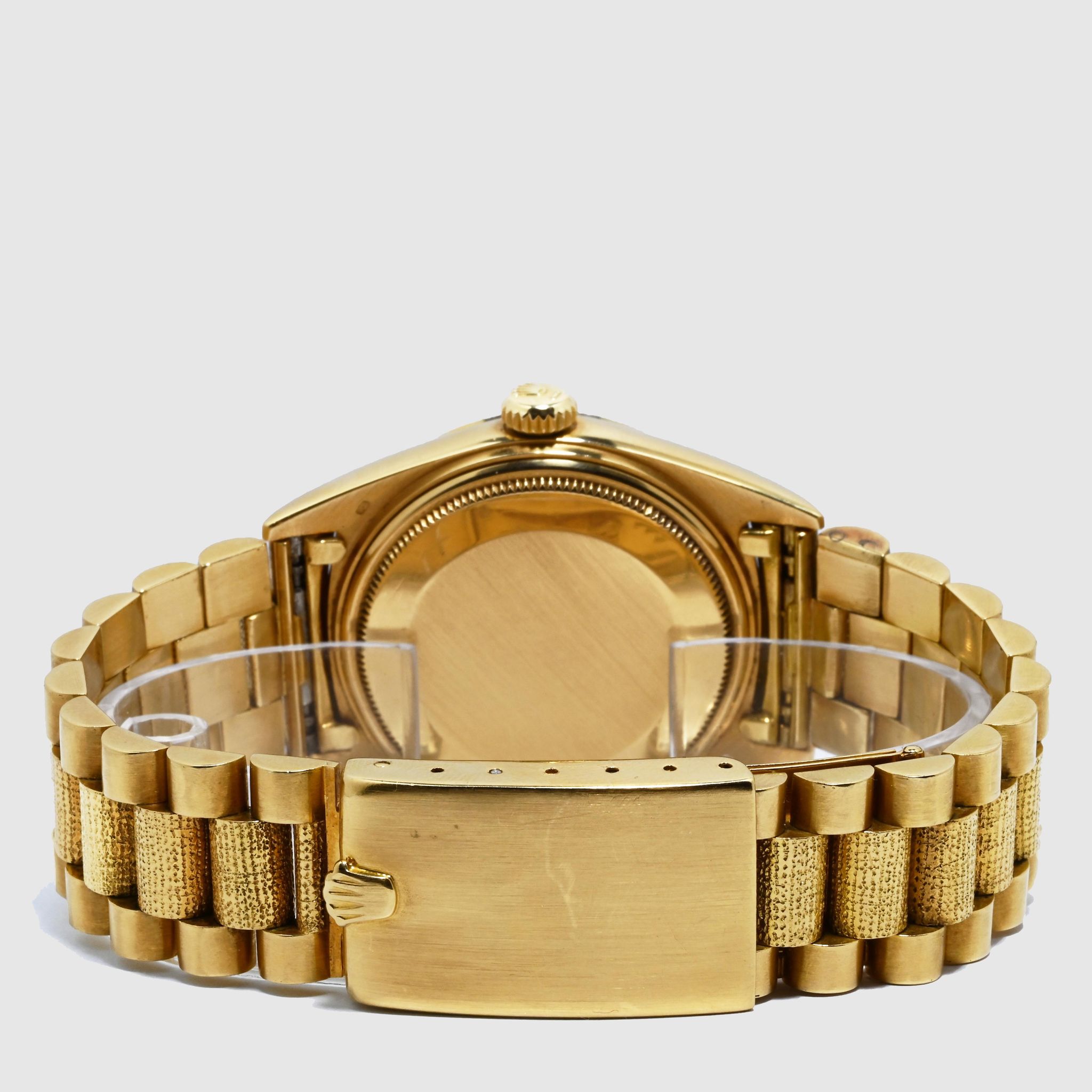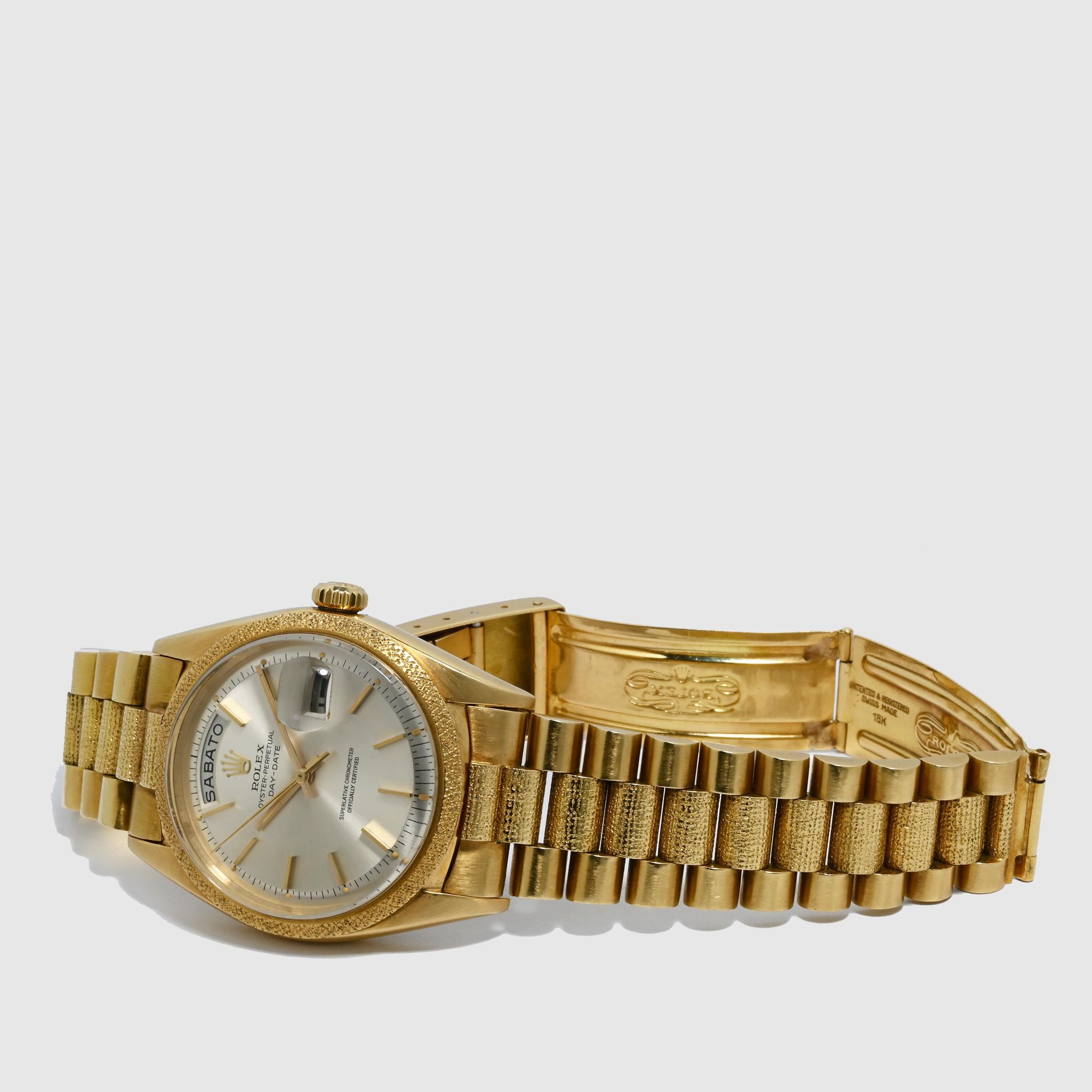 Morellis Finish - A reference 1811 might as well be described as a piece of art. Let us elaborate. This reference belongs to the family of the hand- decorated Day Dates such as 1806 (Florentine), 1807 (Bark) and the elusive 1810 (Wave). The production for these models started somewhere in the 1960s but didn't end in the same period. White the 1806, 1807 and 1811 were discontinued in the four digit plexi era, the Bark finish still continued for another two generations. Let us go back to where we started. The 1811 is defined by the 'Morellis' or 'Moiré' finish, a specialized technique that involves a meticulous hand-engraving process. Craftsmen skillfully etch intricate patterns in the form of fine dots on the bezel and bracelet center links. The fact that each watch has hand-engraved decorations, makes each example a unique piece. Given the fine patterns on the case the engravings are delicate and fade with wear and polishing. Naturally first the bracelet links fade as there is more friction from clothing hence the number of well preserved examples with intact bracelets is very very small. We have here a mint example from 1964 with matching bracelet. The Moiré finish is still well preserved and crisp on both, bezel and bracelet. The Silver dial with Baton indexes is equally in excellent condition and retains original Tritium dots and matching hands. This watch is a truly rare find and a feast for collectors of rare four digit Day Dates