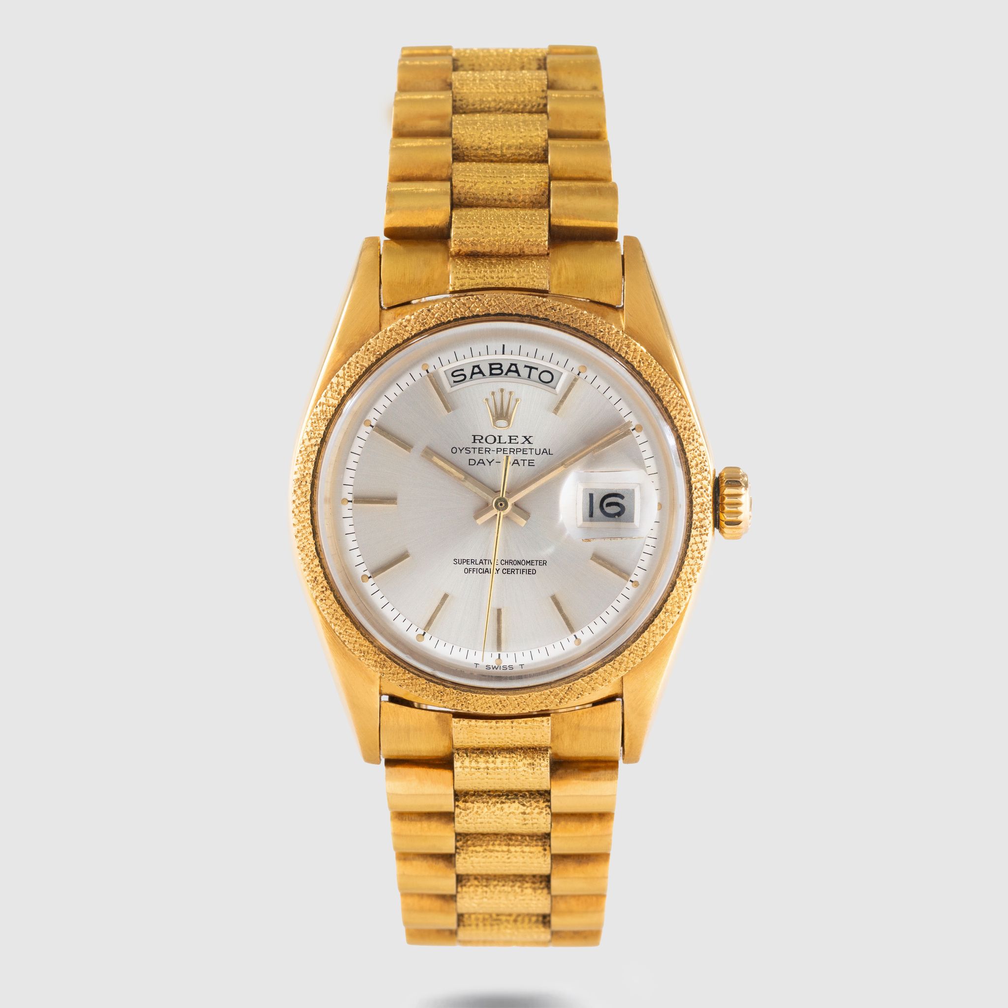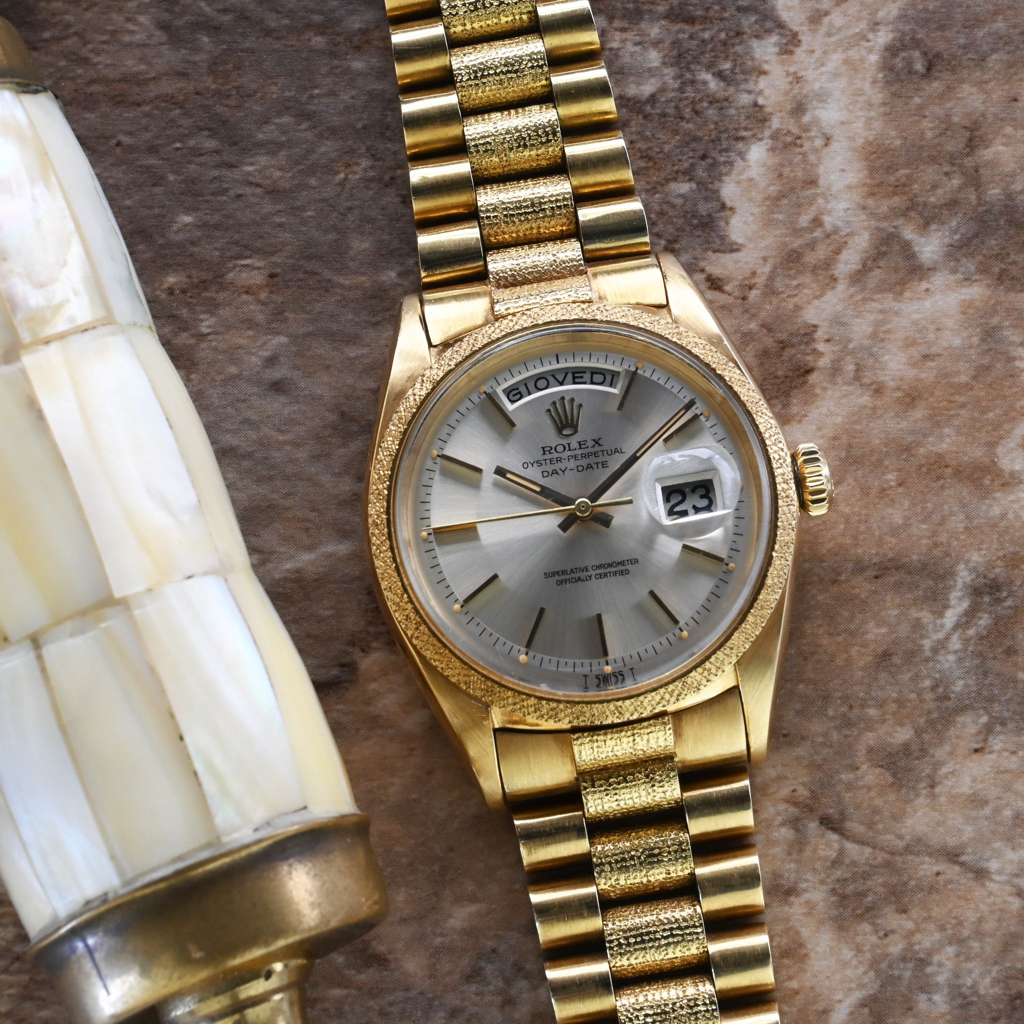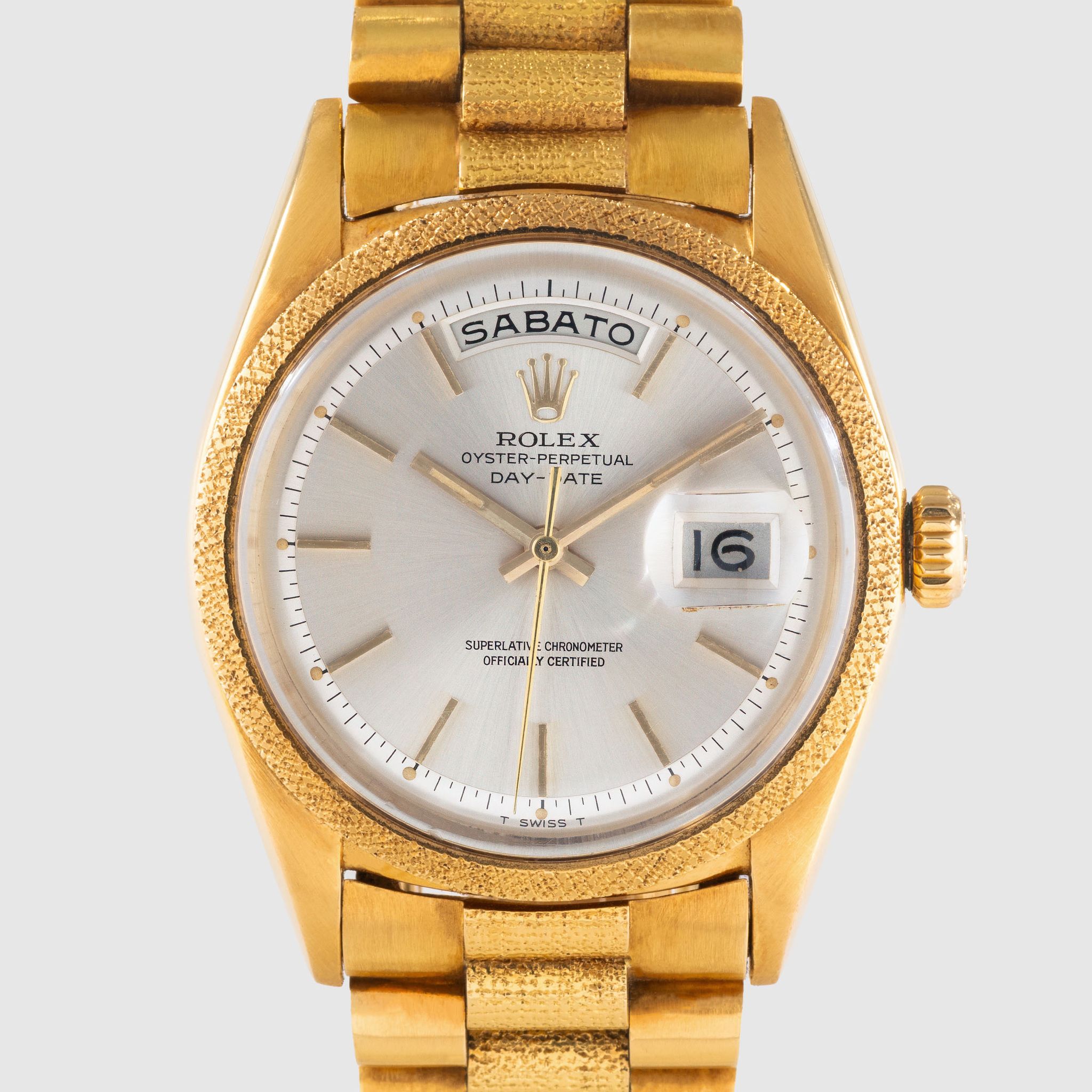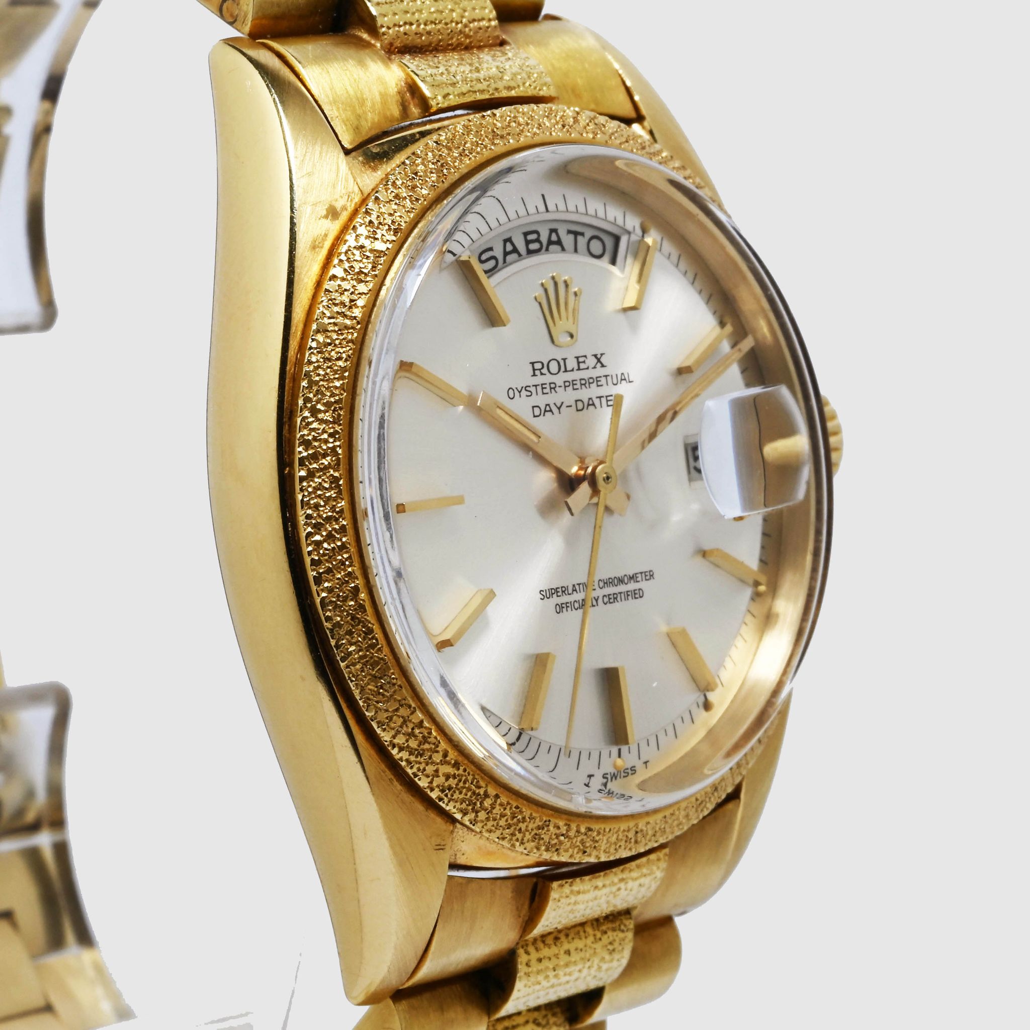 Morellis Finish - A reference 1811 might as well be described as a piece of art. Let us elaborate. This reference belongs to the family of the hand- decorated Day Dates such as 1806 (Florentine), 1807 (Bark) and the elusive 1810 (Wave). The production for these models started somewhere in the 1960s but didn't end in the same period. White the 1806, 1807 and 1811 were discontinued in the four digit plexi era, the Bark finish still continued for another two generations. Let us go back to where we started. The 1811 is defined by the 'Morellis' or 'Moiré' finish, a specialized technique that involves a meticulous hand-engraving process. Craftsmen skillfully etch intricate patterns in the form of fine dots on the bezel and bracelet center links. The fact that each watch has hand-engraved decorations, makes each example a unique piece. Given the fine patterns on the case the engravings are delicate and fade with wear and polishing. Naturally first the bracelet links fade as there is more friction from clothing hence the number of well preserved examples with intact bracelets is very very small. We have here a mint example from 1964 with matching bracelet. The Moiré finish is still well preserved and crisp on both, bezel and bracelet. The Silver dial with Baton indexes is equally in excellent condition and retains original Tritium dots and matching hands. This watch is a truly rare find and a feast for collectors of rare four digit Day Dates