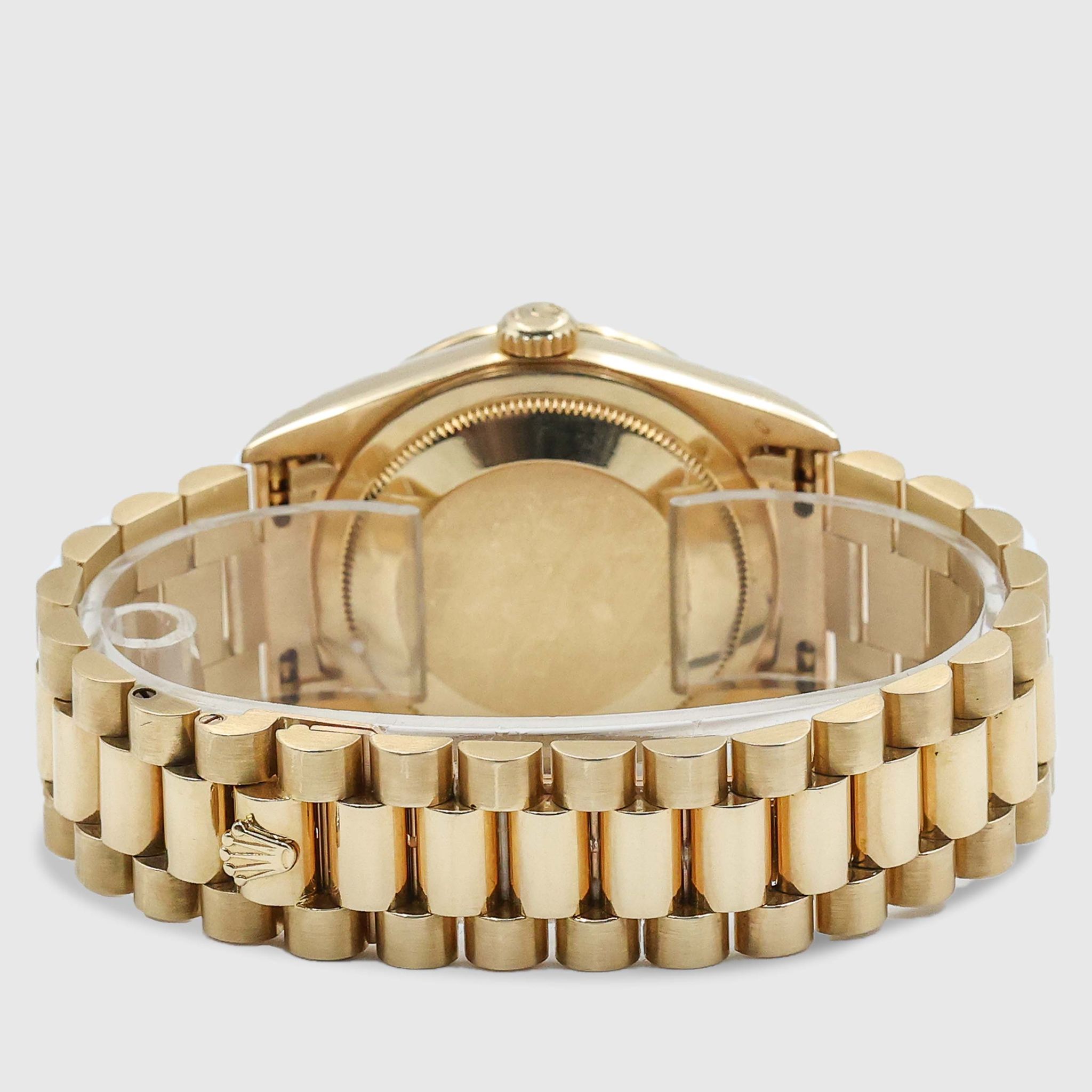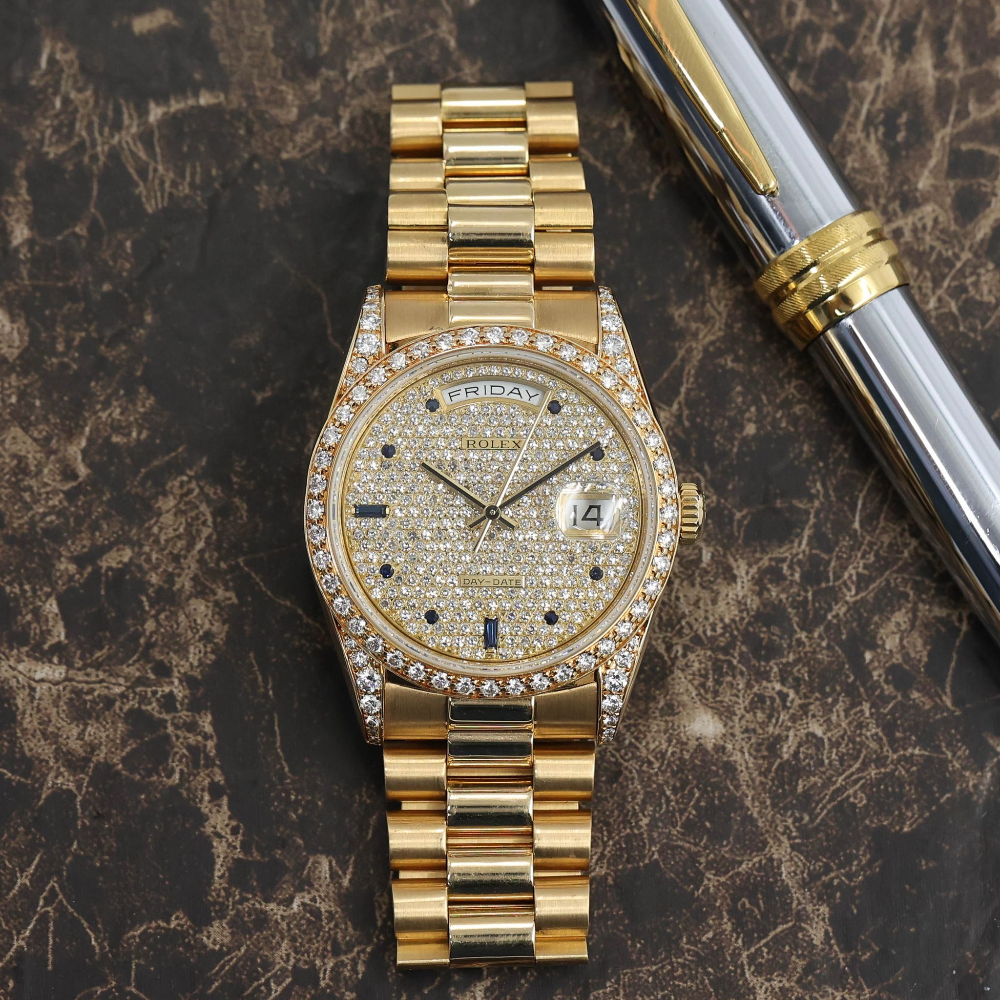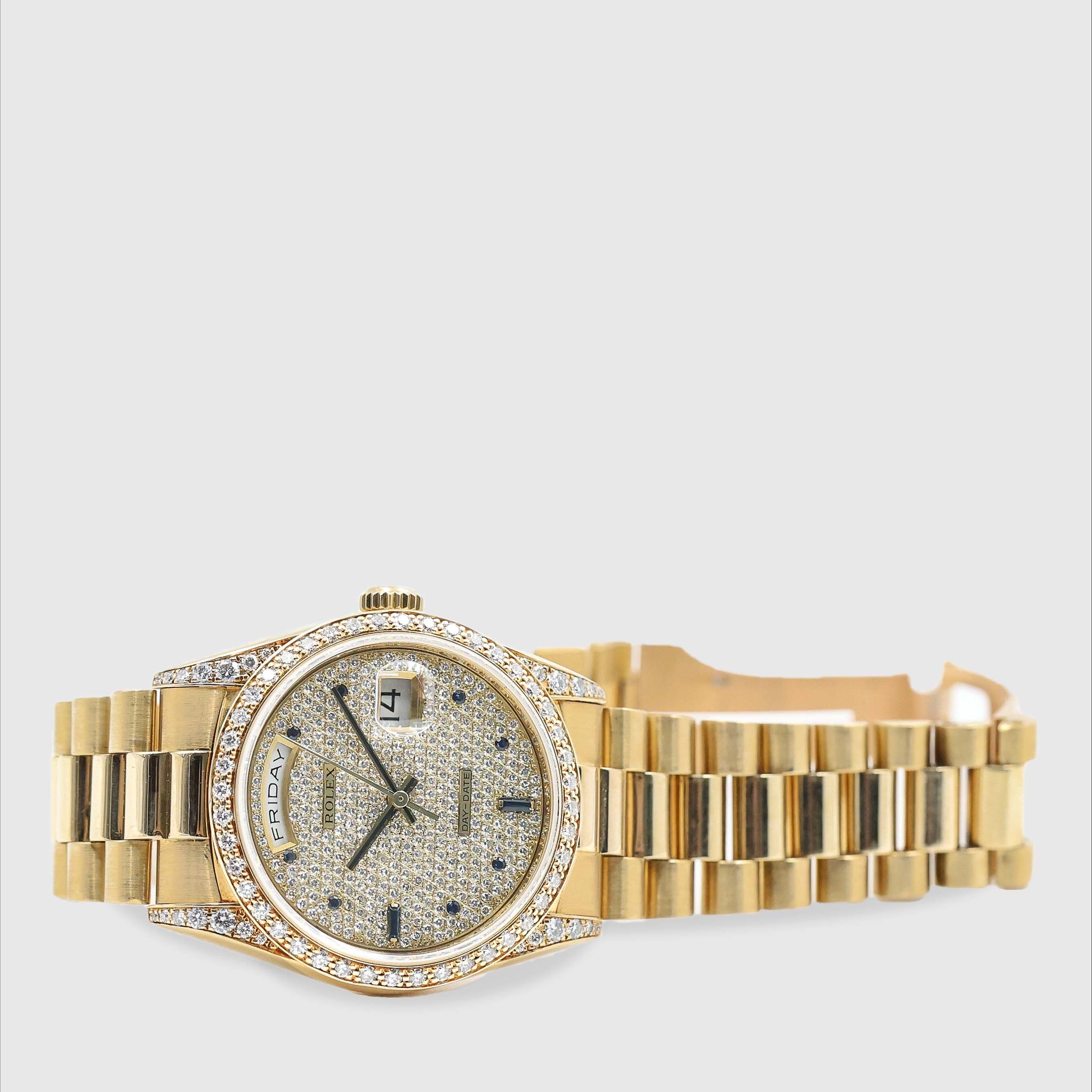 Diamonds & Sapphires - Here's a very glamorous Day Date 18388 in yellow gold. With factory diamond setting on the bezel as well as on the lugs. The watch features a beautiful Pavee dial with Sapphire markers and matching hands. The watch looks absolute fantastic and though it has a Pavee dial it is not overloaded. Worth mentioning here is that these special dials don't carry a huge premium and are amazing value for the money. Its here, retained in beautiful condition and waiting for someone that wants to increase the glamour level.