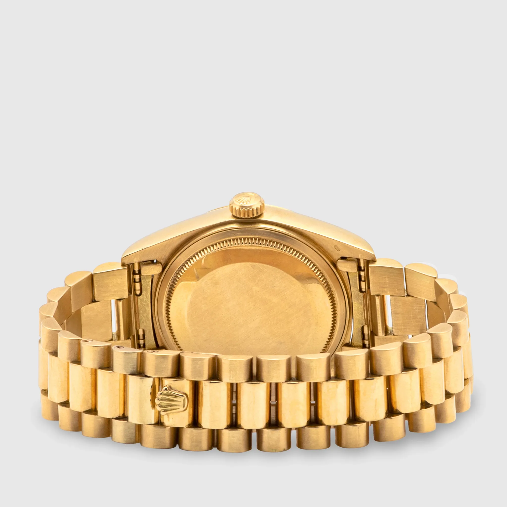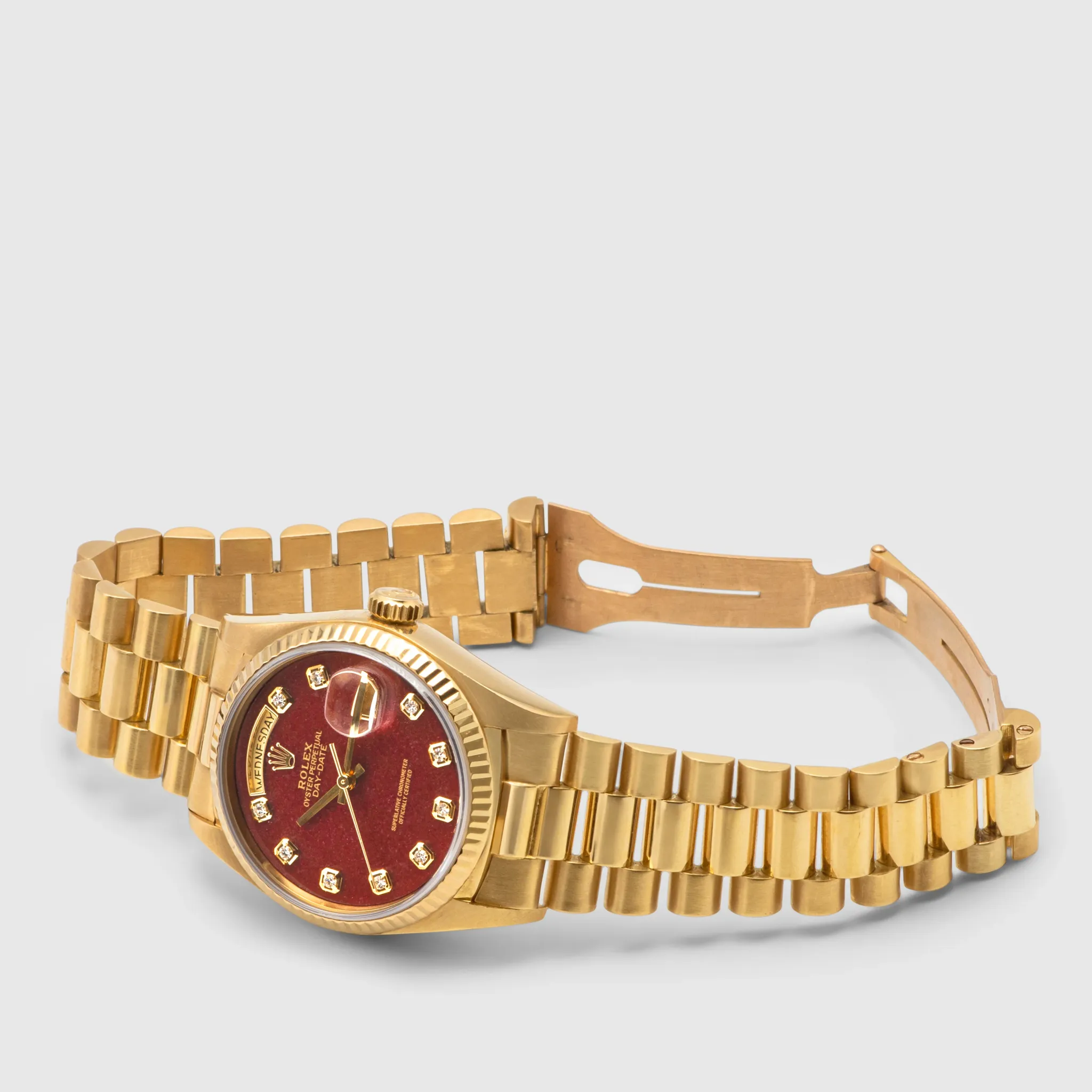 We have here a Rolex Day Date 18038 from the late 1980s housing the Rubellite dial. The color of the dial beautifully complements the gold color of the watch giving it a very royal look.