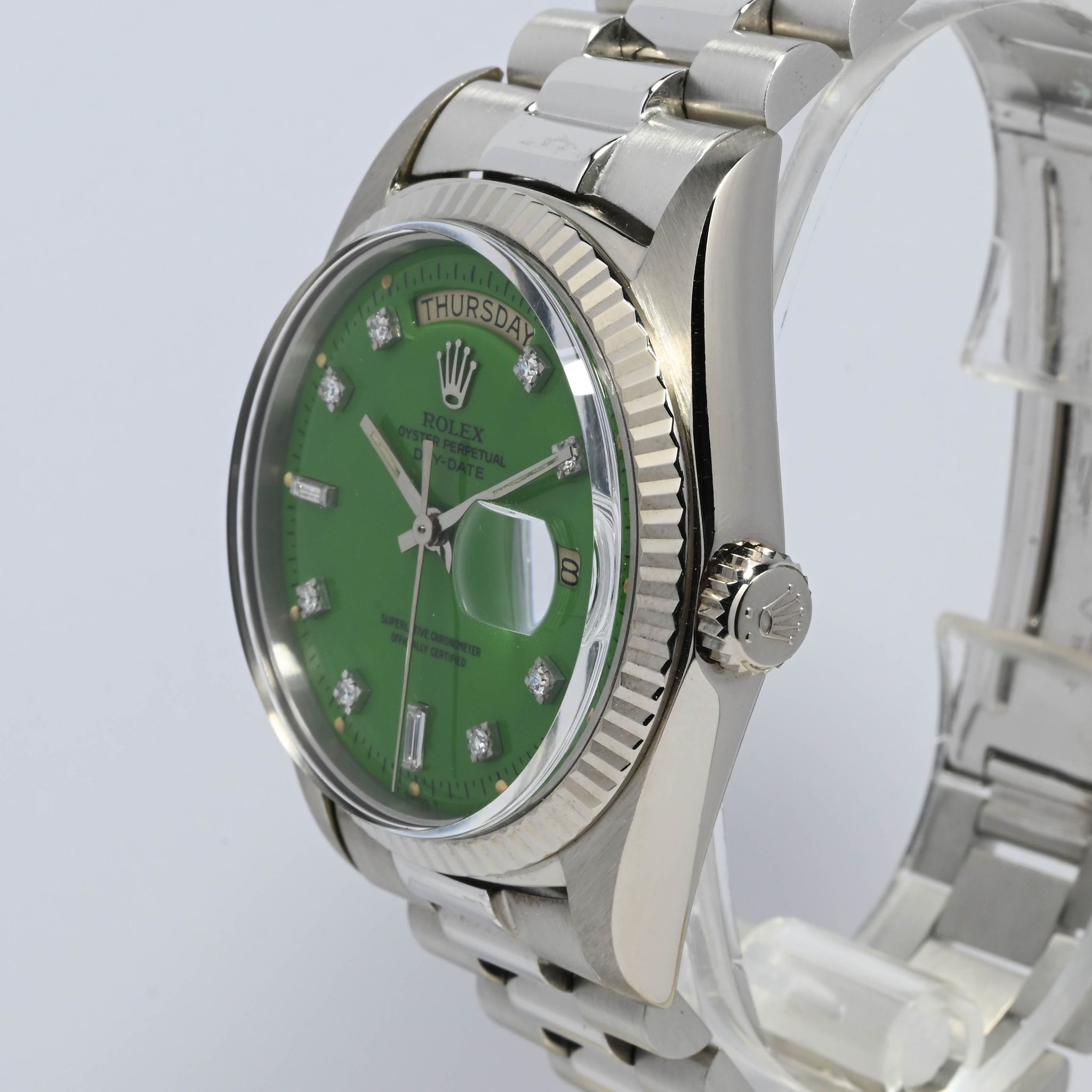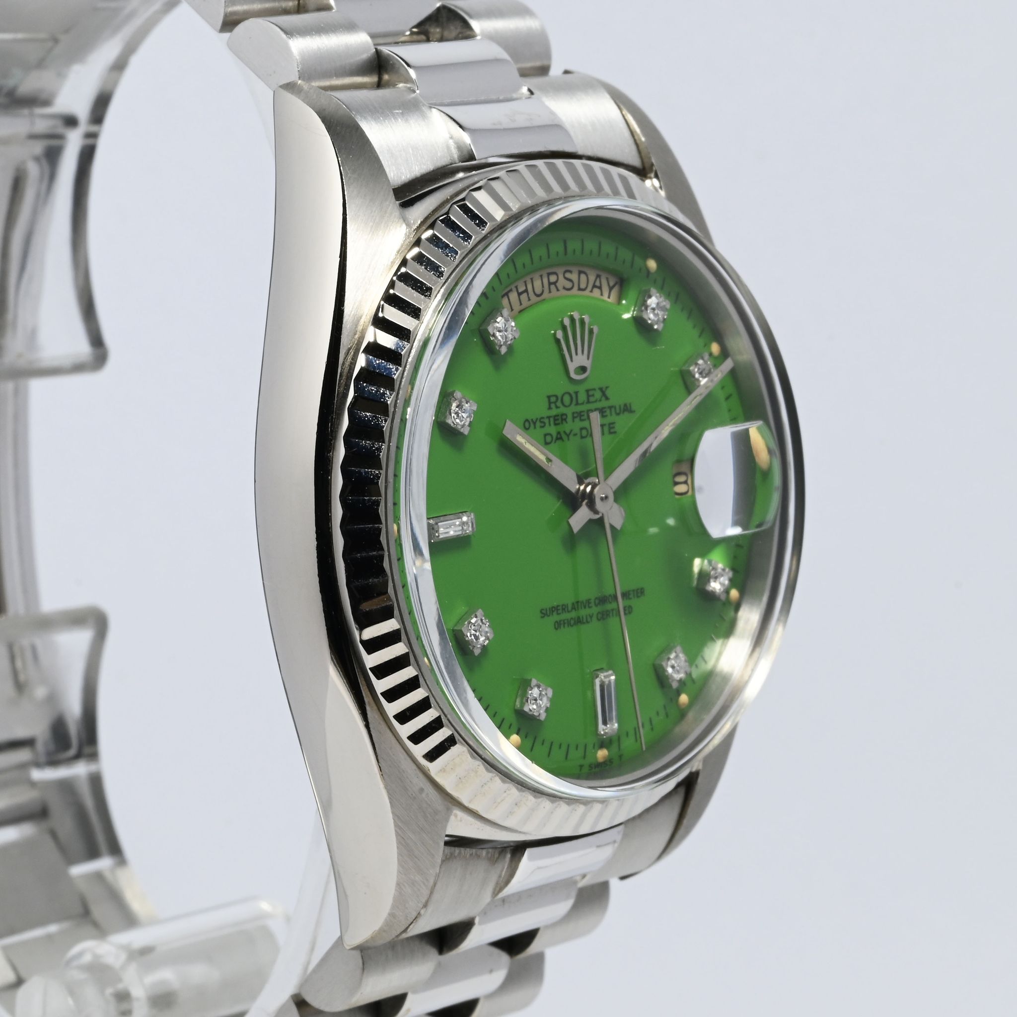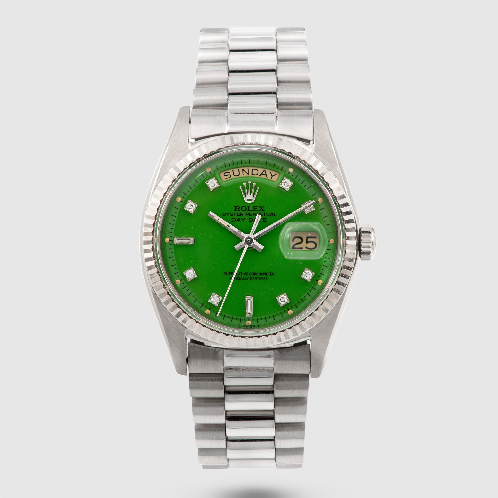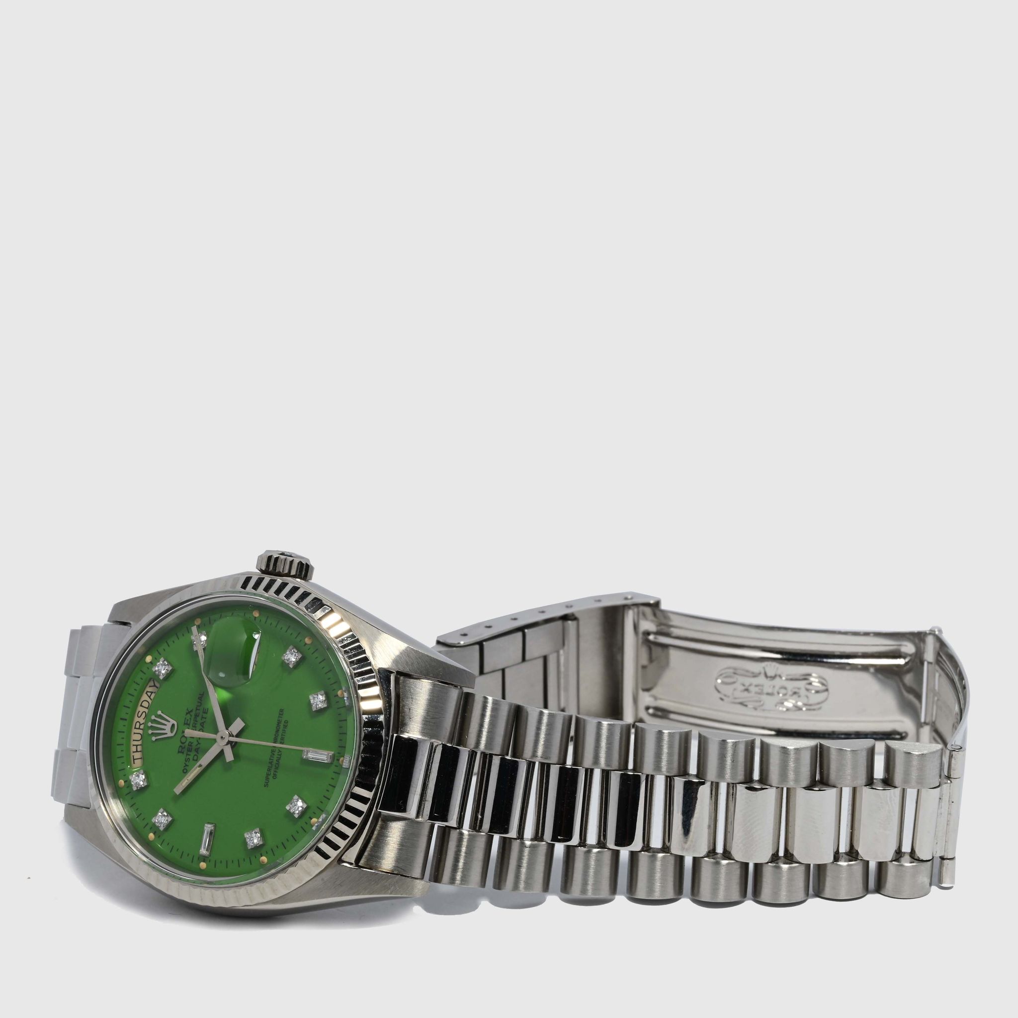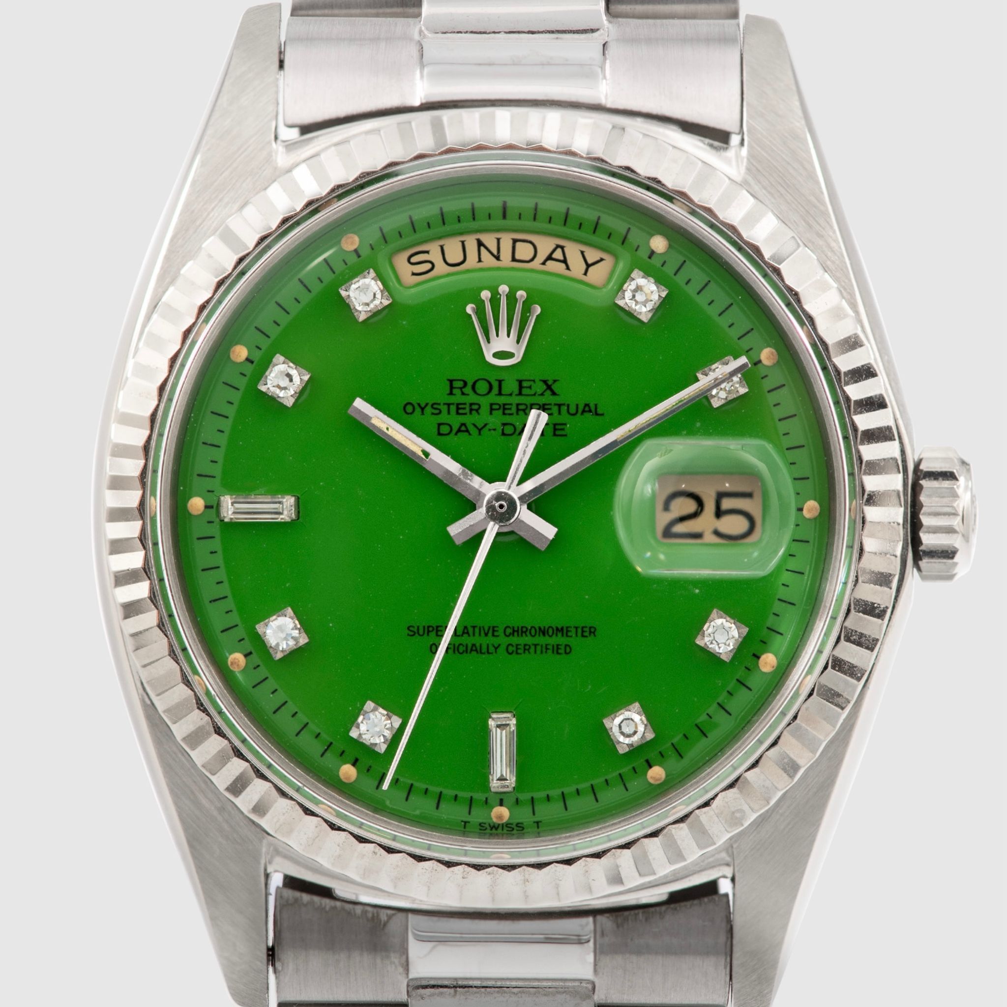 Grasshopper - This phenomenal Rolex Day Date 1803 from 1971 is just uber cool. The white gold case is strong, retaining straight and well defined lugs and doesn't show much wear from age over the last 48 years. The grass green Stella dial is well extremely preserved and shows a beautiful glossy surface set with 8 diamond- and 2 baguette markers. The color is very vibrant, stands in great contrast with the white gold case and diamonds. Even though this color looks great on yellow gold it just pops on white gold. The tone of the green varies depending on lighting, under direct sunlight we can see a beautiful and vibrant lime green. When assessing the rarity and value of Stella dials, there are two main drivers, one is the color of the dial and one is the metal of the watch the dial is cased in. Assuming that approximately 70% of all Day Dates are produced in Yellow gold, we can only imagine how few examples in white metals have been produced. As a consequence it is safe to say that special dials for white gold are rare and in the case of Stella dials, extremely rare.
