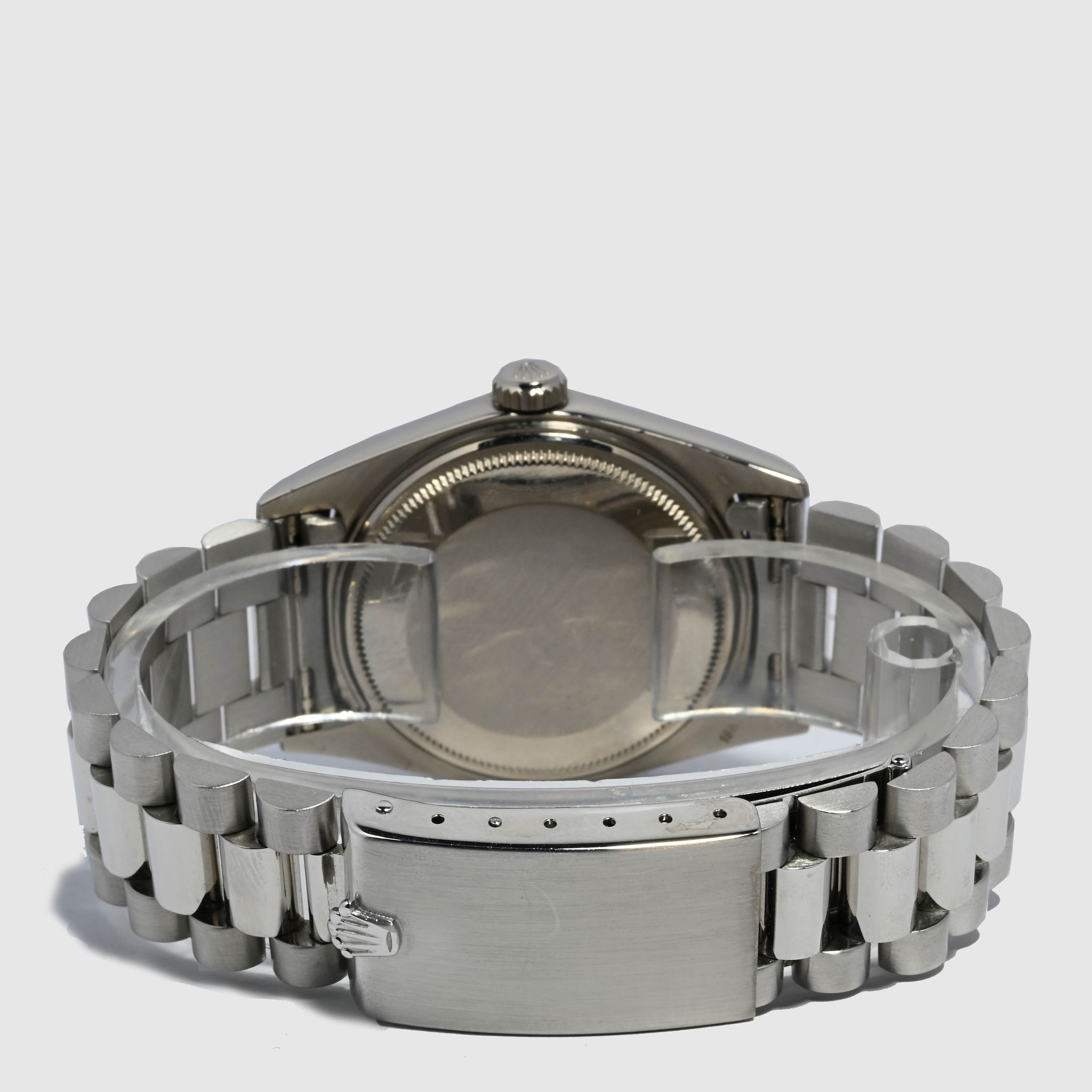 Bracelet / Strap: Excellent matching 18k White gold President bracelet with long clasp showing very light wear from age.