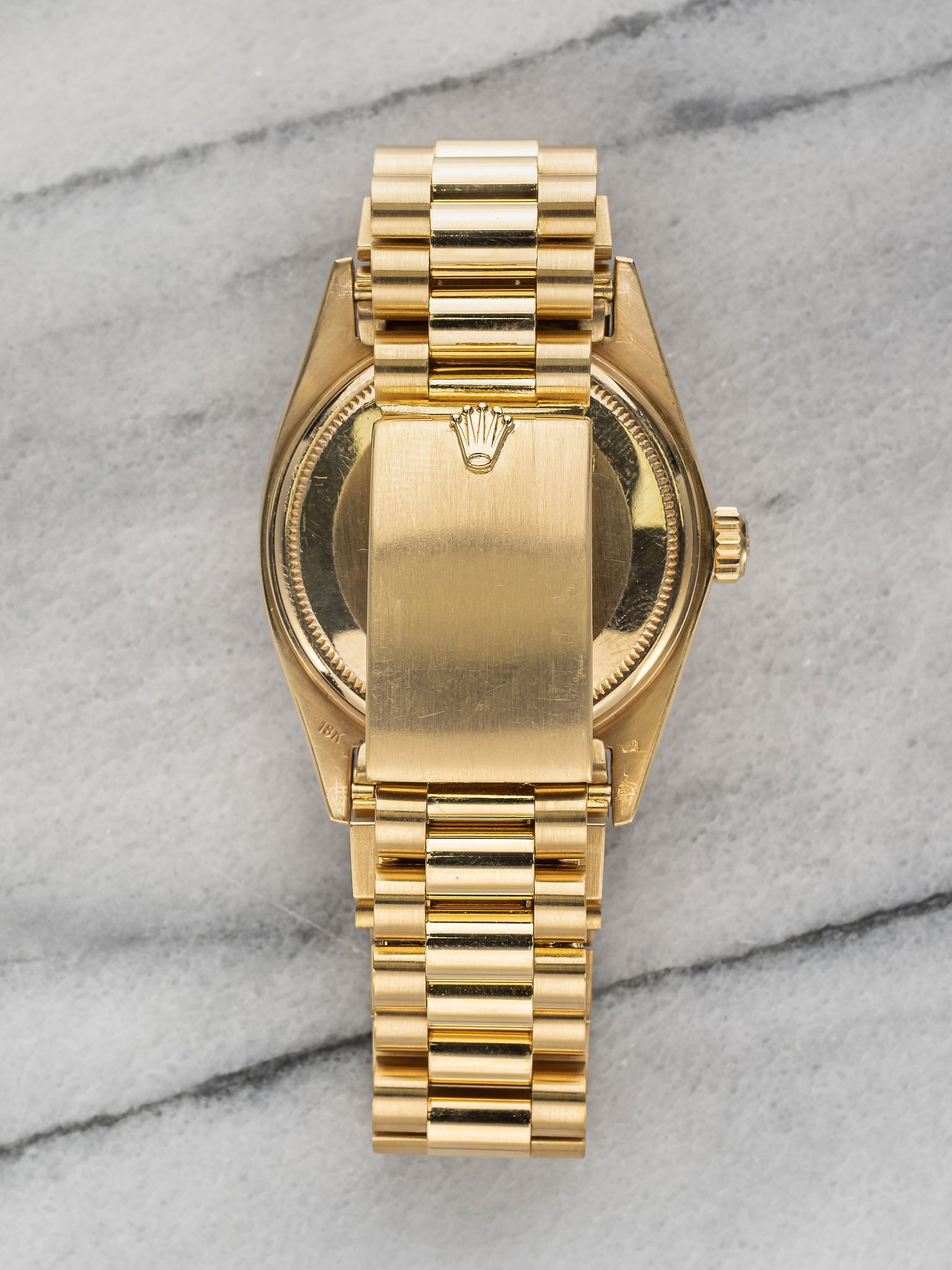 Here's a vintage Rolex Day Date reference 1803 automatic (non-quick) with a champagne sunburst dial in 18K yellow gold from the 1970s. Measurements include a 36mm case, 20mm lug width, and bracelet that fits up to a 7.5 inch wrist. great condition on the lugs and case. The bezel, case, and bracelet also developed a distinctive purple color due to age. All parts, including the crown, dial, movement, and caseback are original.