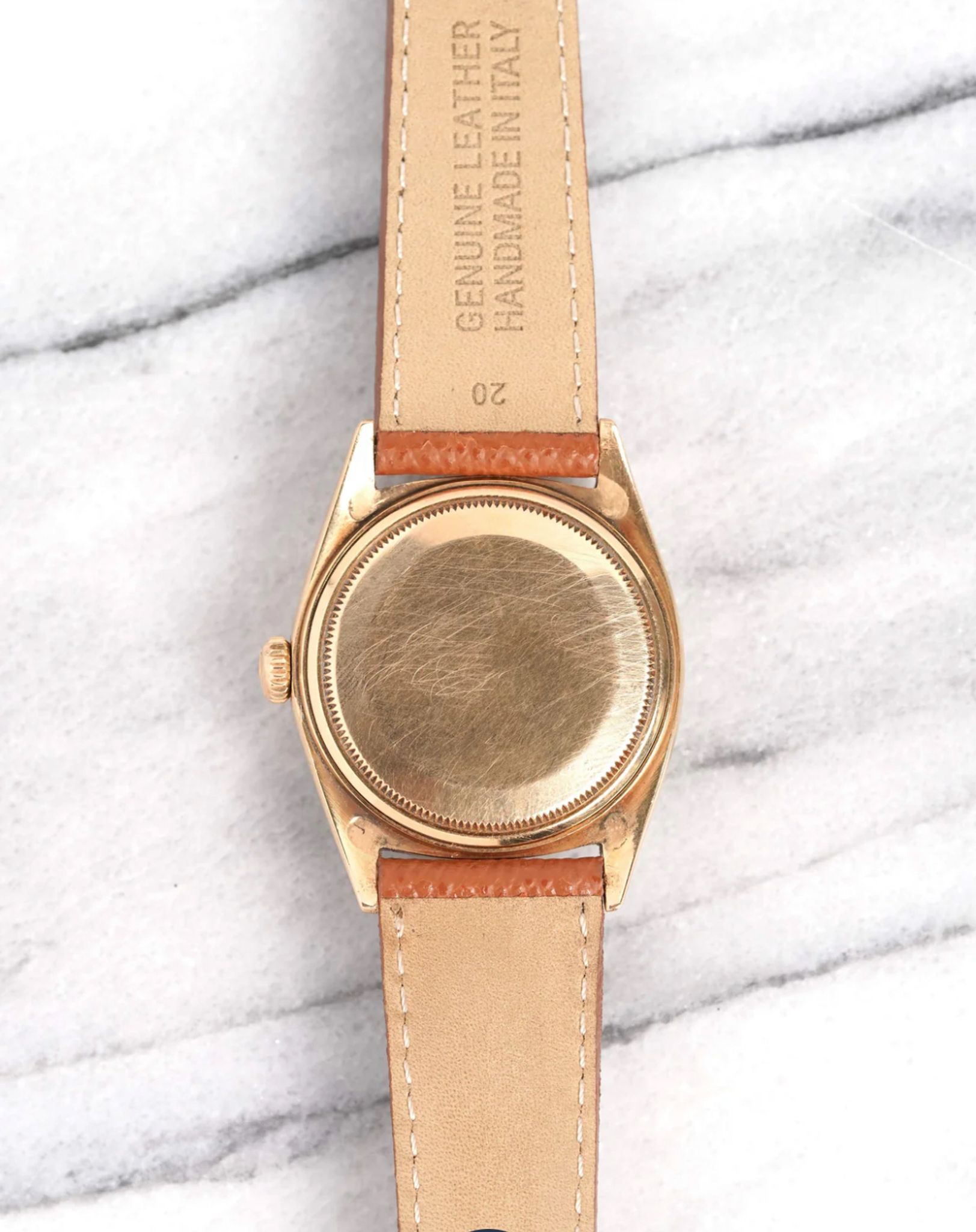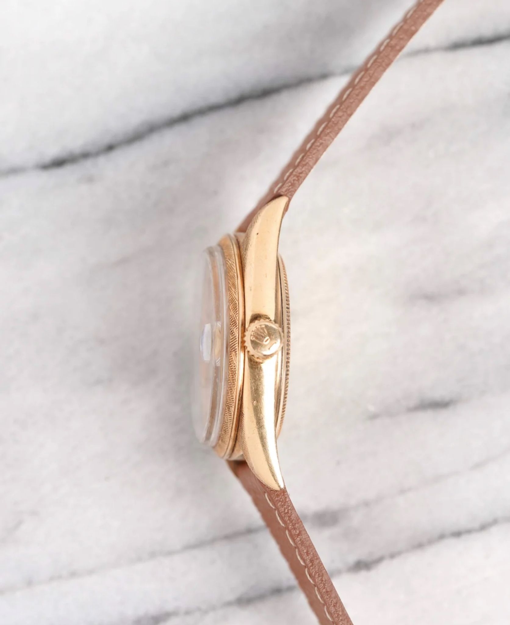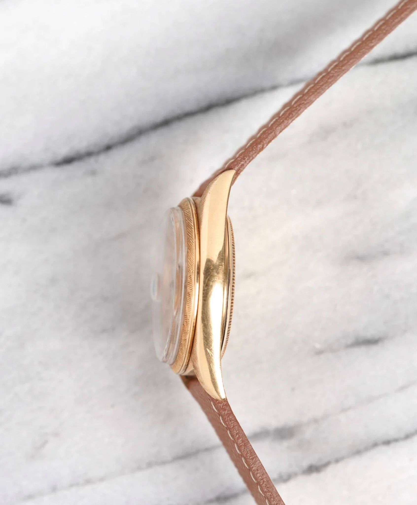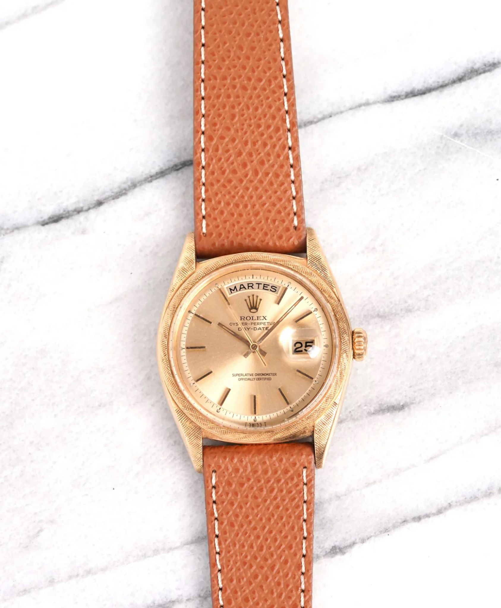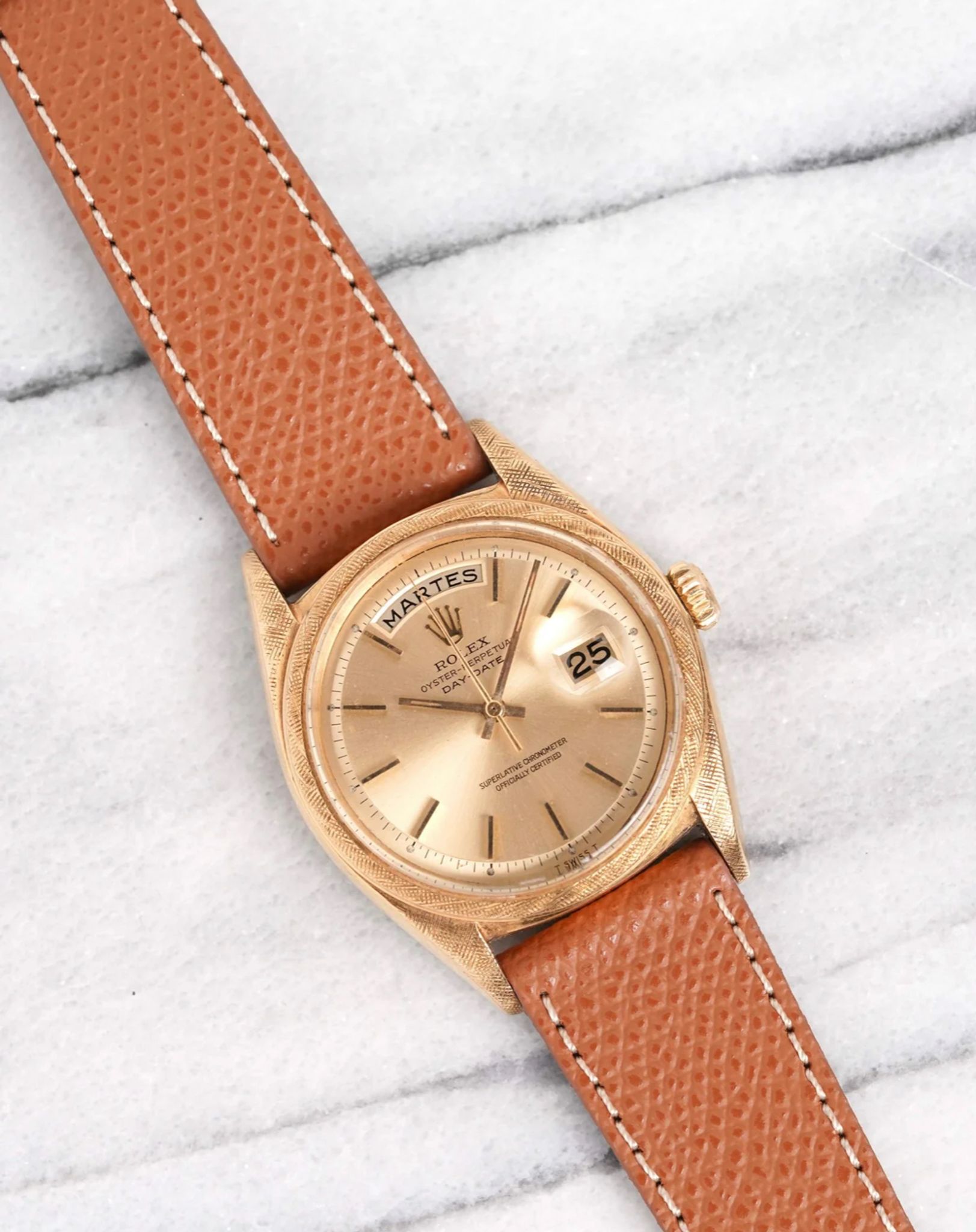 Here’s a vintage Rolex Day Date reference 1806 (Florentine finish on both the bezel and case) from the early 60s in 18k yellow gold with a beautiful Champagne Dial with no flaws. Keeps great time and is fully functional. Measurements of the case is 36mm and 20mm lug width. It's on a handmade Italian brown pebble leather strap with the matching 18k yellow-gold Rolex clasp. 18K yellow gold case and casebook. Both the dial and crystal are free from any scratches. Drilled lug holes. Very unique finish on the bezel and case. All parts are original including the dial, crown, movement, and caseback. Both the dial and case are in great cosmetic, untouched condition.