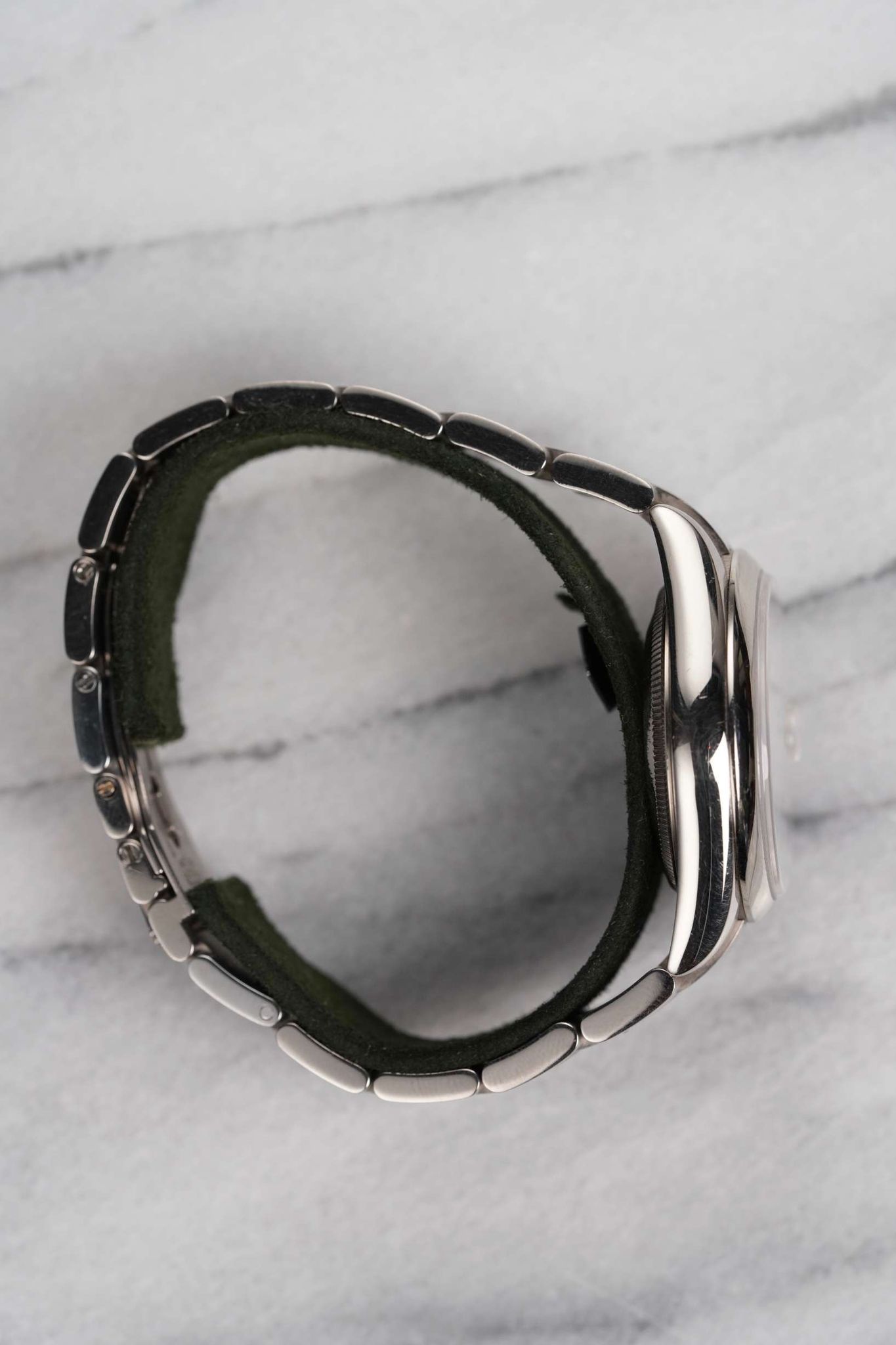 Here's a vintage Daydate reference 118209 (smooth bezel) with a pink havanna roman numeral dial from 2000 (P serial). Has a Hebrew disk at 12 a clock. Comes with its original box and papers. Keeps great time and is fully functional. Measurements include a 36mm oyster case and 20mm lug width. It's on an original oyster bracelet that fits up to a 7.25 inch wrist. Features include the quickset date function at 3 a clock and quickset function 12 a clock. Swiss Made dial. No lume dial. This is an oddball example with the combination between the Hebrew disk and the white gold oyster bracelet. Both the dial and crystal are free from any scratches or marks. Stainless steel case and caseback. All parts are original including the signed Rolex crown, case back, dial, and movement. The dial and case are in great cosmetic, untouched condition.