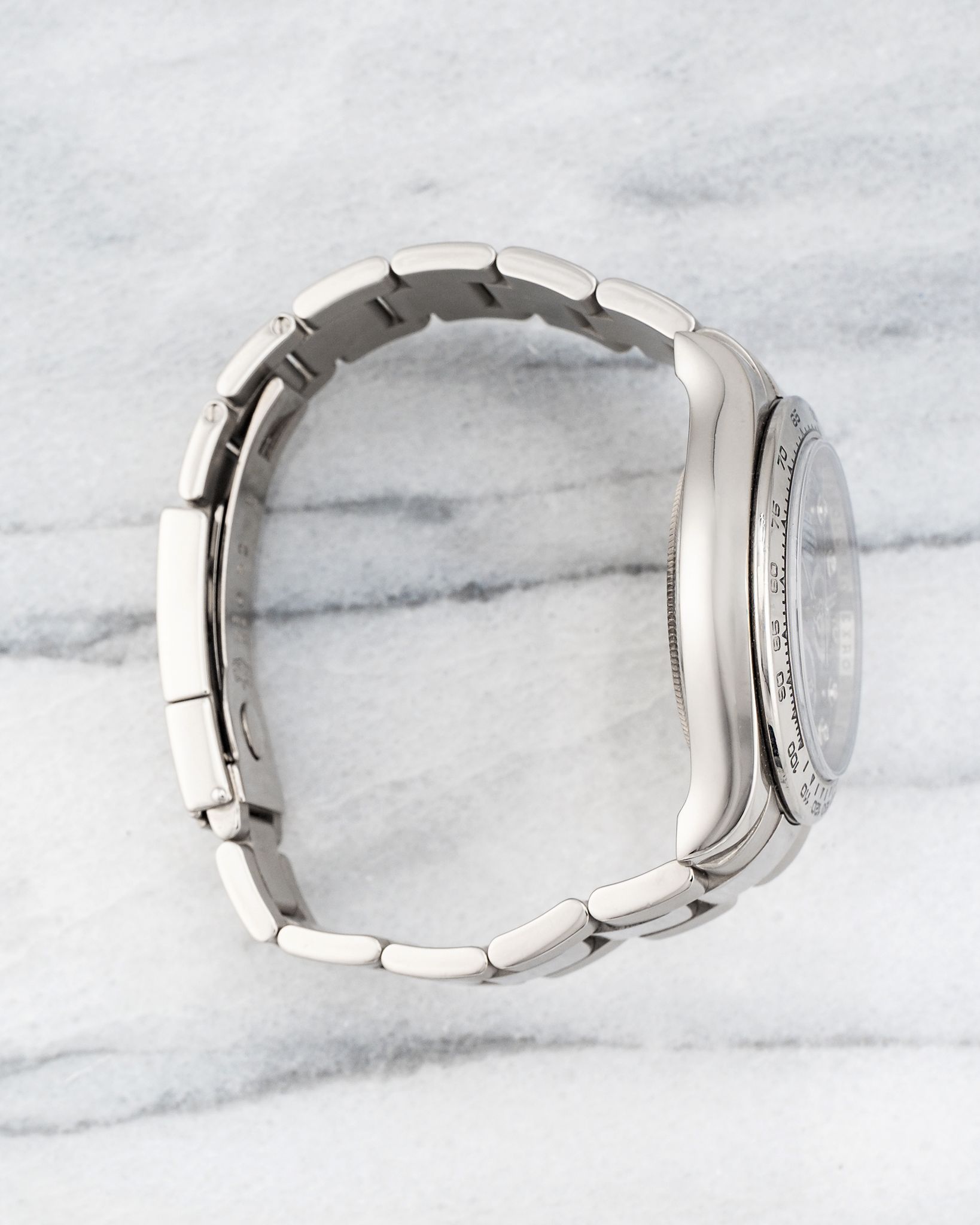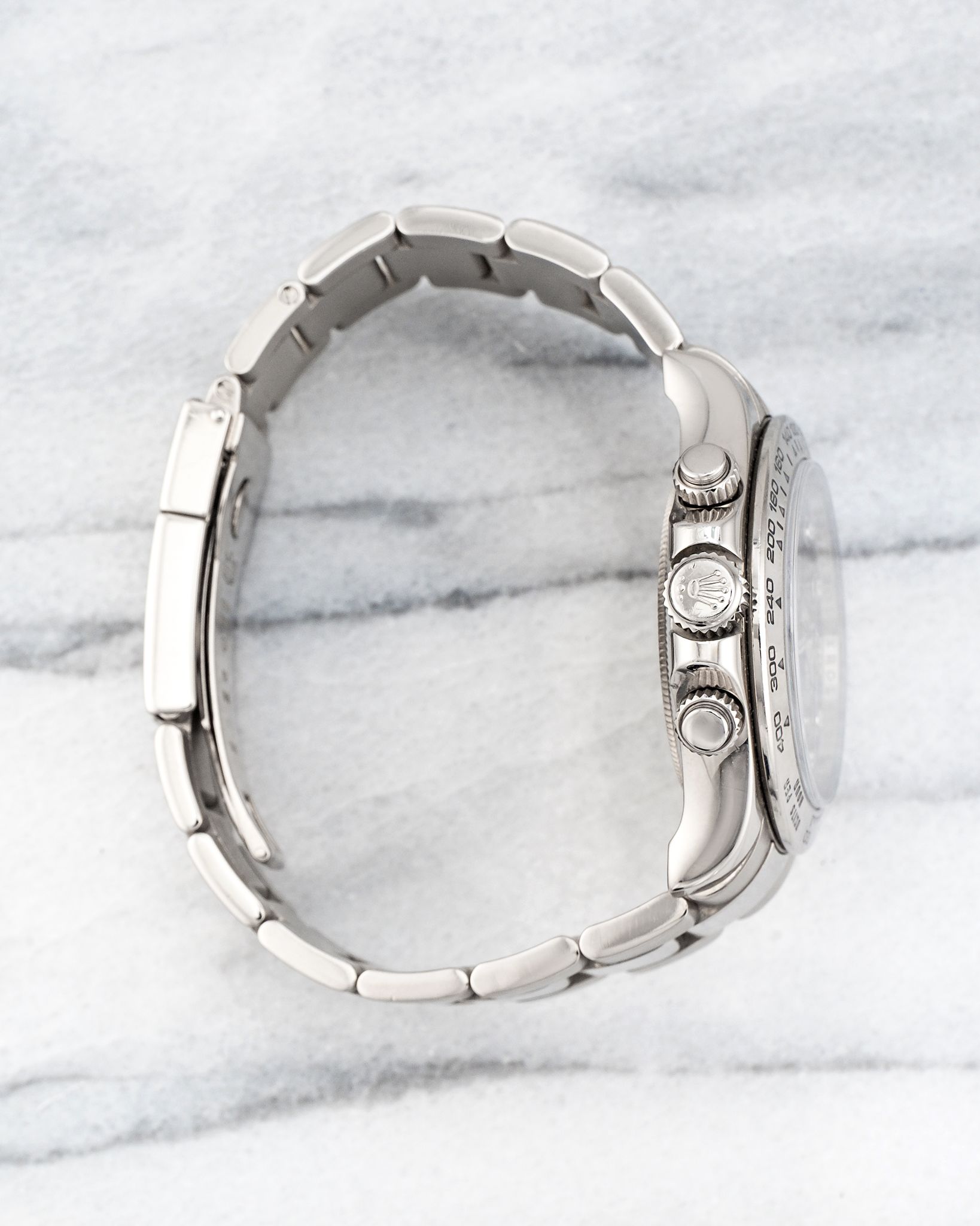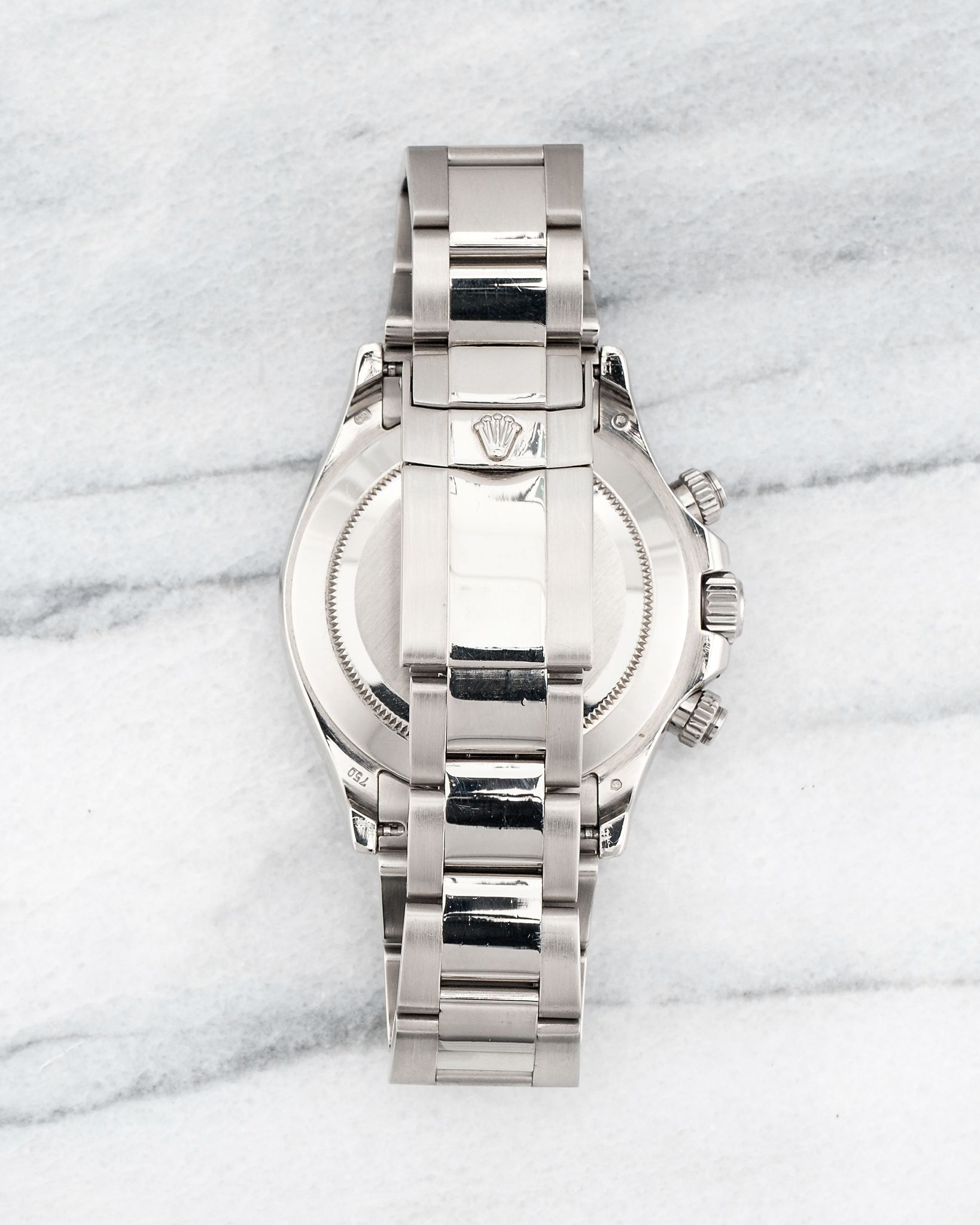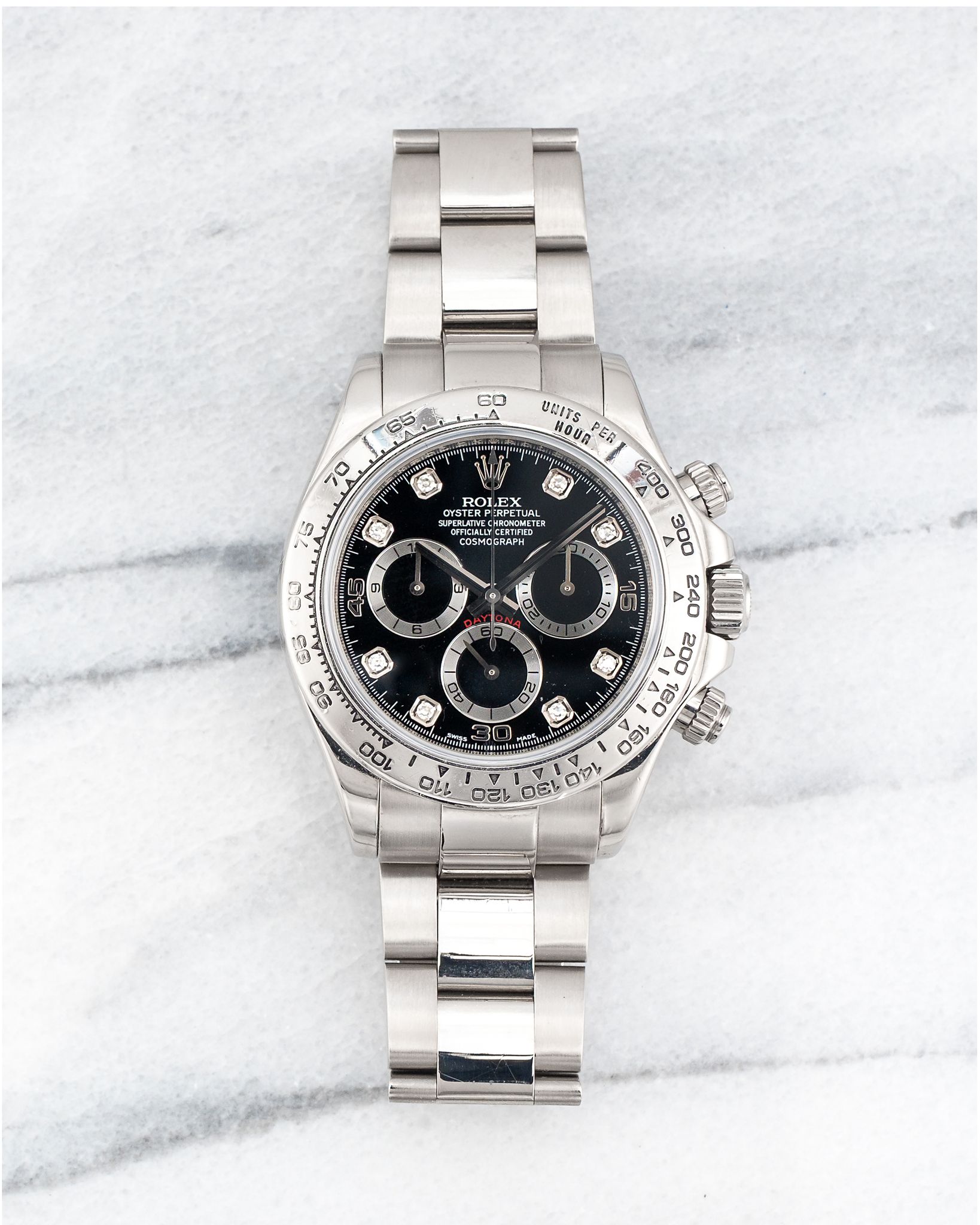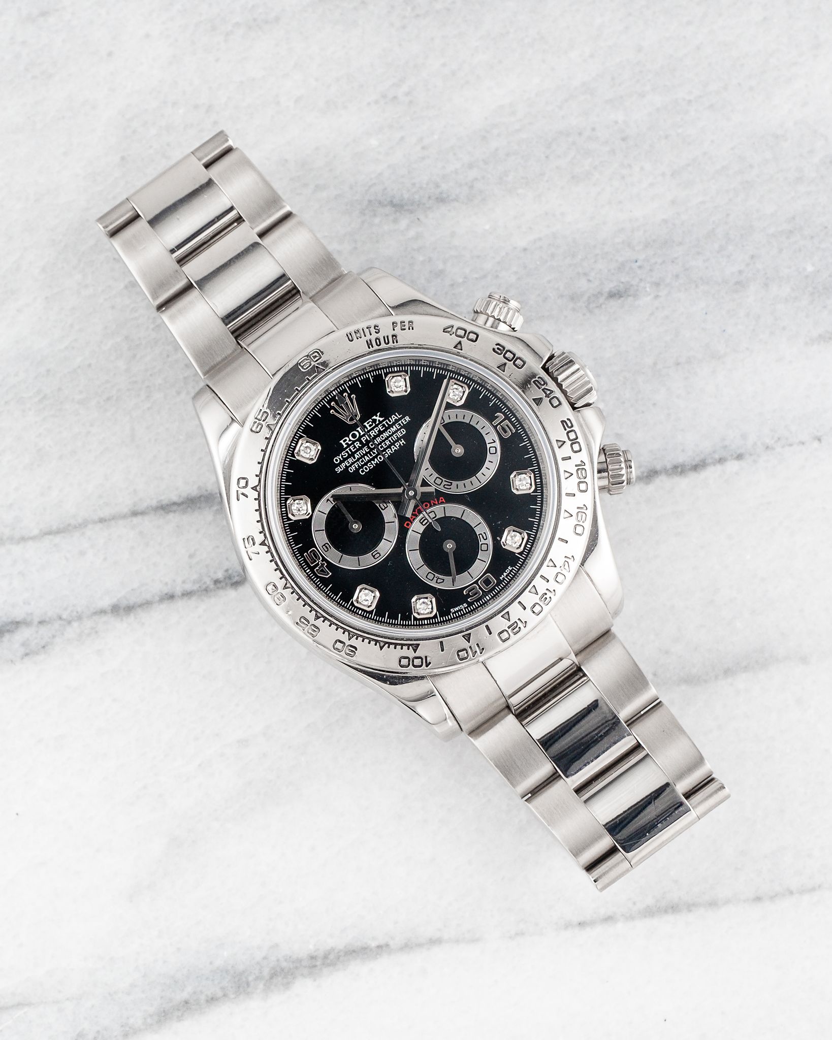 Here's a vintage Rolex Daytona reference 116509 automatic in 18k white gold with a black diamond dial on an Oyster bracelet from the 2000s. Keeps great time and is fully functional. Measurements include a 40mm white gold case and 20mm lug width. It's on a Rolex Oyster bracelet that fits up to a 7 inch wrist. The dial features factory diamond hour markers, triple chronograph subdials, and tachymeter scale bezel. White gold case and caseback. All parts are original including the signed Rolex crown, dial, movement, and caseback. Both the dial and case are in great cosmetic, untouched condition.