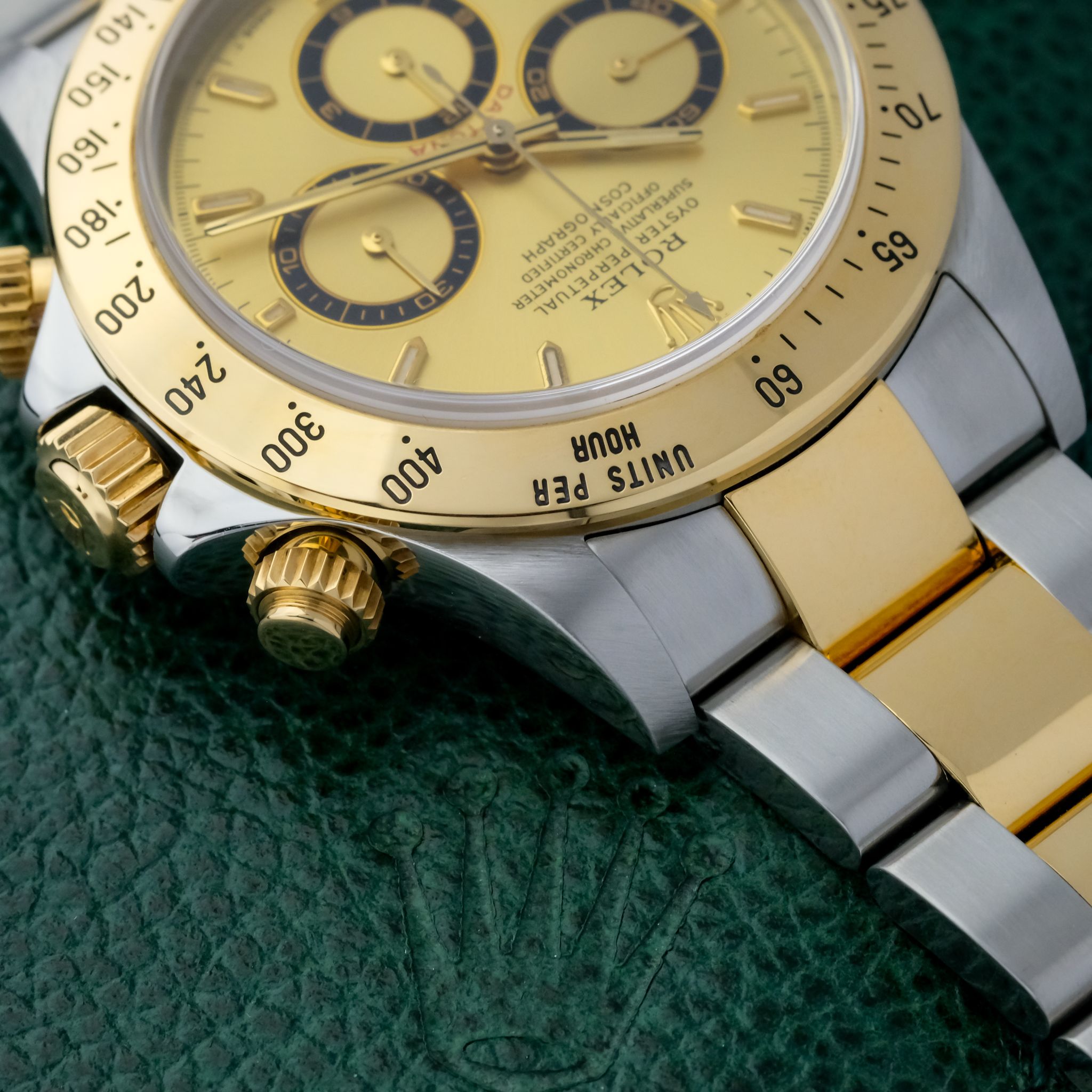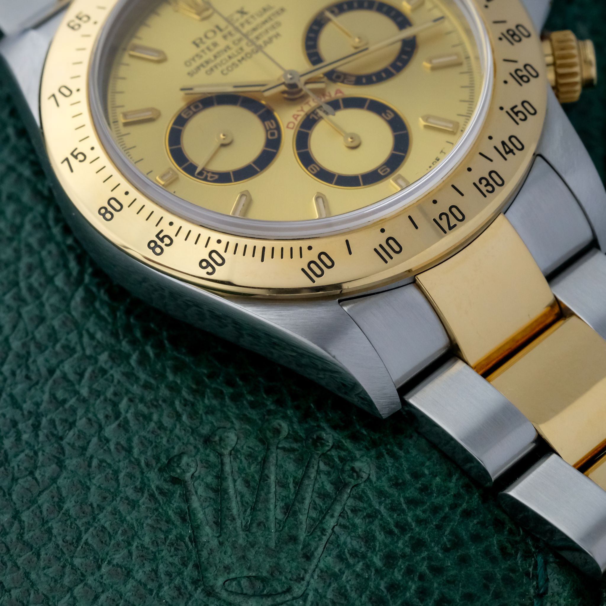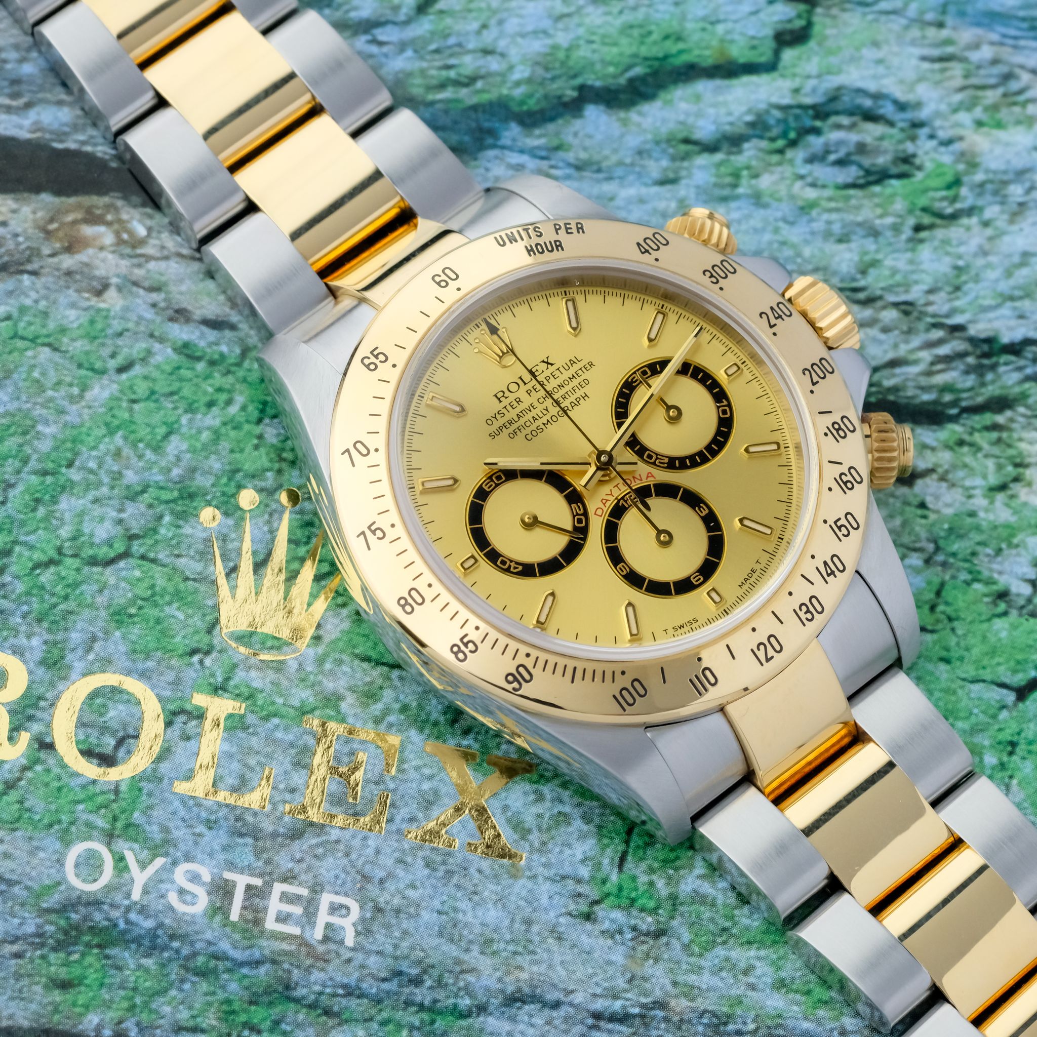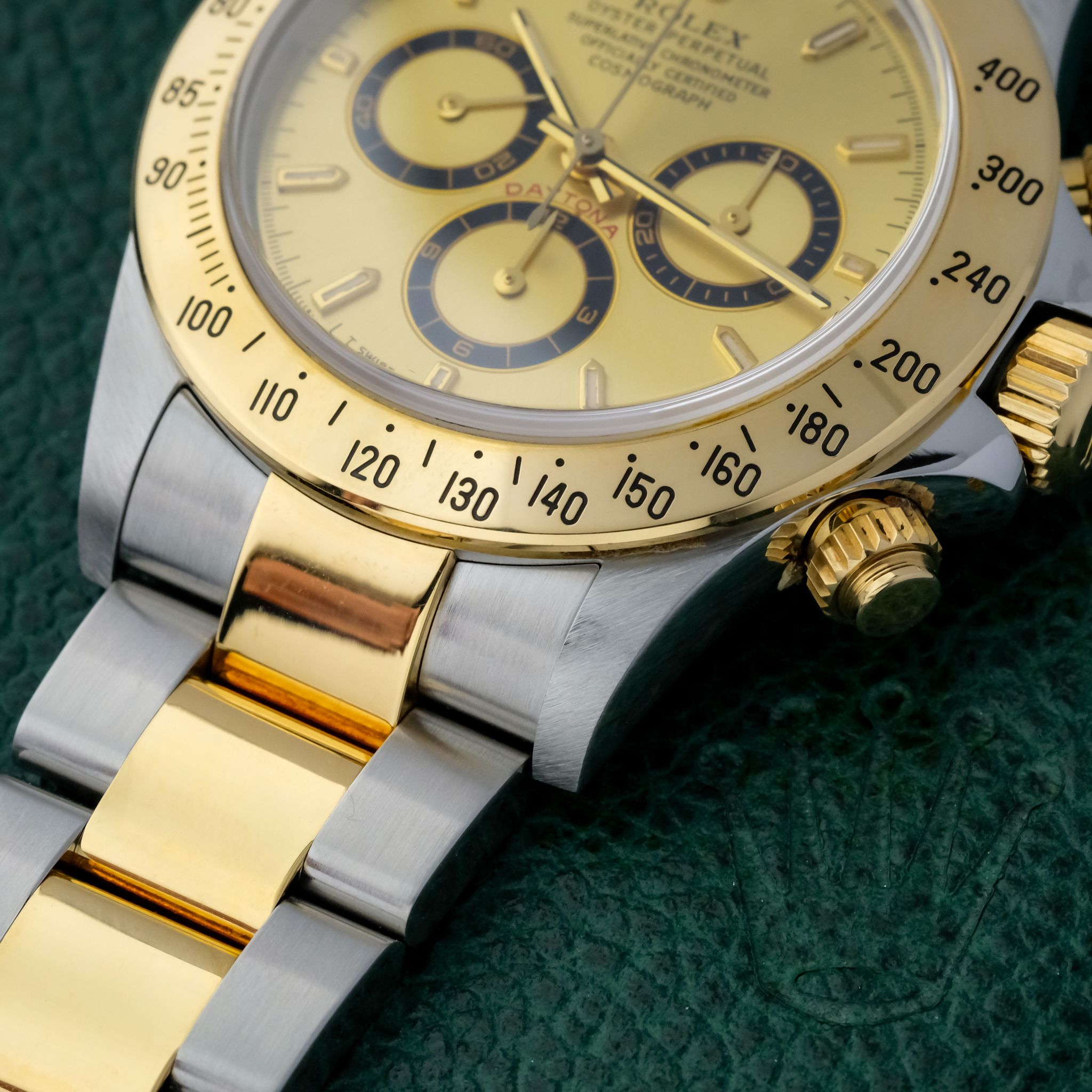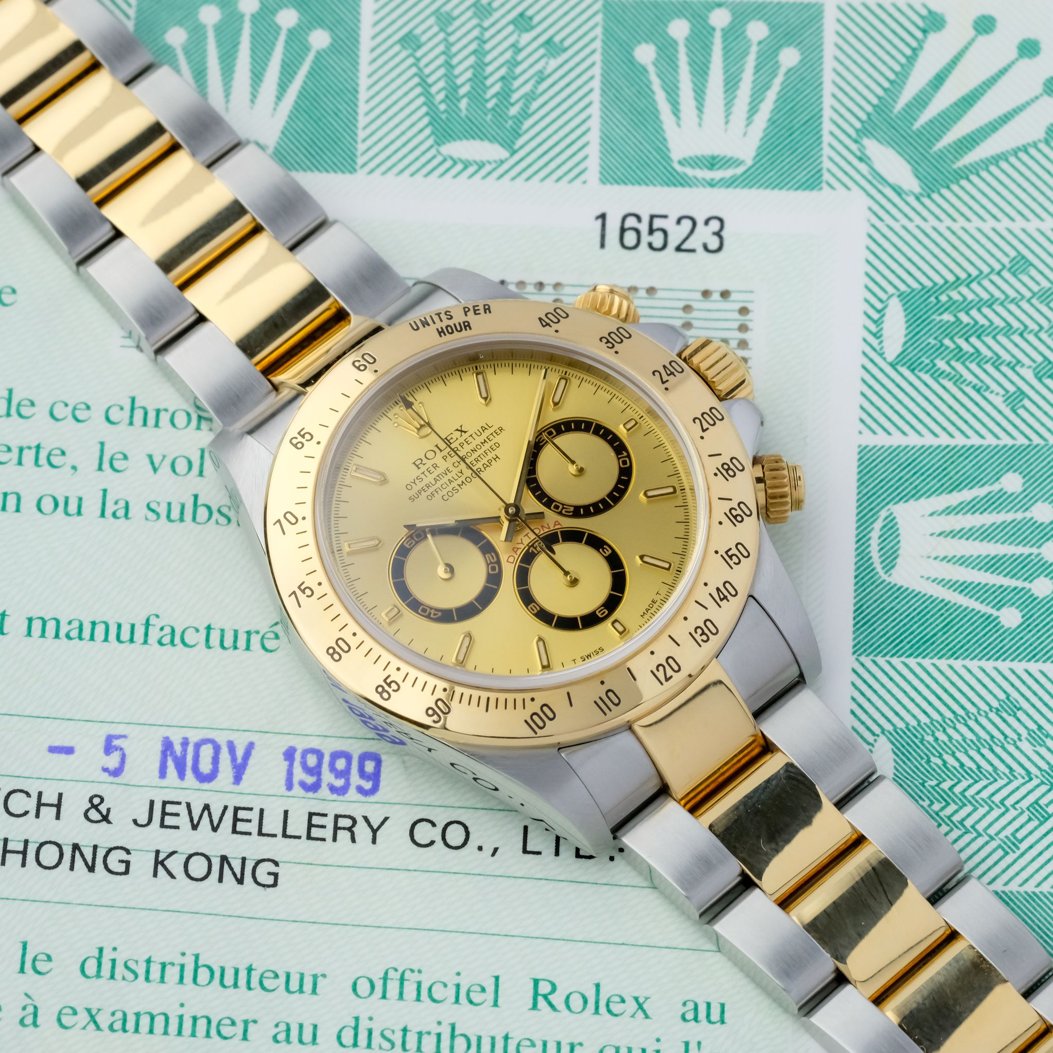 The last real Rolex Daytona “zenith” ref. 16523 in the amazing steel and 750/ yellow gold iteration with gold dial and black indices which brings a beautiful three dimensional level to the watch. The case is very sharp and has the original brushed and polished surfaces as well as clear edges. The bracelet is very tight as well and only has very light stretch to it. It’s accompanied by the original paperwork.
