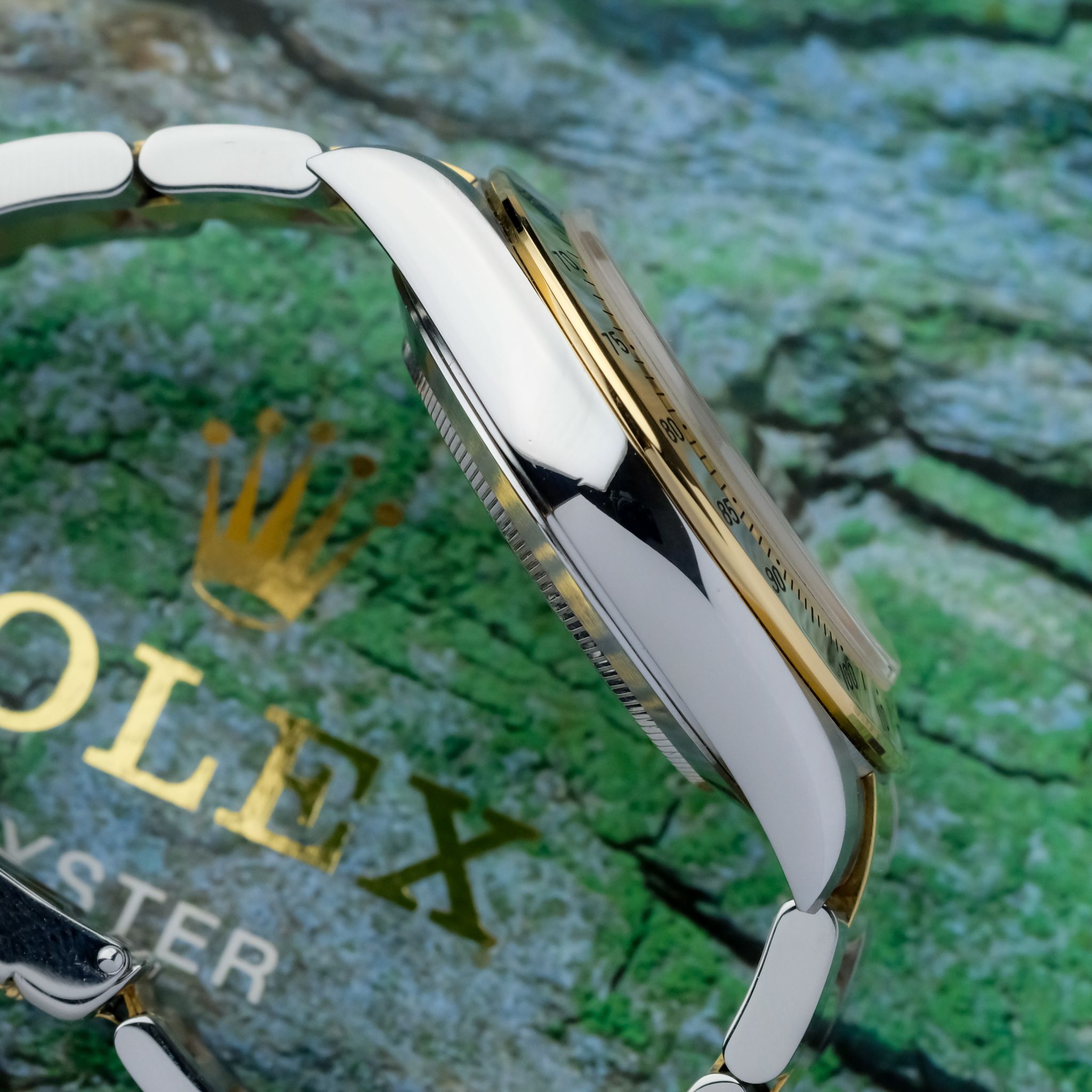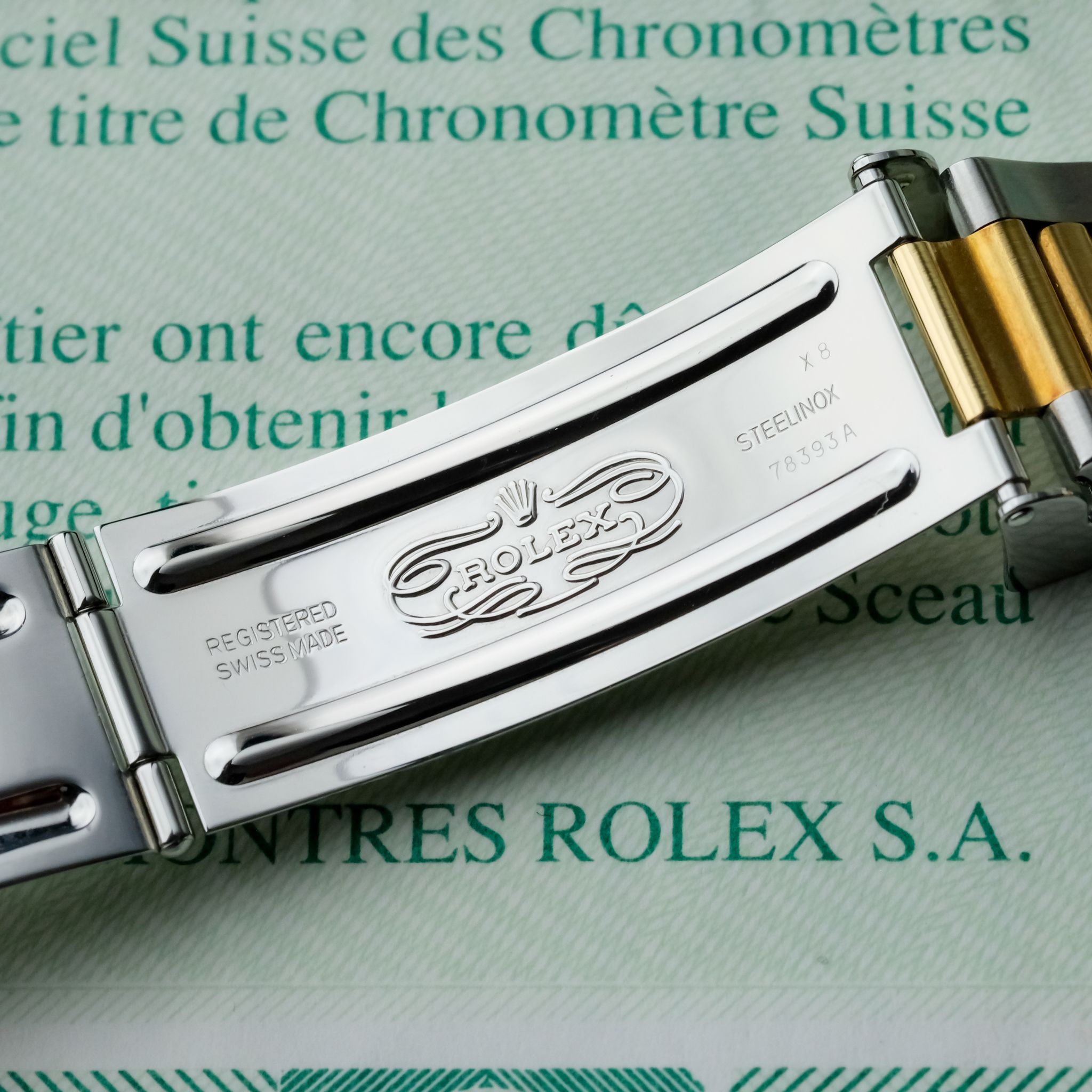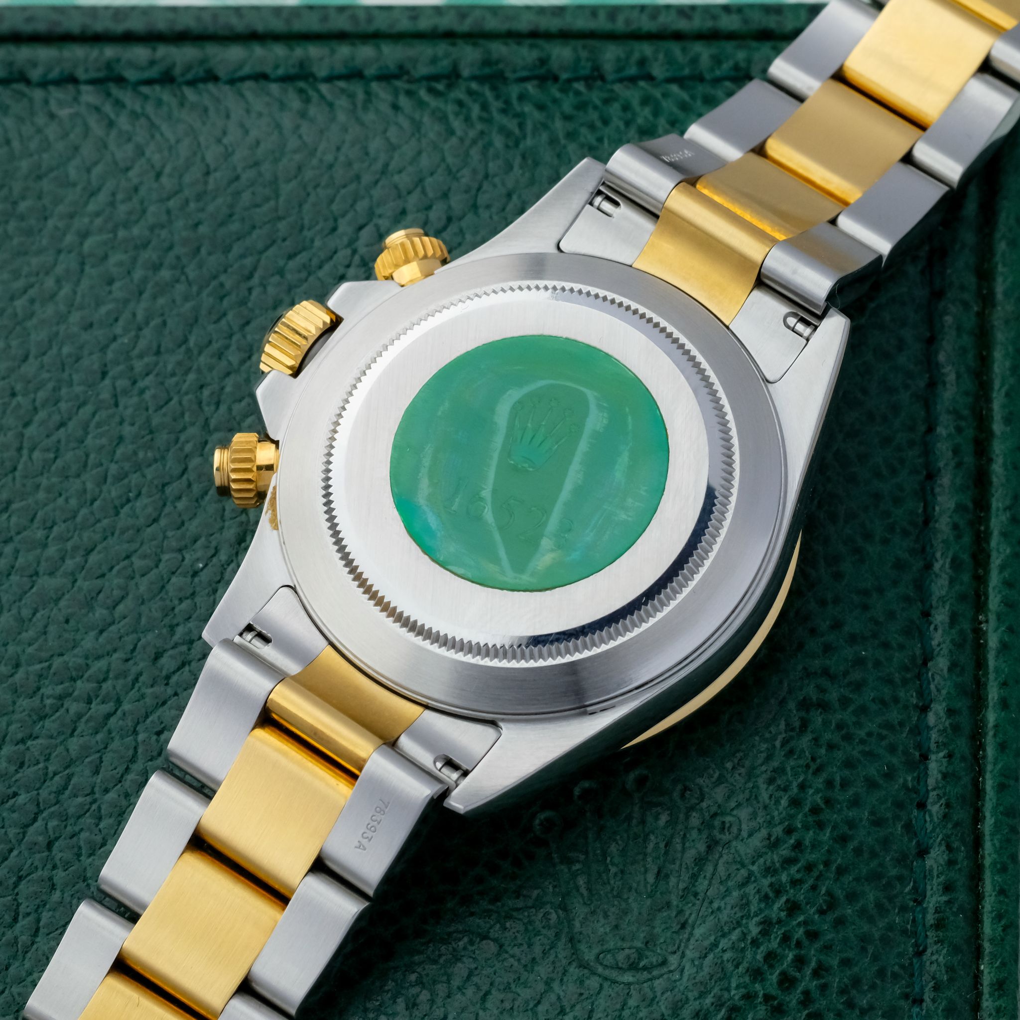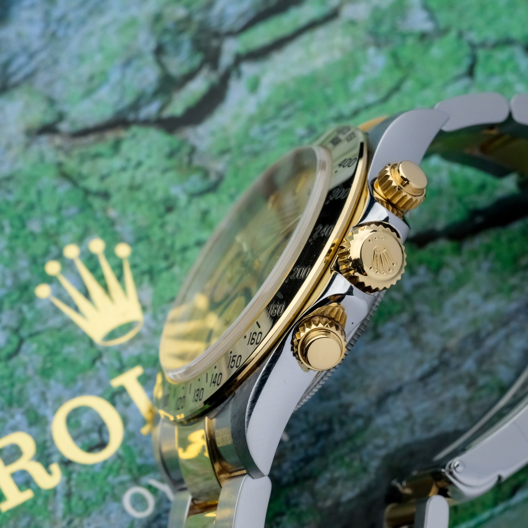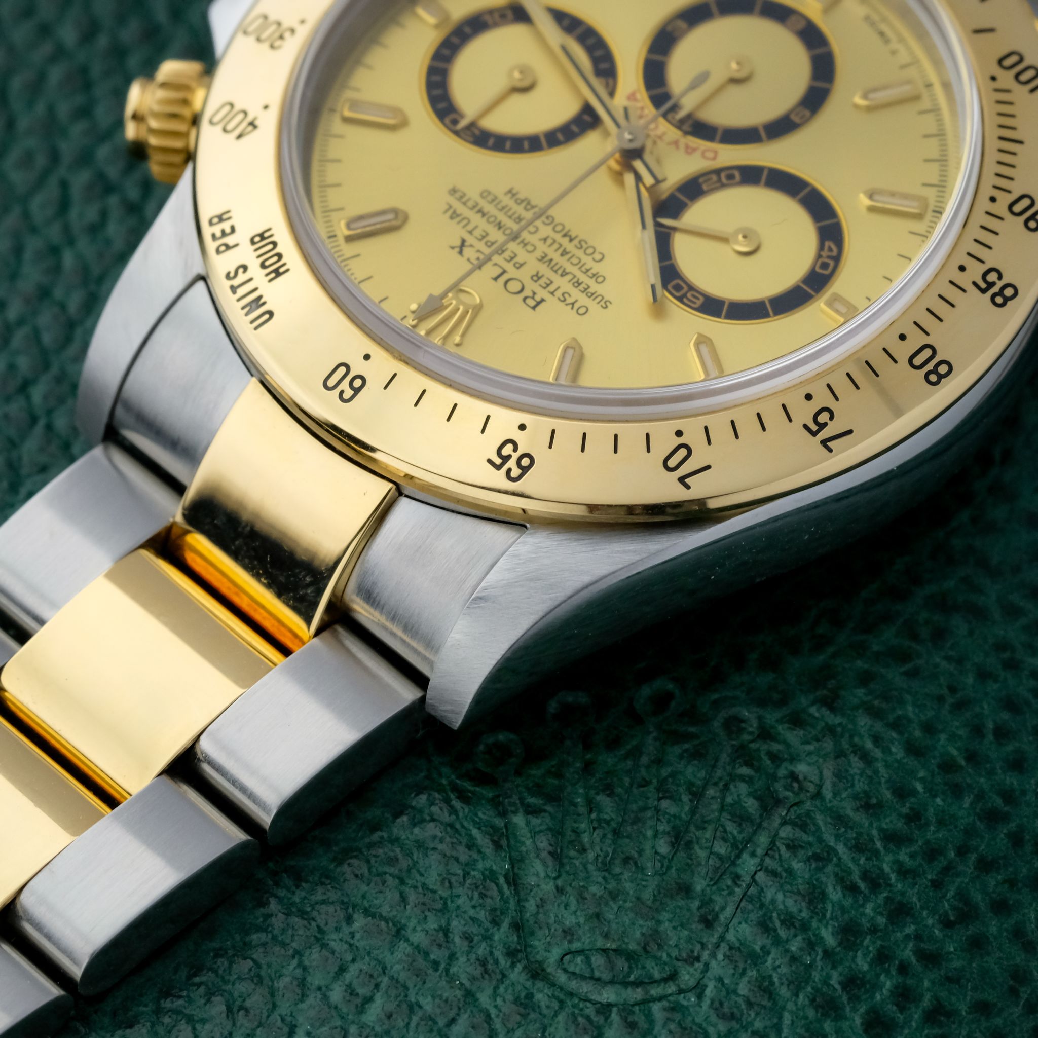The last real Rolex Daytona “zenith” ref. 16523 in the amazing steel and 750/ yellow gold iteration with gold dial and black indices which brings a beautiful three dimensional level to the watch. The case is very sharp and has the original brushed and polished surfaces as well as clear edges. The bracelet is very tight as well and only has very light stretch to it. It’s accompanied by the original paperwork.
