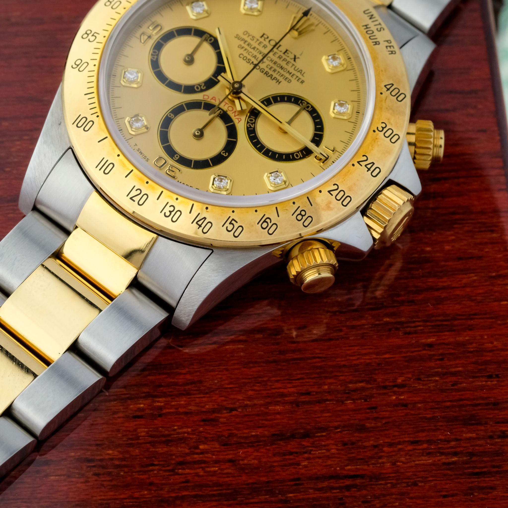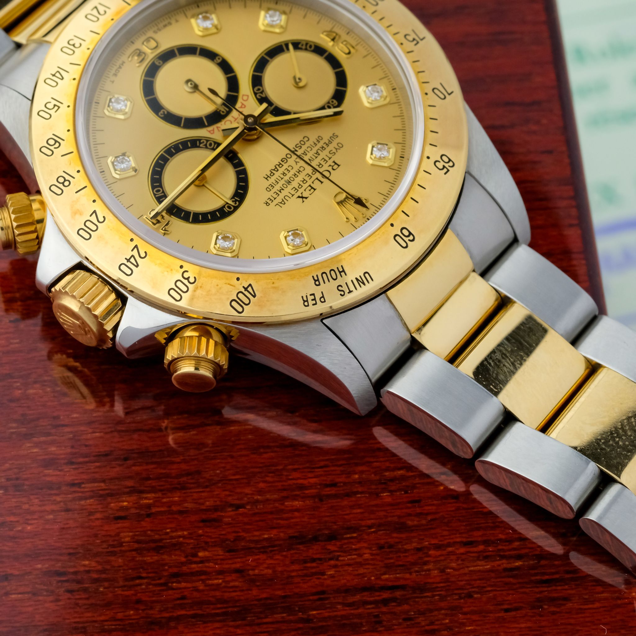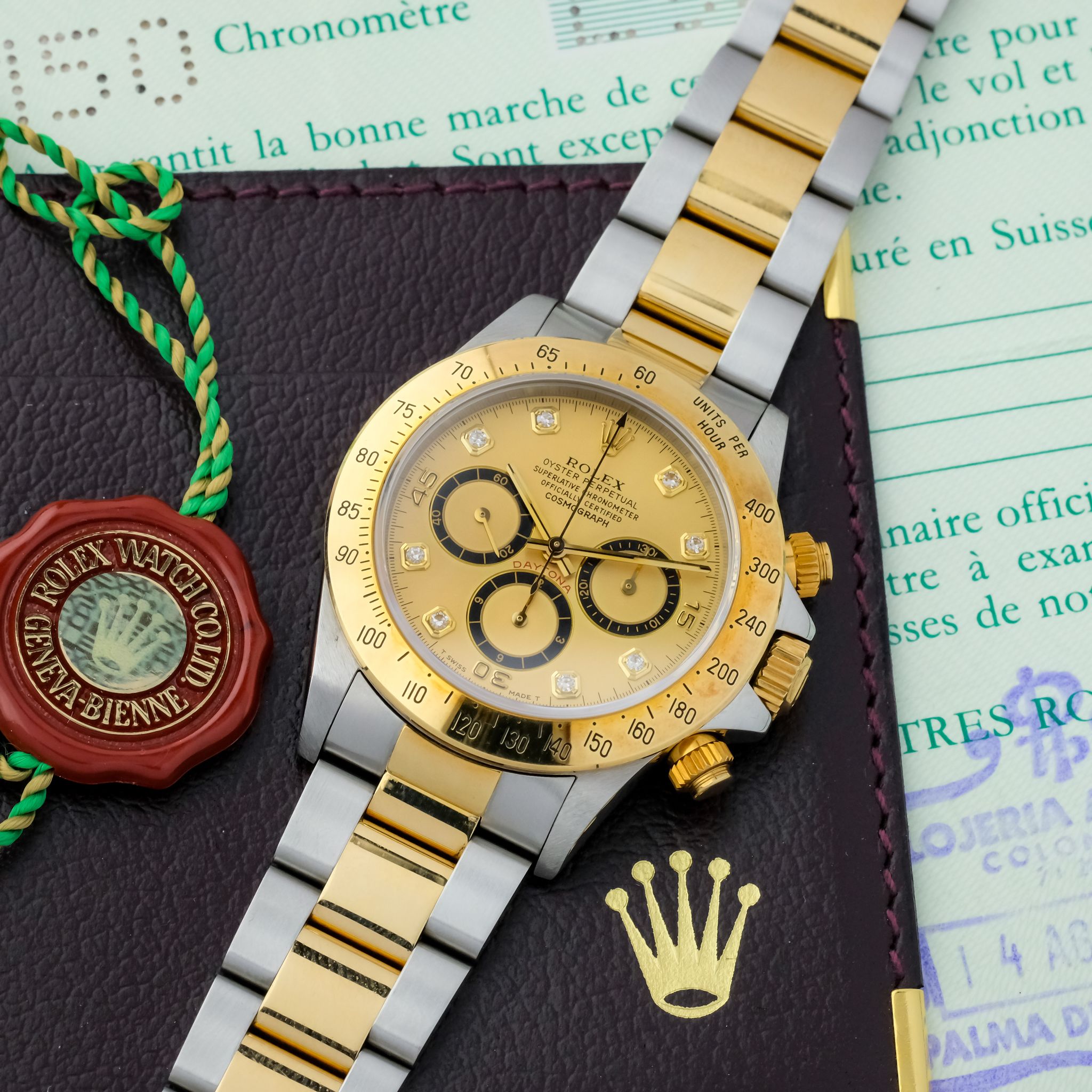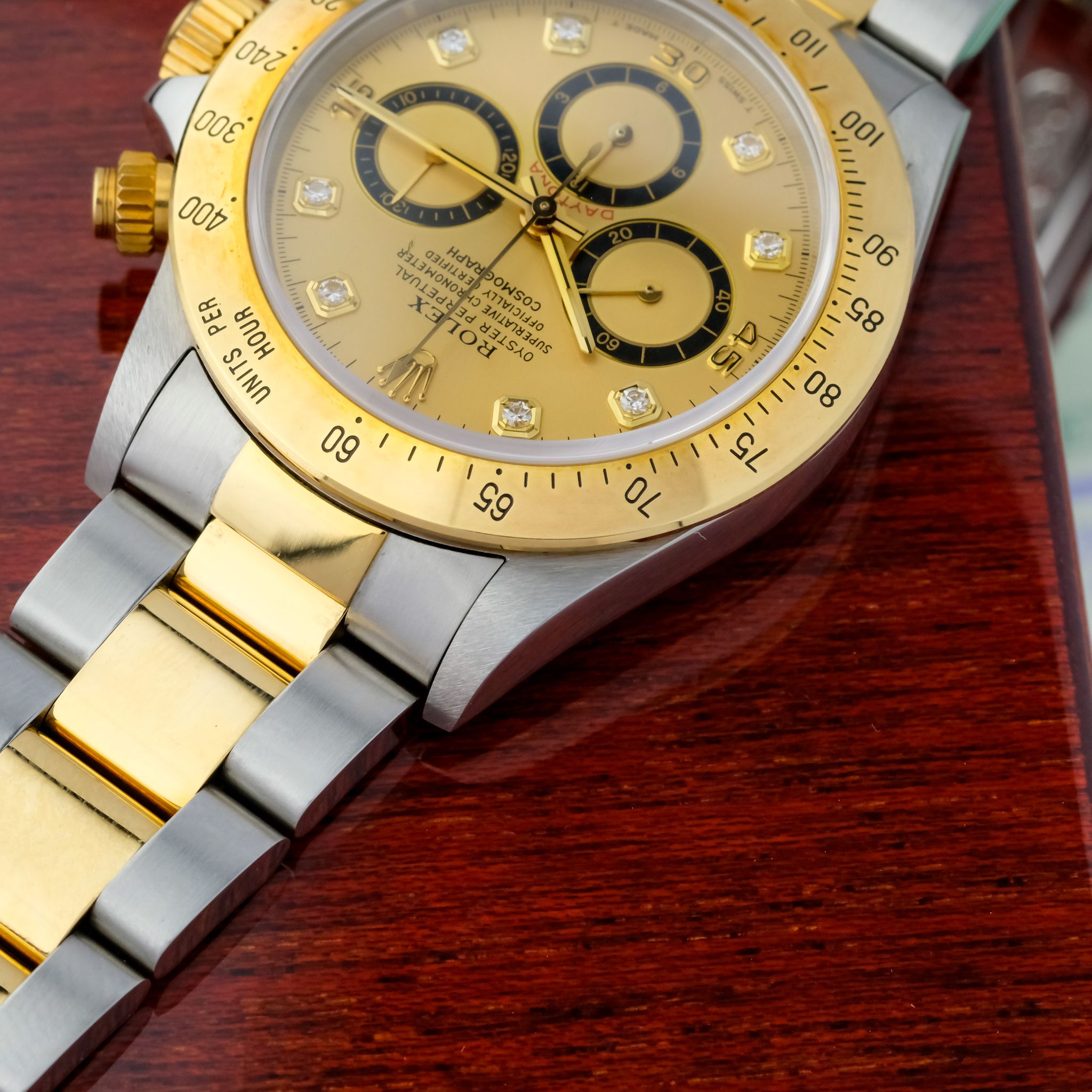 This particular example stands out for its striking gold dial, adorned with factory-set diamond hour markers. The warm, sunburst finish pairs effortlessly with the two-tone stainless steel and 18k yellow gold Oyster case and bracelet, offering both sport-driven functionality and refined luxury. As both a tool watch and a statement piece, the Ref. 16523 with gold diamond dial represents a unique intersection of heritage, performance, and elegance.
