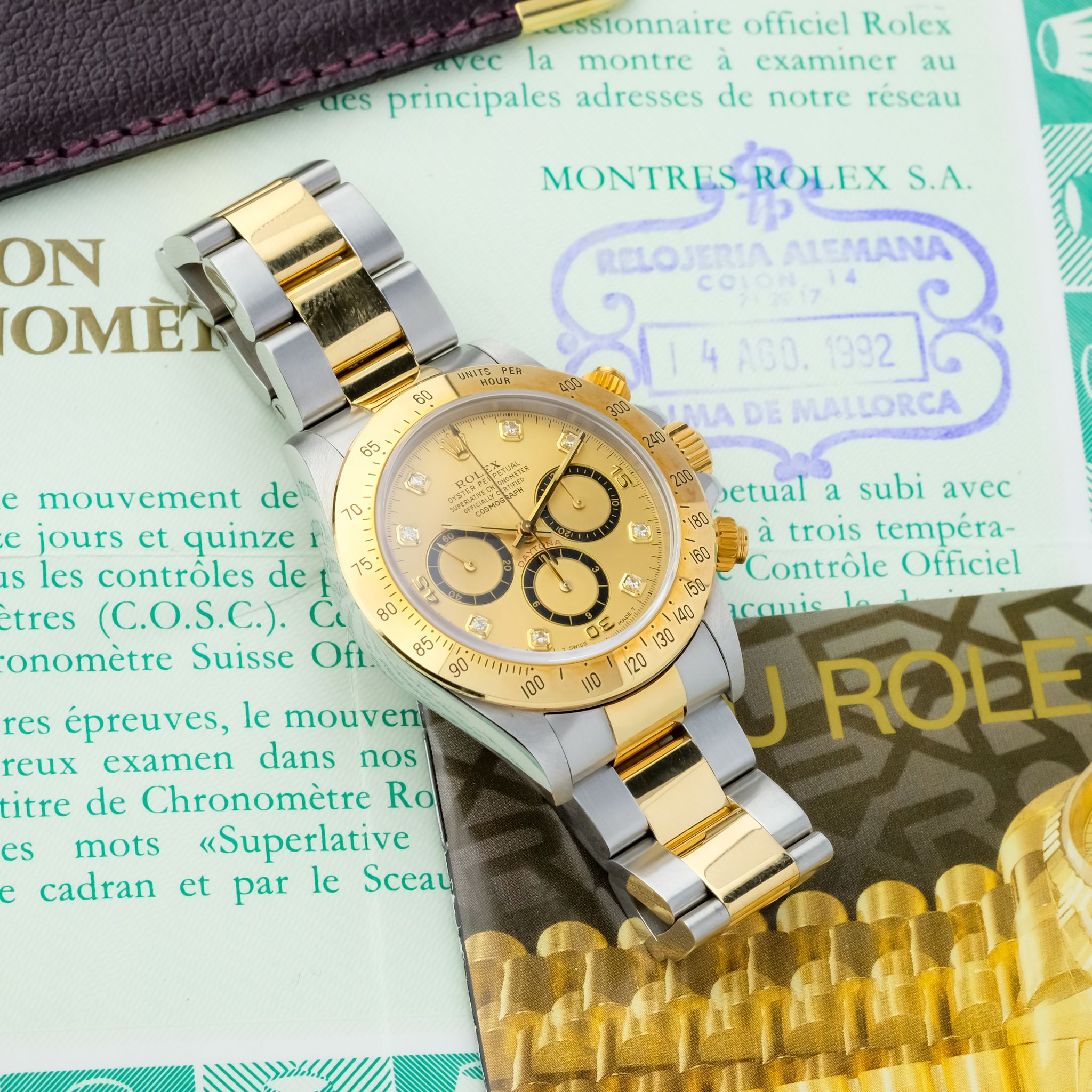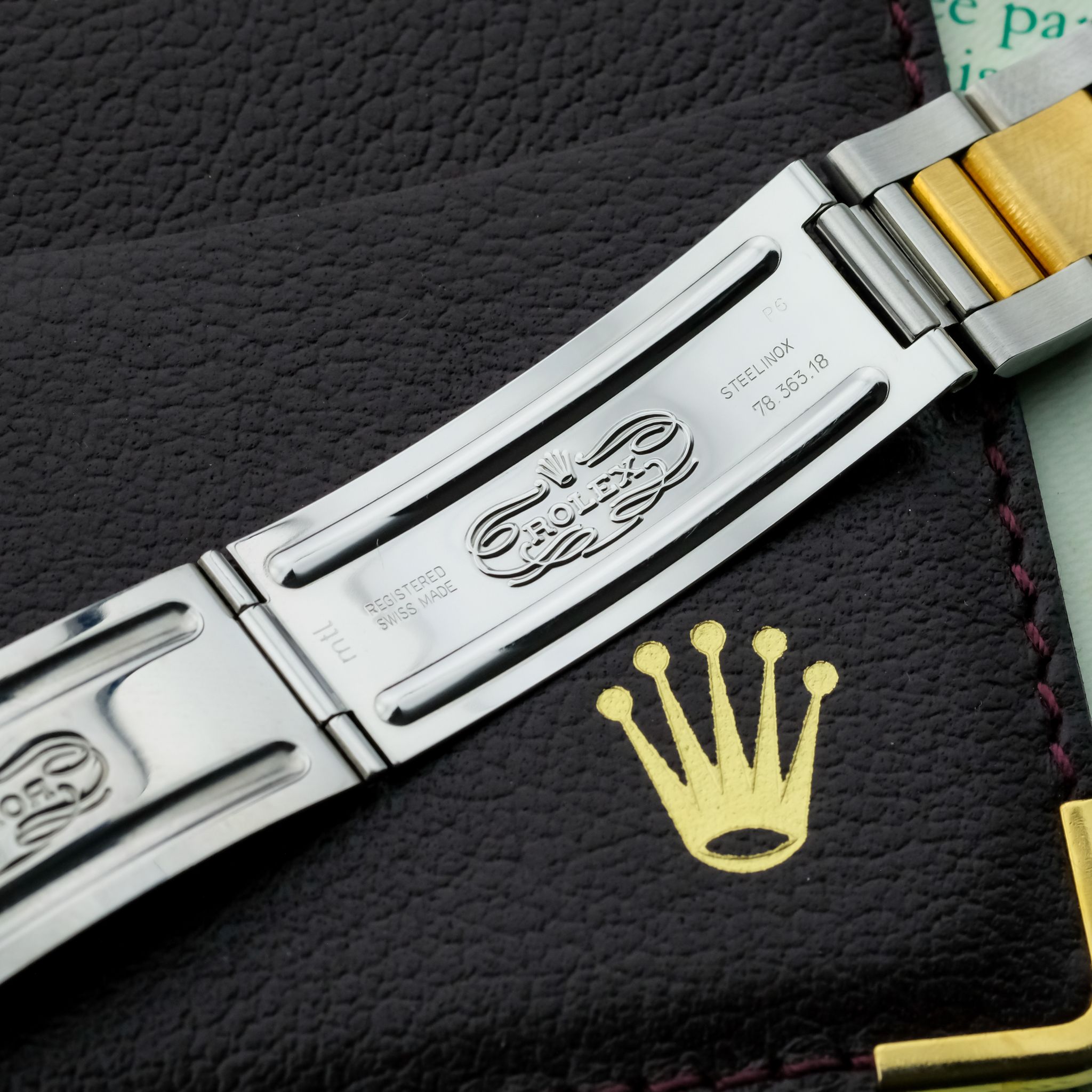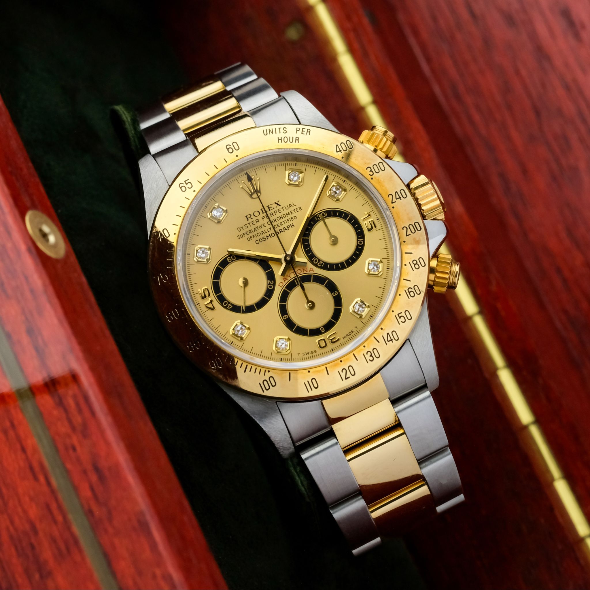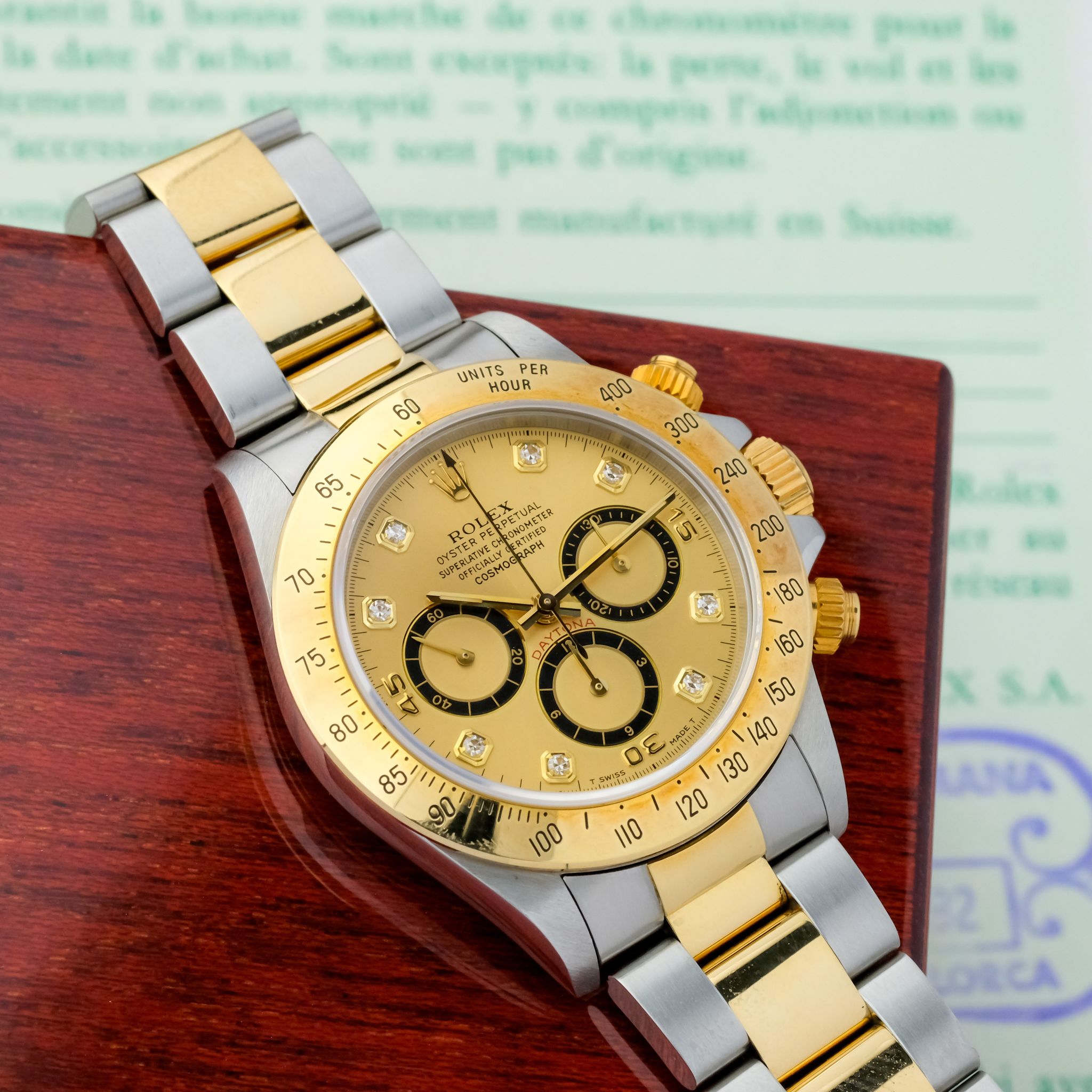 This particular example stands out for its striking gold dial, adorned with factory-set diamond hour markers. The warm, sunburst finish pairs effortlessly with the two-tone stainless steel and 18k yellow gold Oyster case and bracelet, offering both sport-driven functionality and refined luxury. As both a tool watch and a statement piece, the Ref. 16523 with gold diamond dial represents a unique intersection of heritage, performance, and elegance.