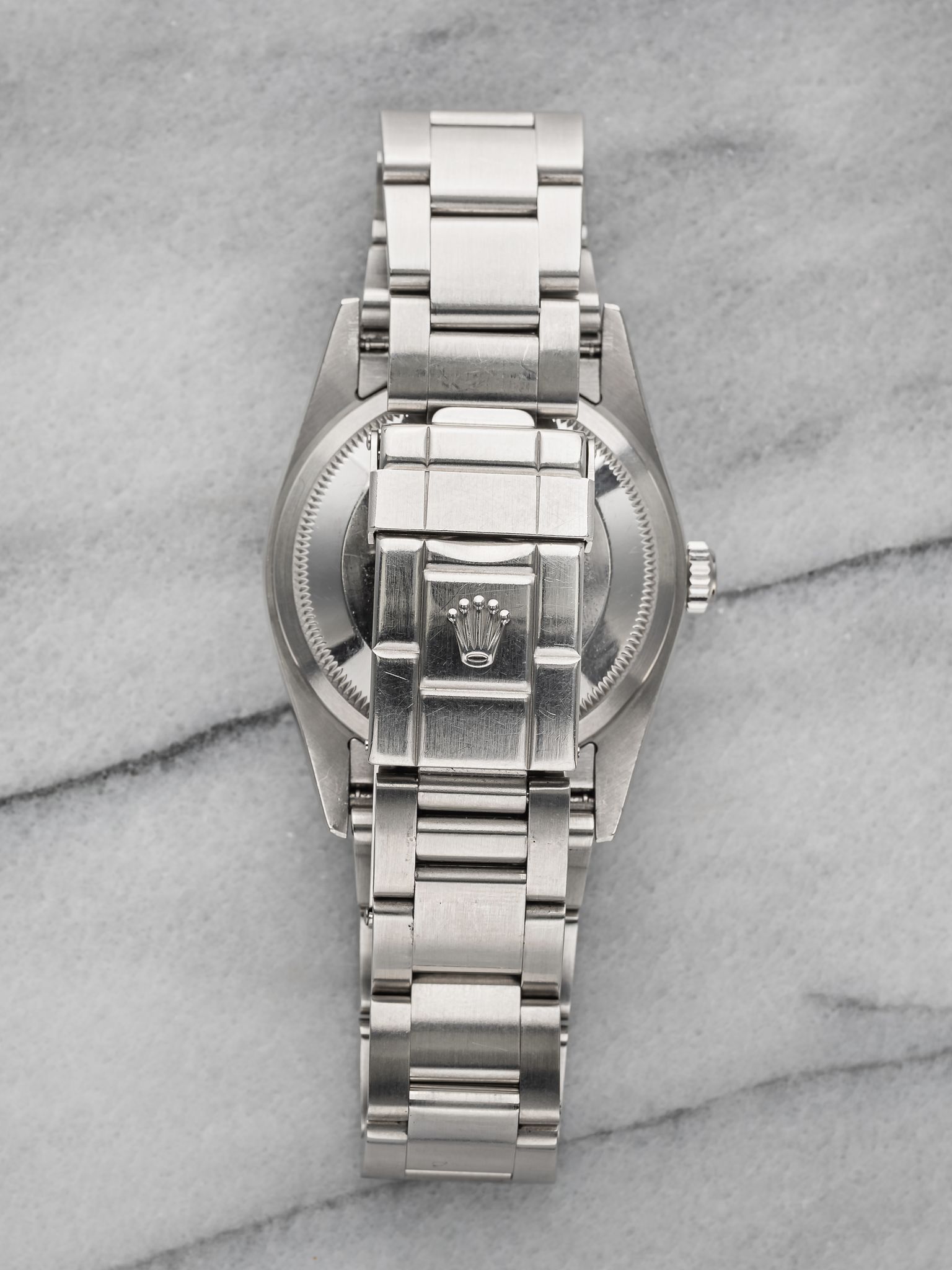 Here's a Rolex Explorer 1 reference number 114270 automatic with a black glossy dial on oyster bracelet from the 2000s. Comes with its box, papers, and pamphlets. Keeps great time and is fully functional. Measurements include a 36mm oyster case and 20mm lug width. It's on a Rolex oyster bracelet that fits up to a 7 inch wrist (shorter bracelet, 78690 bracelet) Time only. Clean black dial. Steel case and caseback. No holes case. Original sticker on the caseback. Unpolished lugs and case. Matching hands and hour markers (Mercedes hands). Swiss made dial at 6 o’clock. Both the dial and crystal are free from any scratches or marks. All parts are original, including the signed Rolex crown, dial, movement, and caseback. Both the dial and case are in great cosmetic, untouched condition.