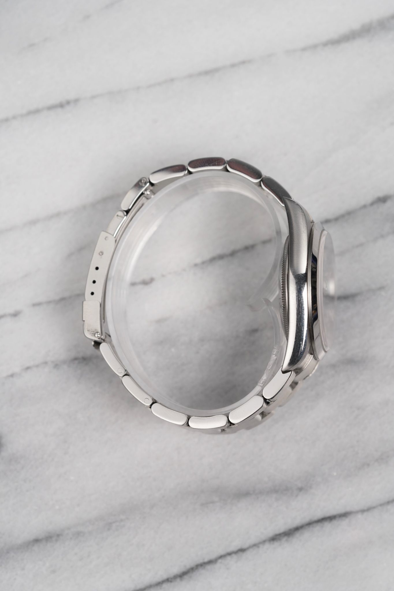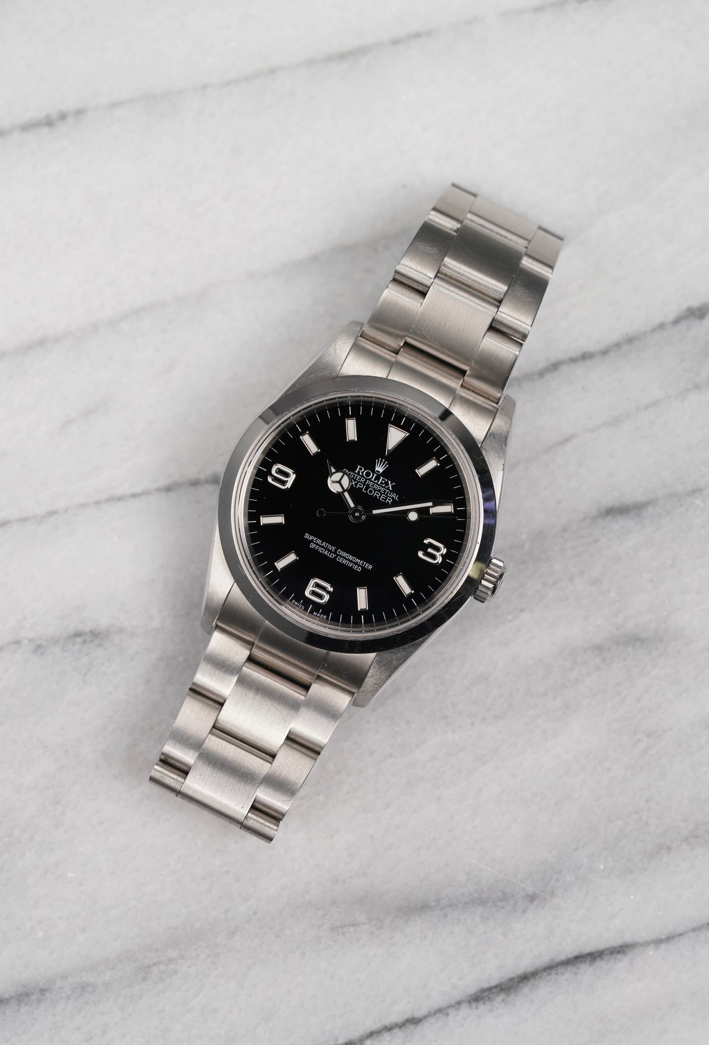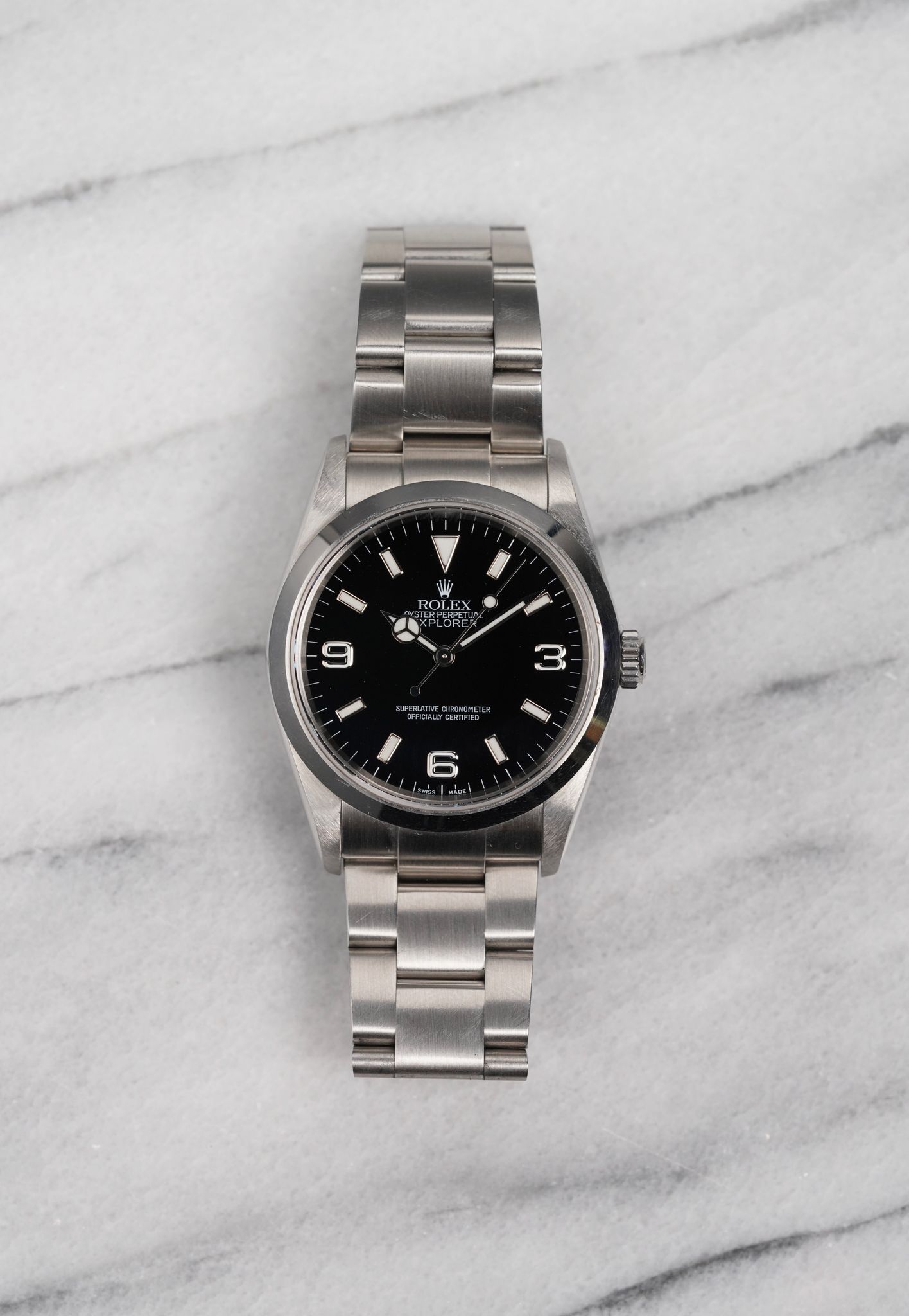 Here's a Rolex Explorer reference number 14270 automatic with a black dial on oyster bracelet from the 2000s. Keeps great time and is fully functional. Measurements include a 36mm oyster case and 20mm lug width. It's on a Rolex oyster bracelet that fits up to a 7 inch wrist (78690 bracelet) Time only. Clean black dial. Swiss made dial. Steel case and caseback. No holes case. Matching hands and hour markers (Mercedes hands). Both the dial and crystal are free from any scratches or marks. All parts are original including the signed Rolex crown, dial, movement, and caseback. Both the dial and case are in great cosmetic, untouched condition.