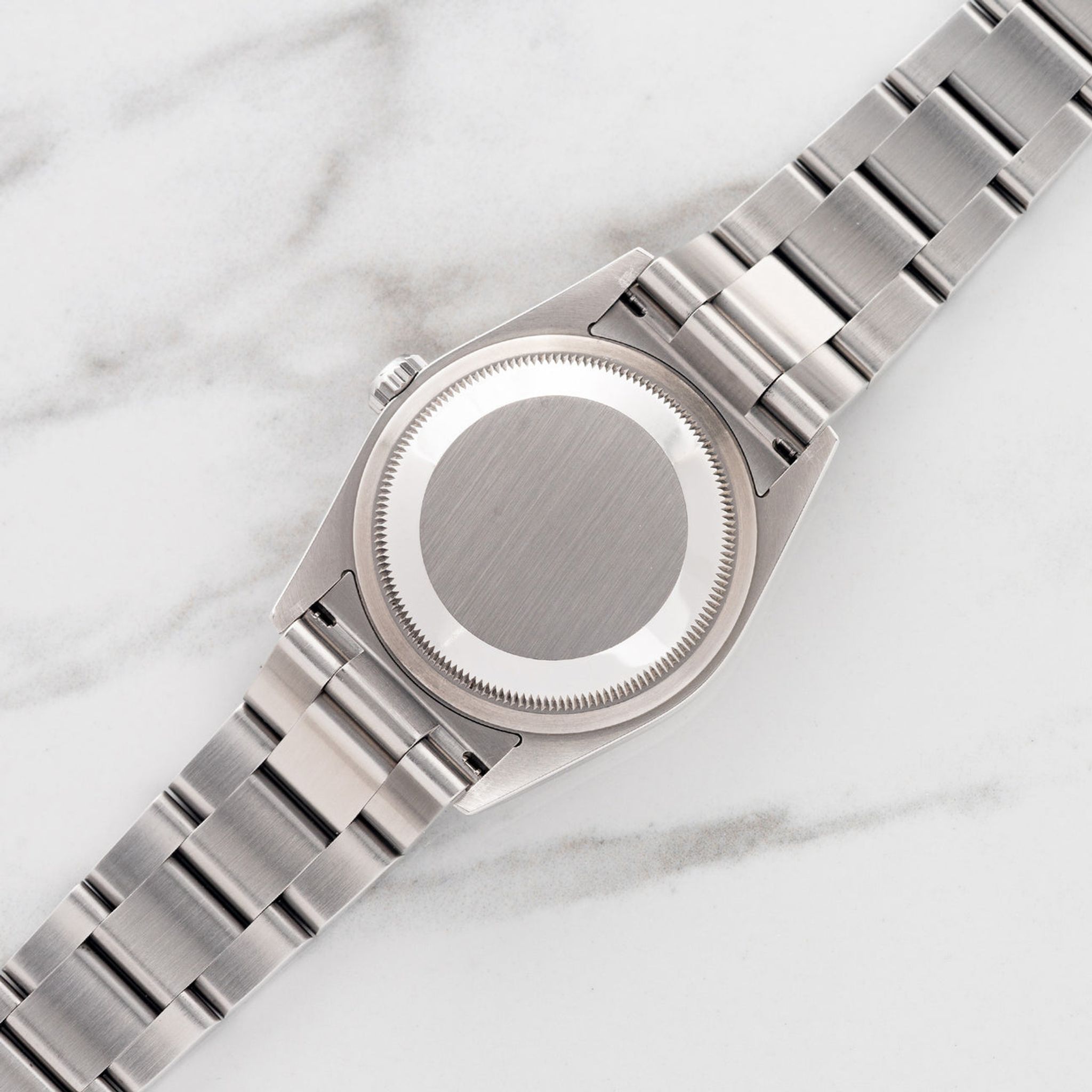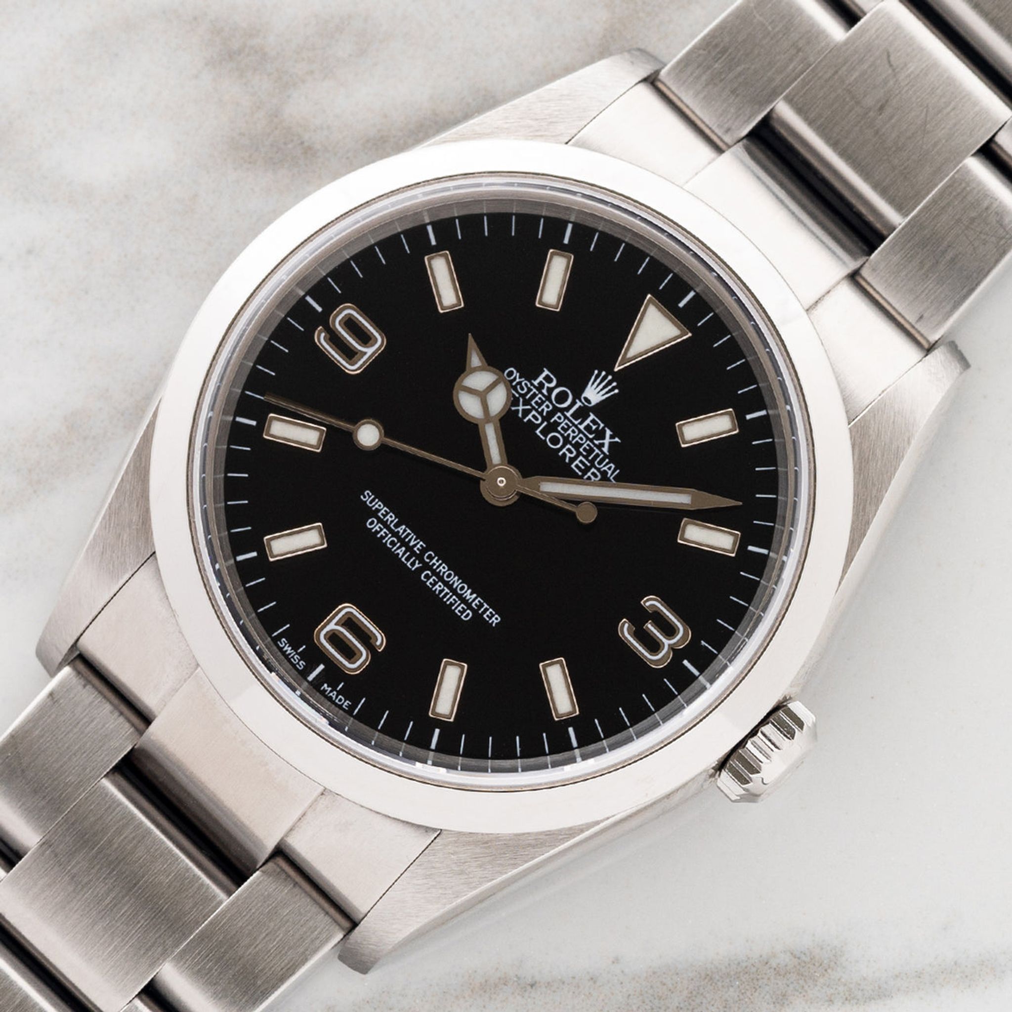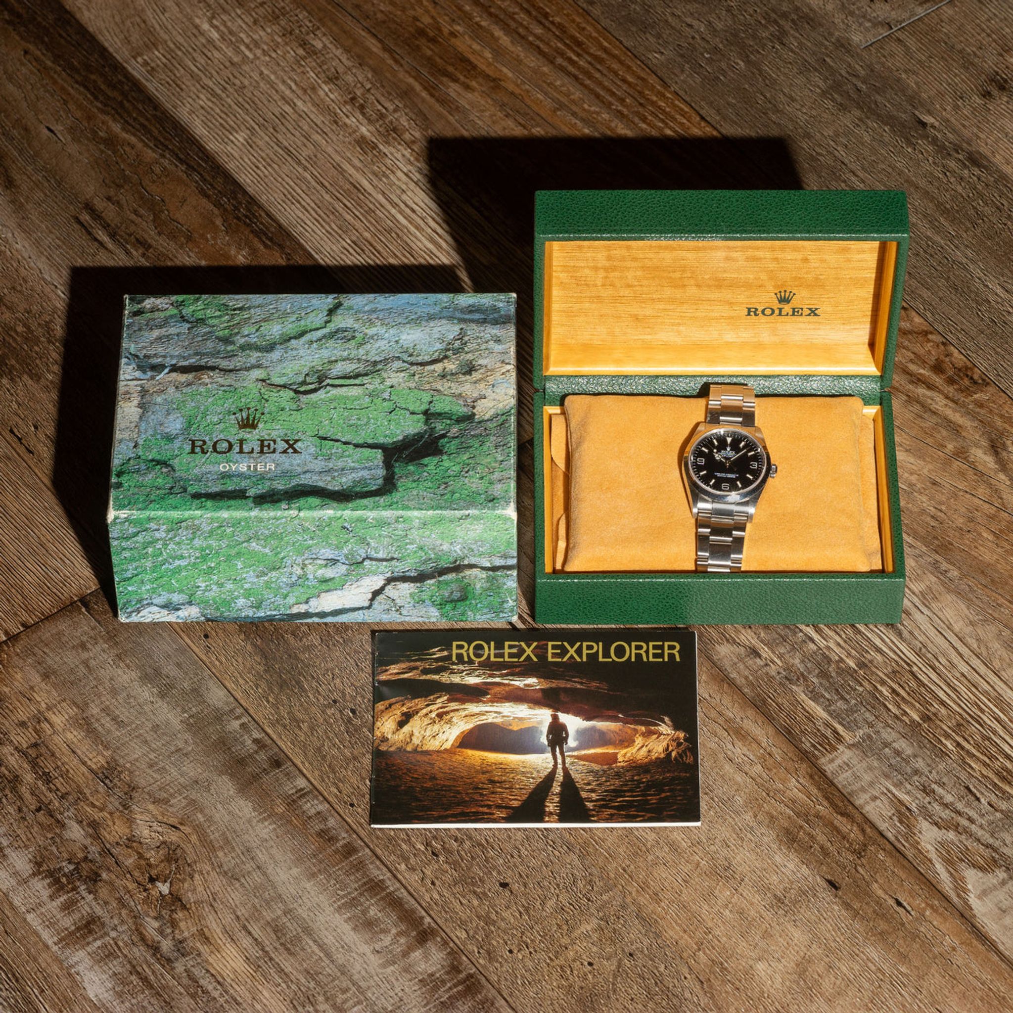 These early 6 digit reference Explorers are some of the cleanest and most practical iterations of the model and what we believe to be a modern classic and the end of an era for Rolex. This Y44X serial example, circa 2002 displays excellent overall condition with a sharp and unpolished case. The bracelet is also very tight and unpolished with light wear. This set comes accompanied by its inner and outer boxes and Explorer booklet. If you've been looking for great value in neo-vintage Rolex, this reference is one of our top choices for a daily driver.
