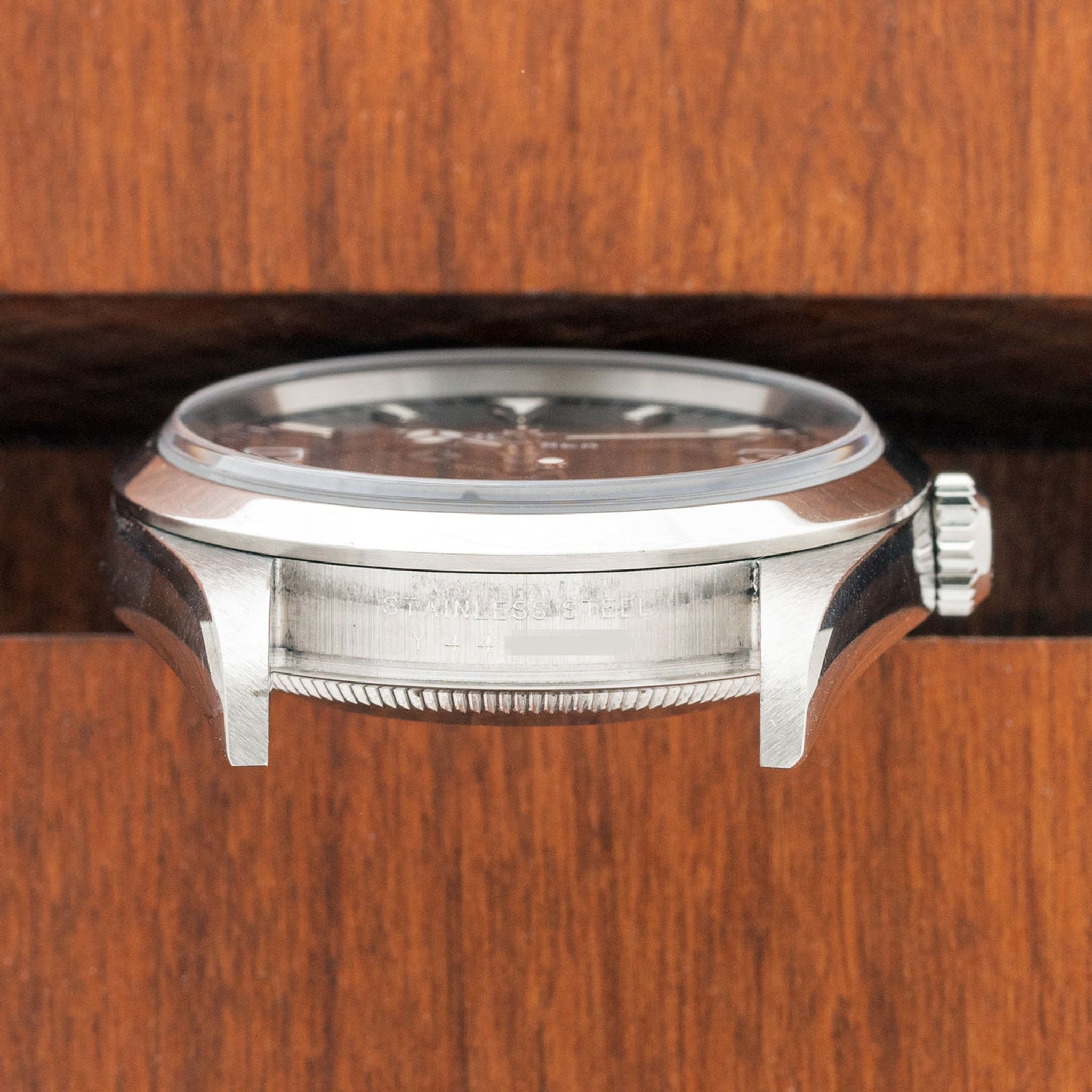 Case: Appears sharp and unpolished with thick and even lugs. There is a ding on the end of the lower right lug but it is not distracting. Overall, light signs of use overall consistent with age. Correct signed crown.