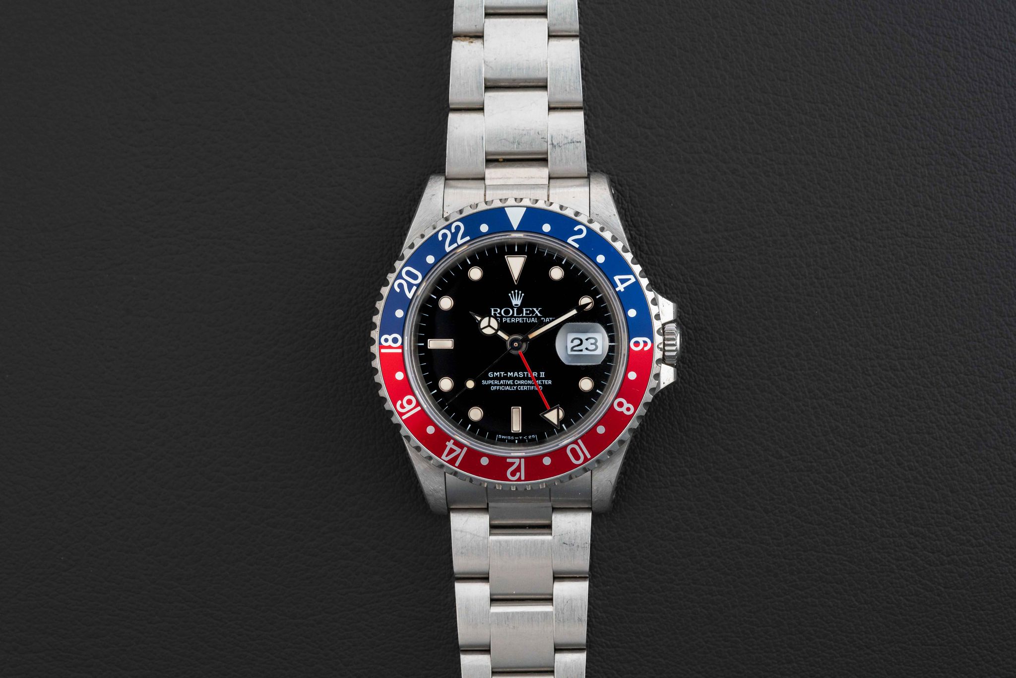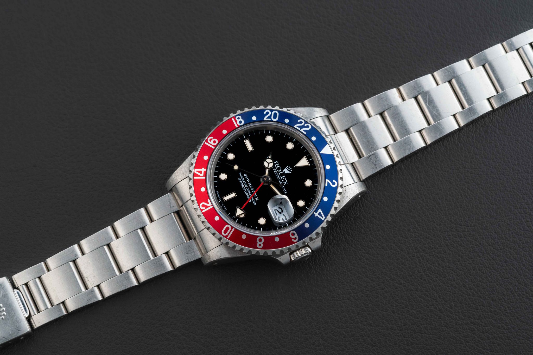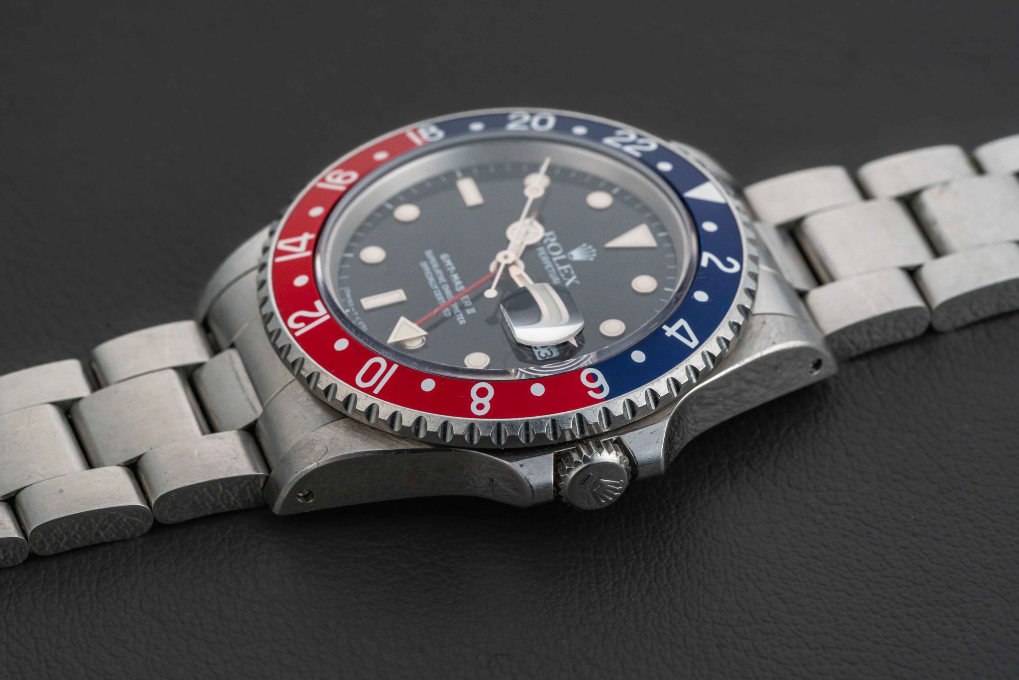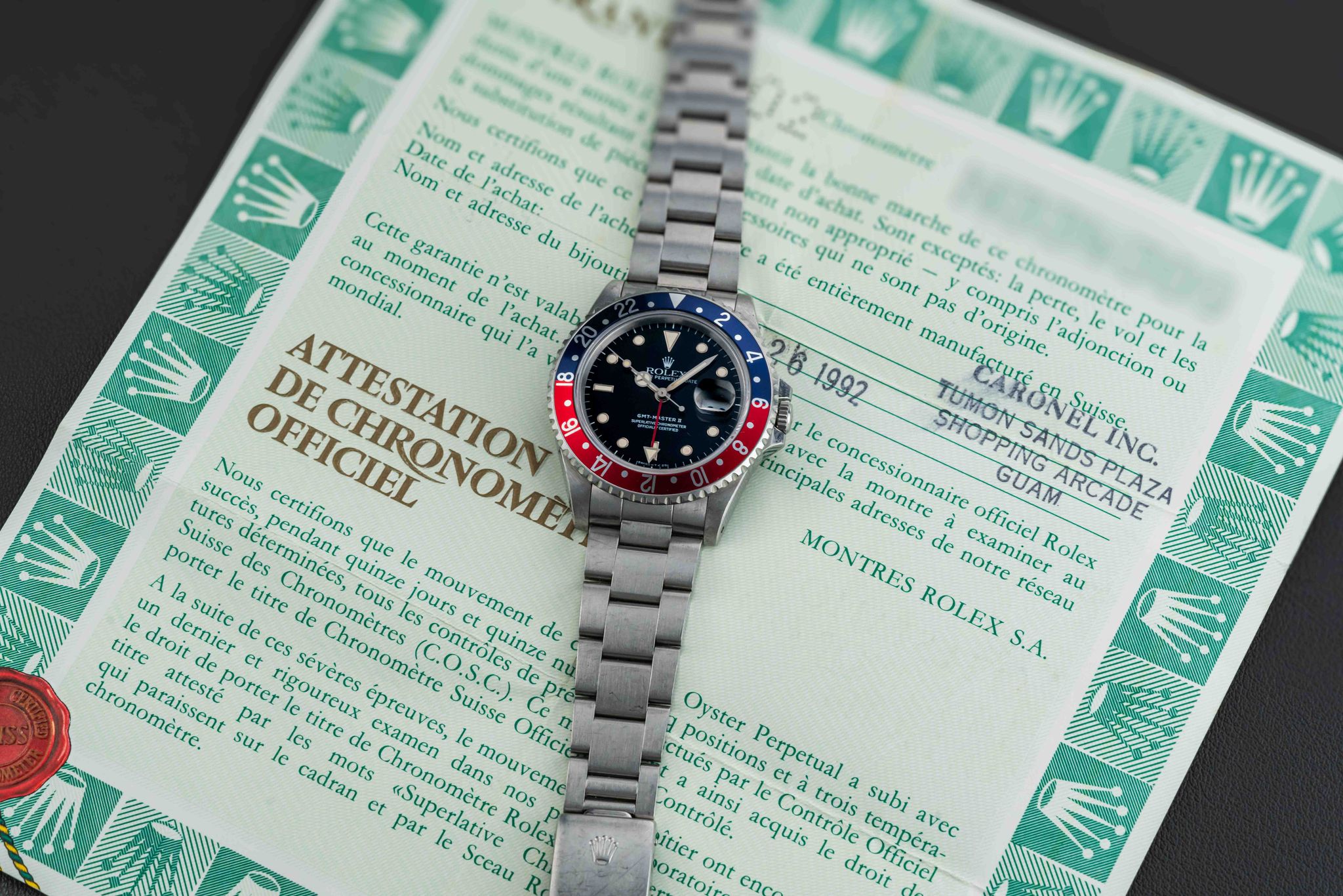 Offered here is a very nice and attractive Rolex GMT-Master II, Ref. 16710, circa 1991, complete with its original Rolex box (not pictured, but included), and “punched” Guarantee Certificate (originally sold in Guam in 1992). This example is in great neo-vintage condition. The case appears unpolished with normal wear from use, with original and sharp beveled edges, and still old remnants of the original caseback sticker (can be removed upon request). The dial is free of damage, with no chips, marks, or scratches, and retains its factory gloss. The original lume is present in both dial and hands, with no loss, aged to a nice off-white color. Finally, the watch comes fitted with a “Pepsi” (red and blue) GMT bezel insert. The watch comes fitted on a 78790 bracelet with 501B endlinks; the bracelet has 11 full links and no stretch.