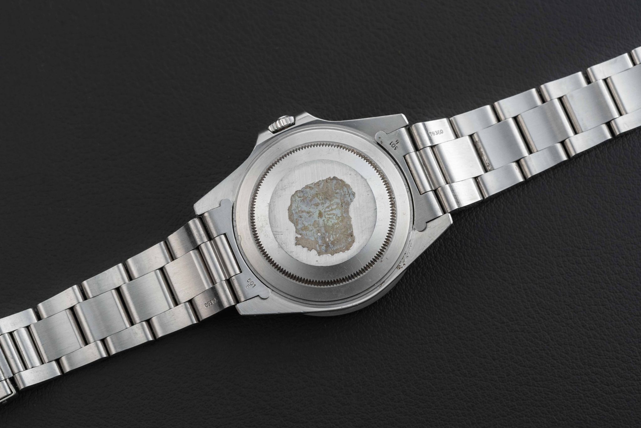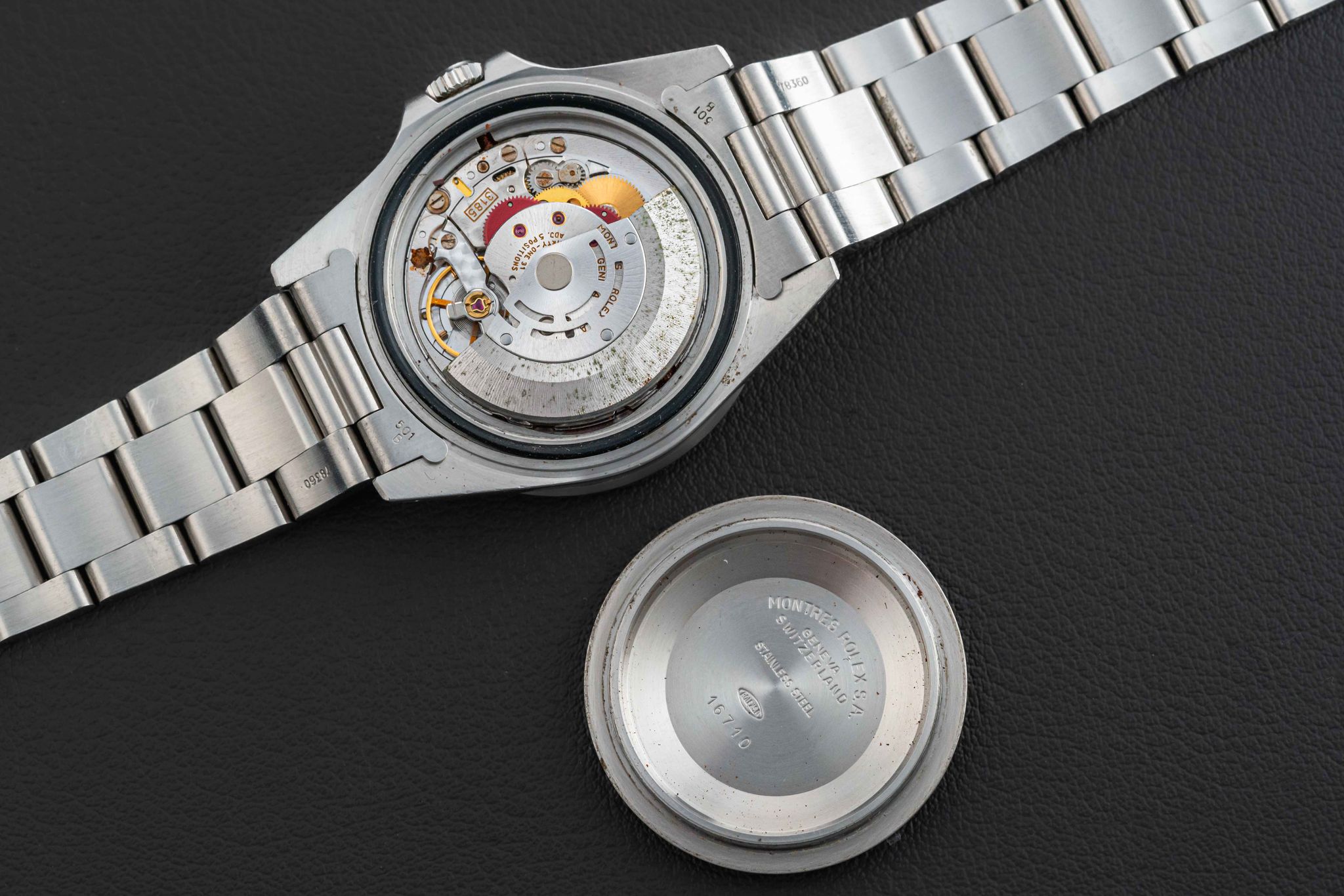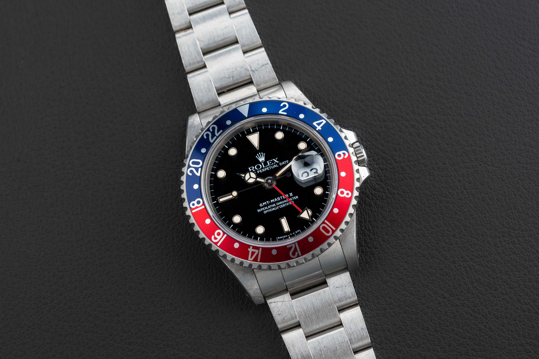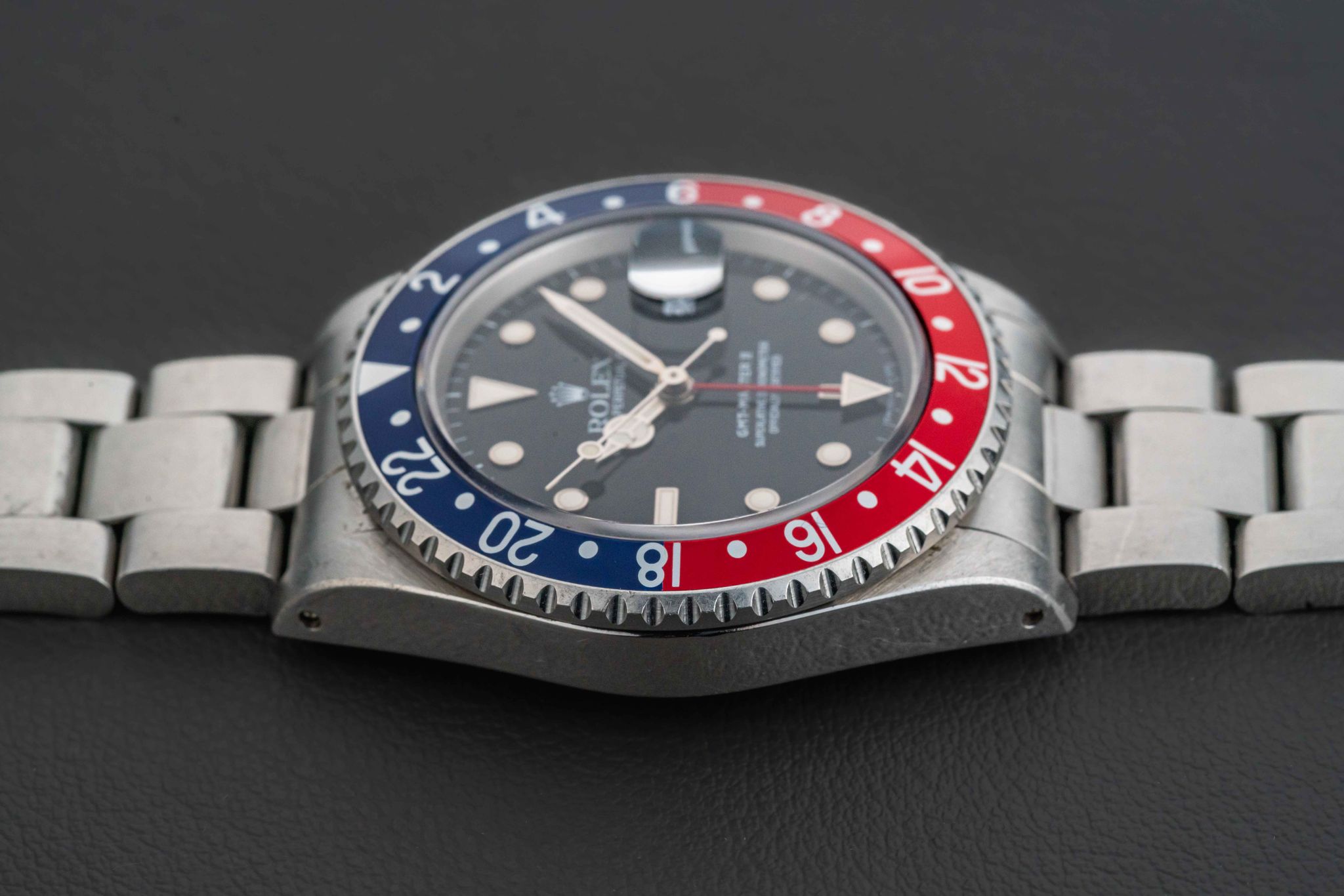 Offered here is a very nice and attractive Rolex GMT-Master II, Ref. 16710, circa 1991, complete with its original Rolex box (not pictured, but included), and “punched” Guarantee Certificate (originally sold in Guam in 1992). This example is in great neo-vintage condition. The case appears unpolished with normal wear from use, with original and sharp beveled edges, and still old remnants of the original caseback sticker (can be removed upon request). The dial is free of damage, with no chips, marks, or scratches, and retains its factory gloss. The original lume is present in both dial and hands, with no loss, aged to a nice off-white color. Finally, the watch comes fitted with a “Pepsi” (red and blue) GMT bezel insert. The watch comes fitted on a 78790 bracelet with 501B endlinks; the bracelet has 11 full links and no stretch.
