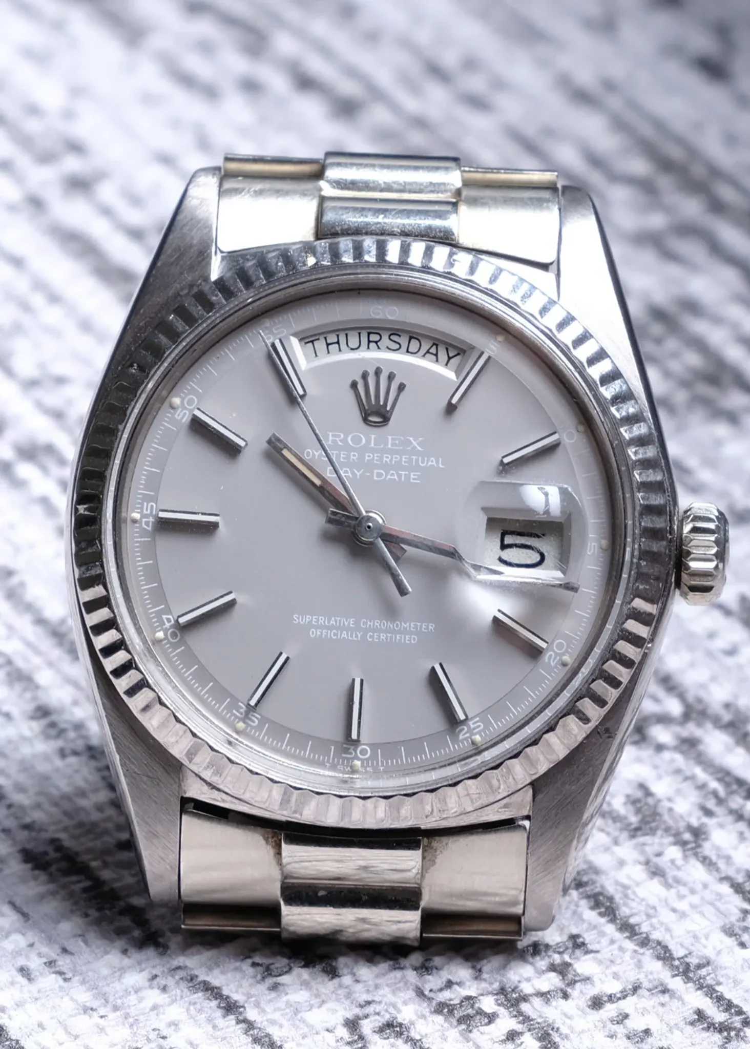 Here we have the vintage Rolex Day Date with an ultra-rare ghost grey dial in 18kt white gold from 1973. What makes this dial so special is how all the white text disappears into the light grey dial when turned slightly on an angle with only the Rolex coronet showing at 12 O’clock which gives it that ghost effect.