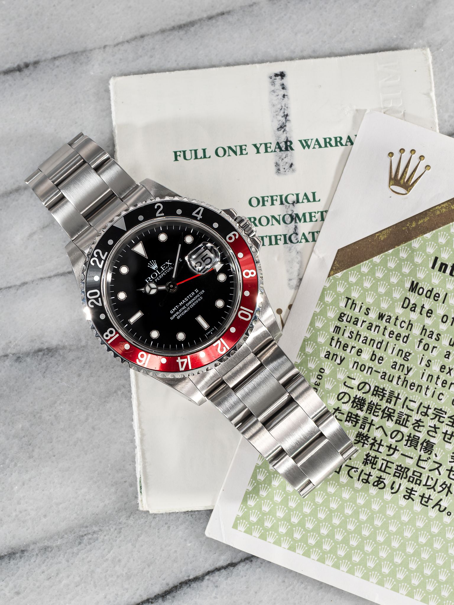Here's a vintage Rolex GMT reference 16710 automatic from 1997 (U serial) with a black and red “Coke”. It comes with its original papers. Quickset date function at 3 o’clock. Measurements include a 40mm case and 20mm lug width. Oyster bracelet fits up to a 7 inch wrist. Ready to wear. All parts including the crown, dial, movement, and caseback are original.