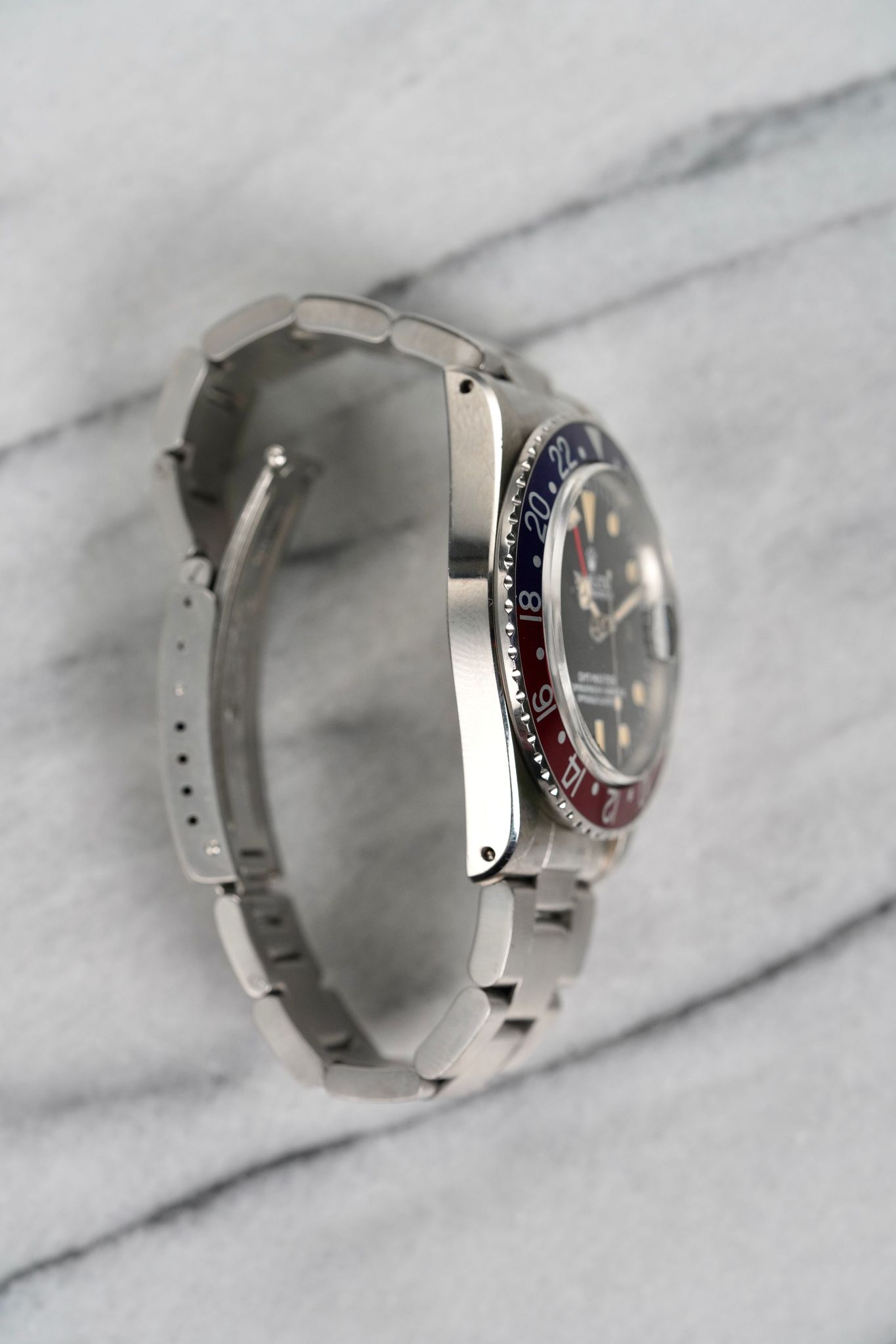 Here's a Rolex GMT Pepsi reference 1675 with a blue and red bi-directional rotating bezel from the 1970s. Keeps great time and is fully functional. Measurements include a 40mm ase and 20mm lug width. On its original oyster bracelet that fits up to a 7.25 inch wrist. Holes case. Black Dial. Features include GMT hand and non quick date function at 3 a clock. Nice patina in both the hands and hour markers. All parts are original including the crown, dial, movement, and caseback. Both the dial and case are in great cosmetic, untouched condition.