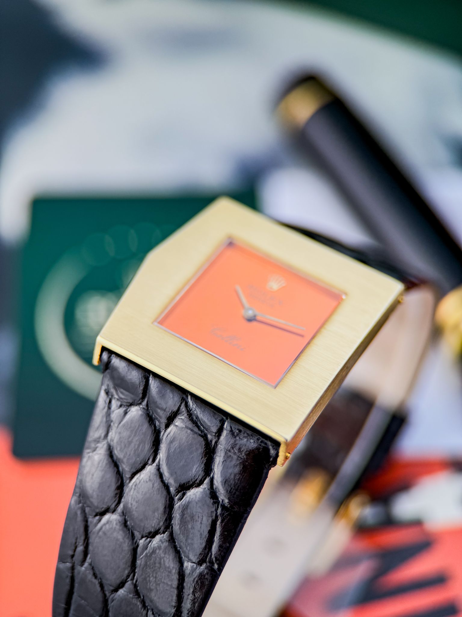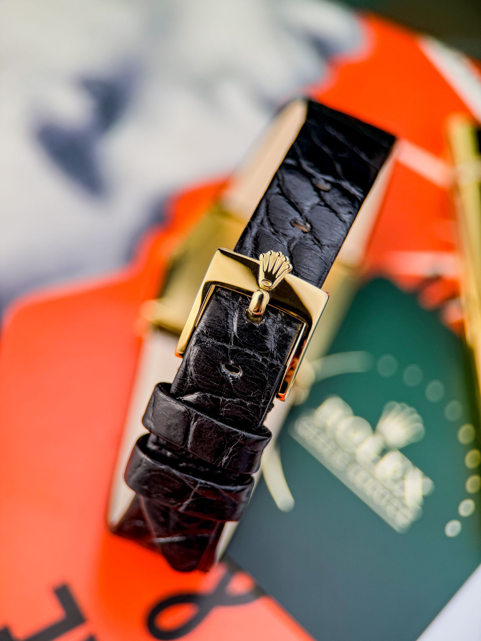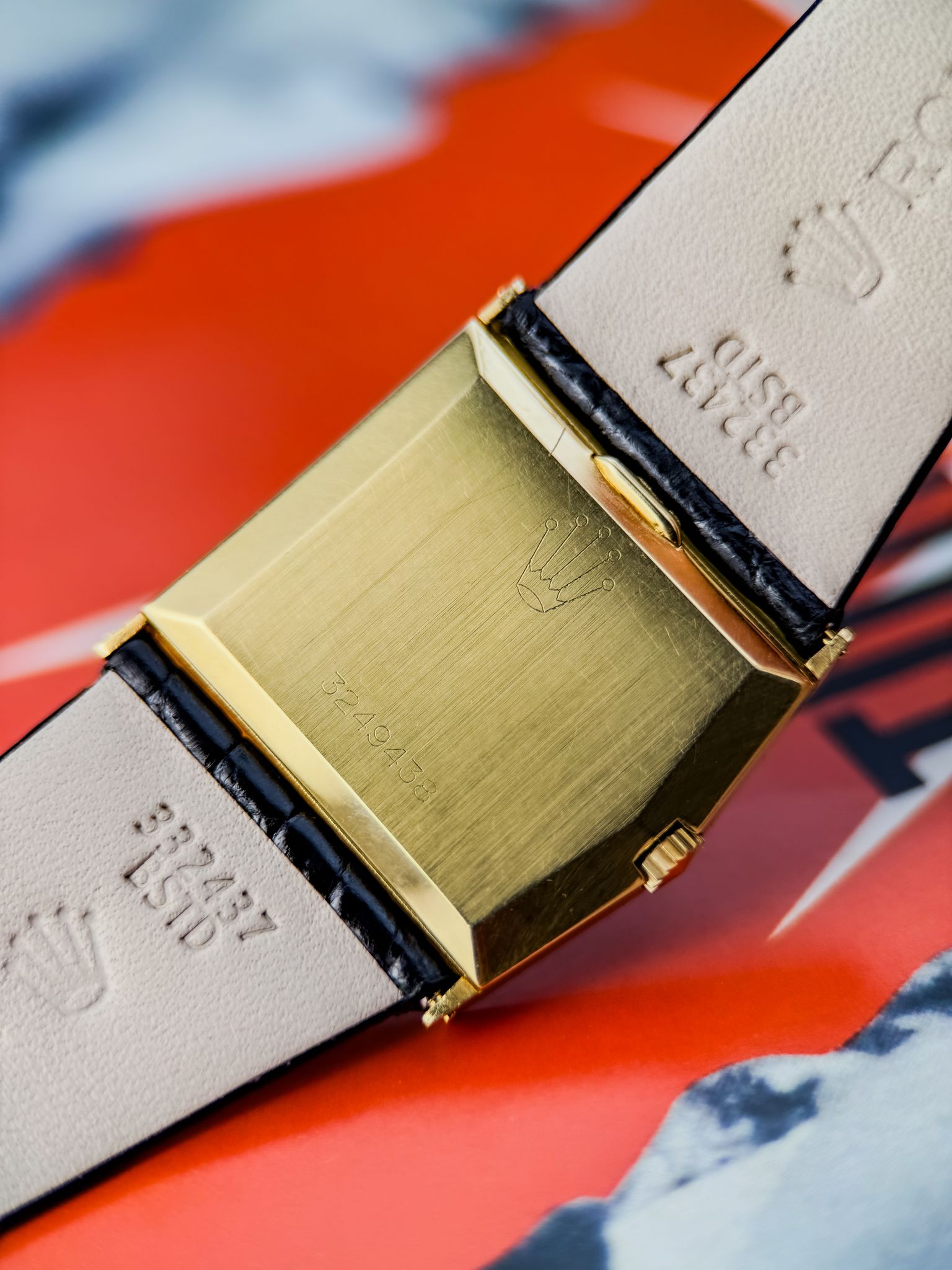 The Rolex King Midas is one of the boldest watches ever created by the brand. Introduced in 1962 under the reference 9630, it stands out with an asymmetrical solid gold case inspired by Greek architecture, and a crown positioned on the left side. Initially produced in a limited series of about 800 pieces, each watch was individually numbered. Its design is often attributed to Gérald Genta, although Rolex has never officially confirmed this.