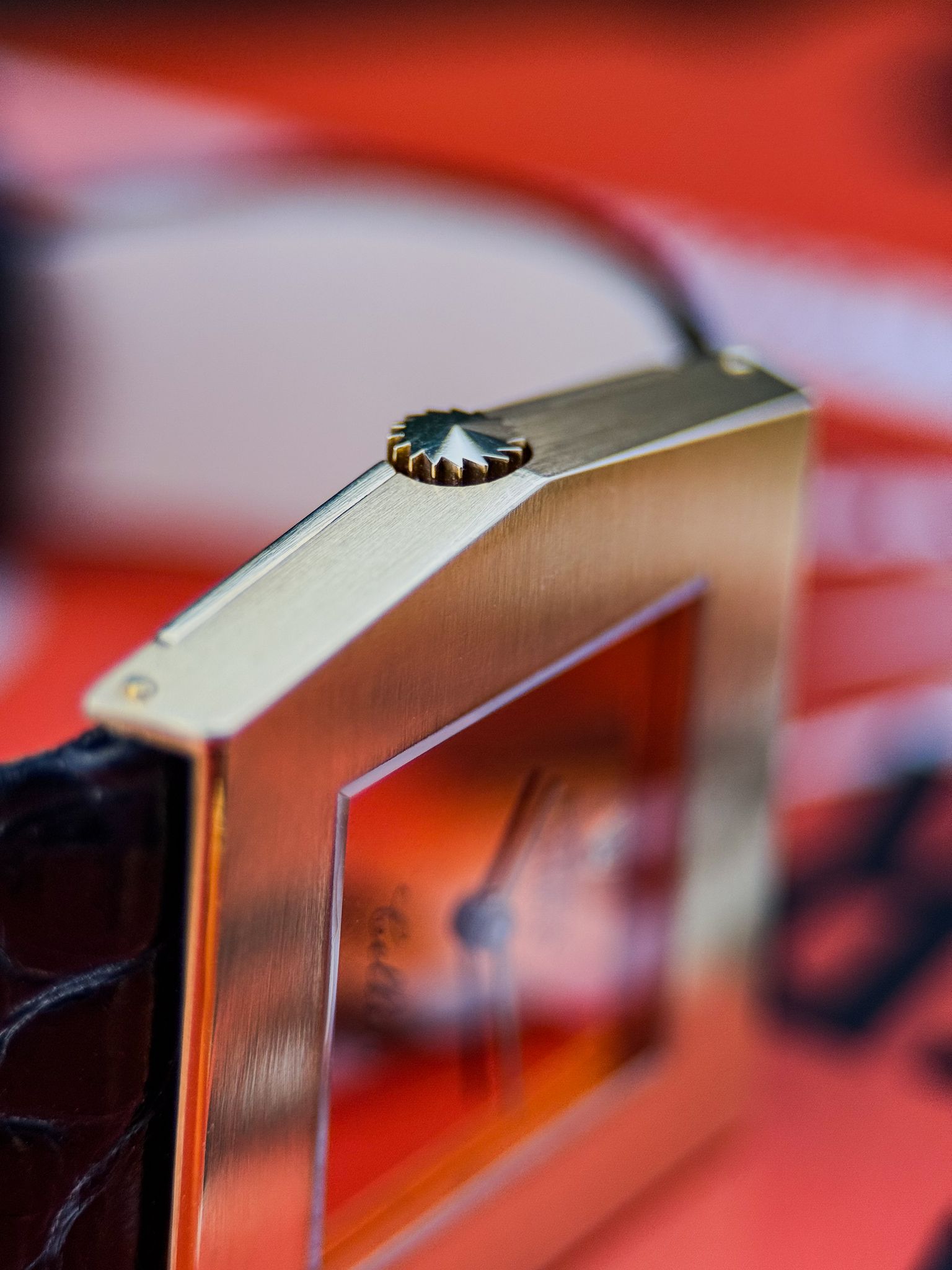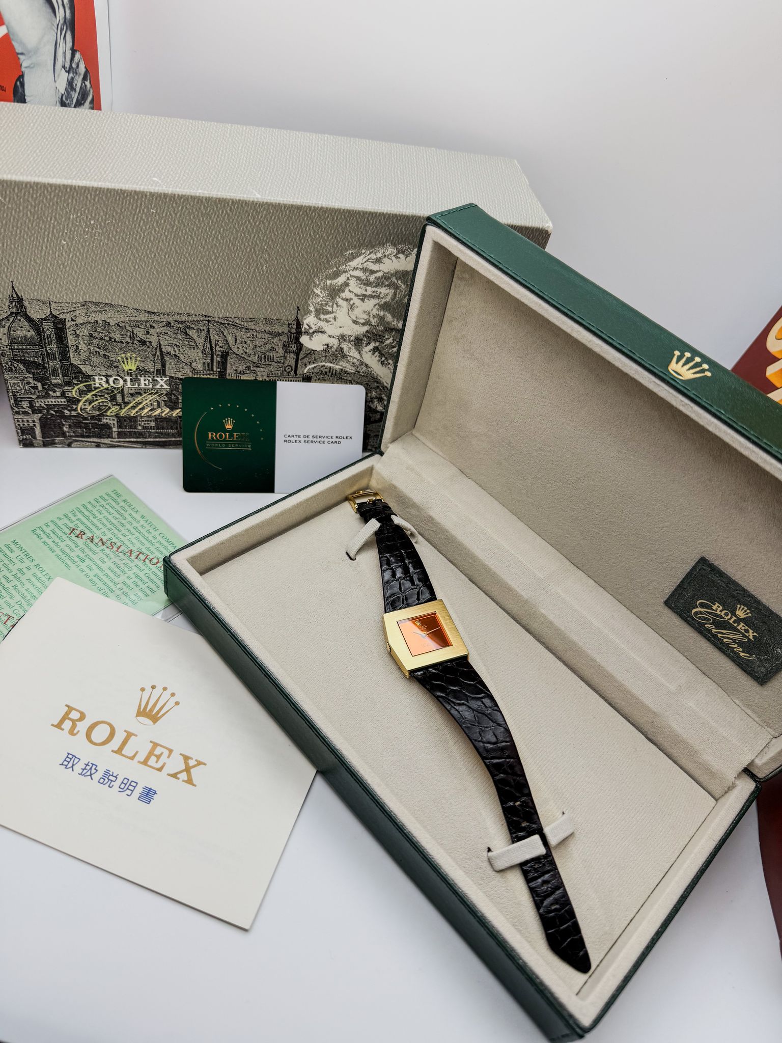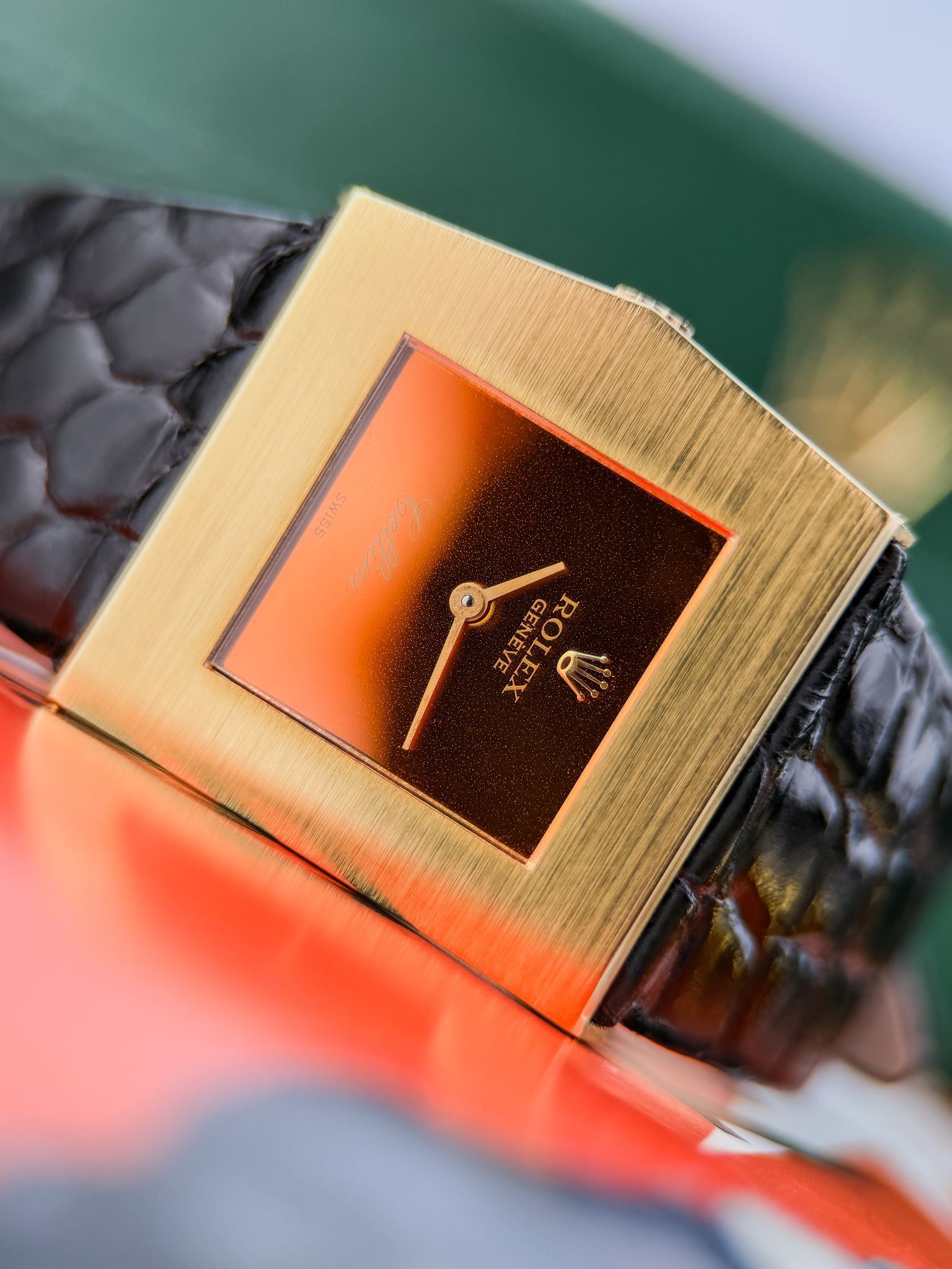 The Rolex King Midas is one of the boldest watches ever created by the brand. Introduced in 1962 under the reference 9630, it stands out with an asymmetrical solid gold case inspired by Greek architecture, and a crown positioned on the left side. Initially produced in a limited series of about 800 pieces, each watch was individually numbered. Its design is often attributed to Gérald Genta, although Rolex has never officially confirmed this.