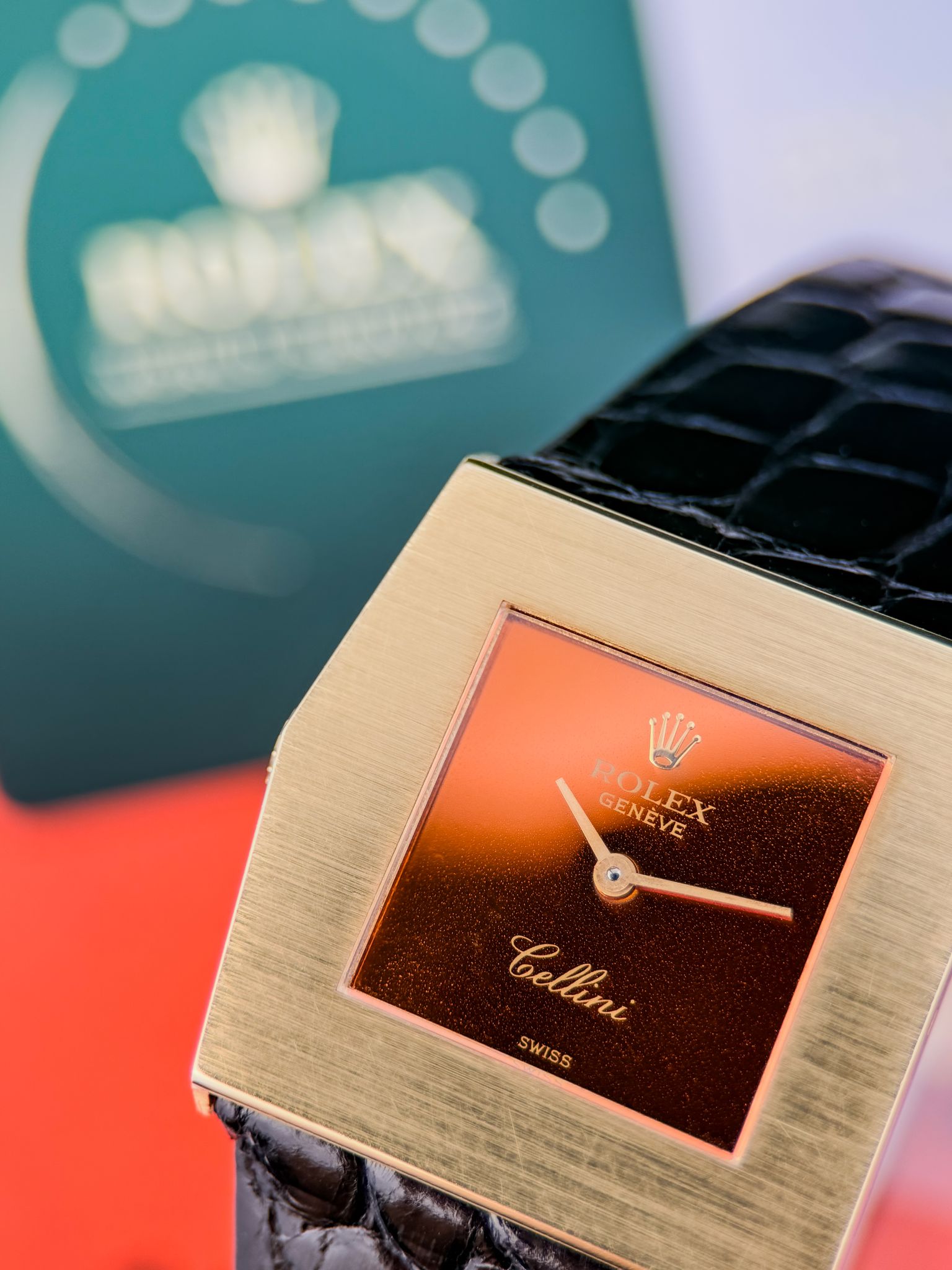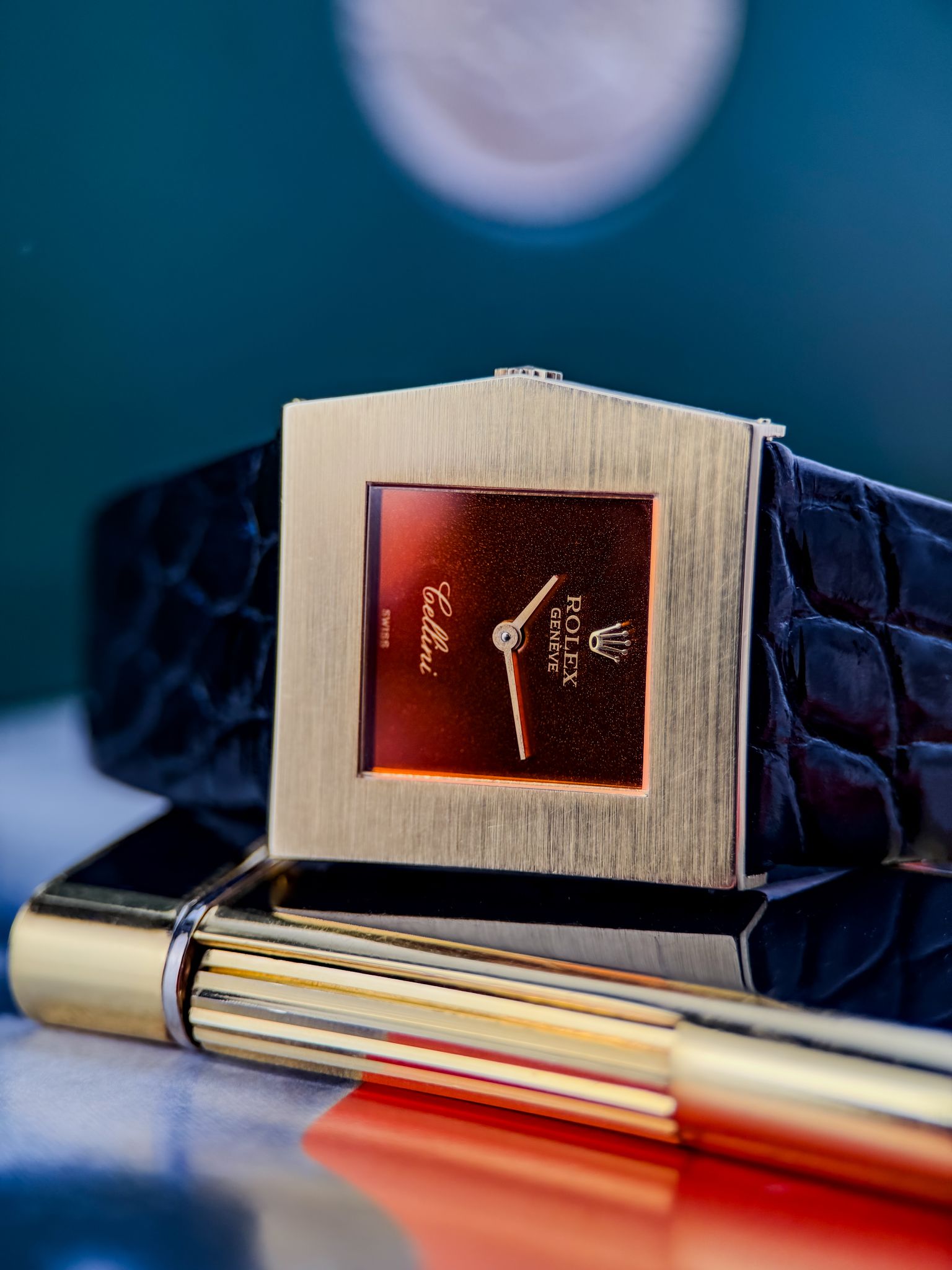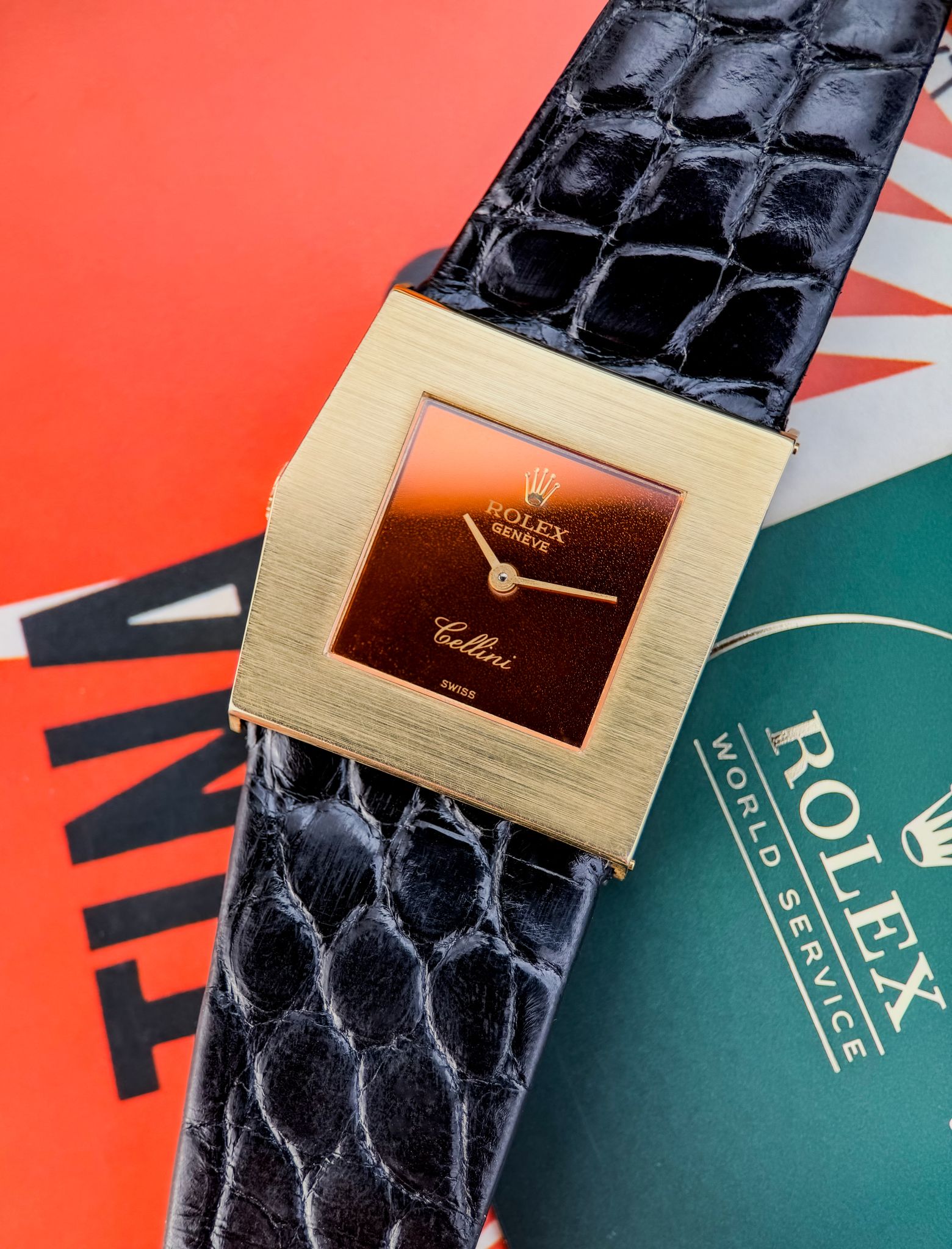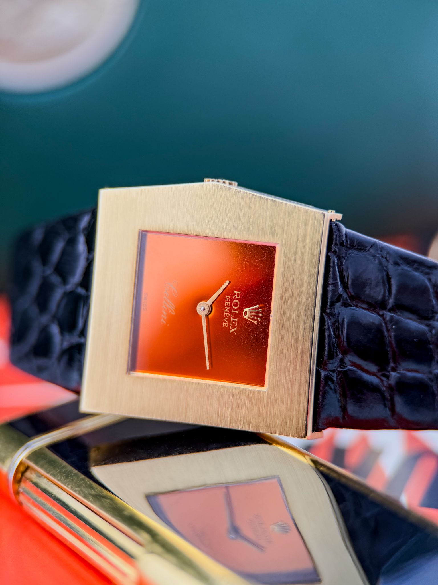 In 1973, Rolex released the reference 4017/8, an evolution of the King Midas integrated into the Cellini collection. This version keeps the iconic asymmetrical case but features a leather strap with a Rolex buckle, offering a more refined alternative while maintaining the characteristic elegance of the Midas line. The sunburst brown dial and manual-winding caliber 1600 complete this rare piece, produced in very limited quantities.