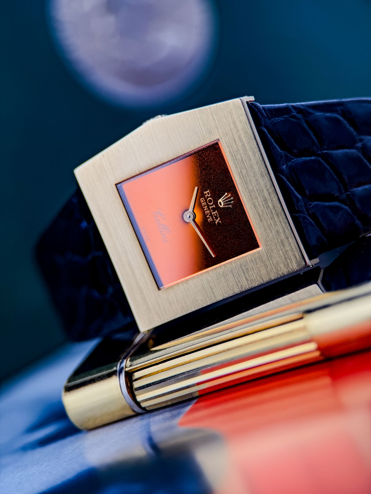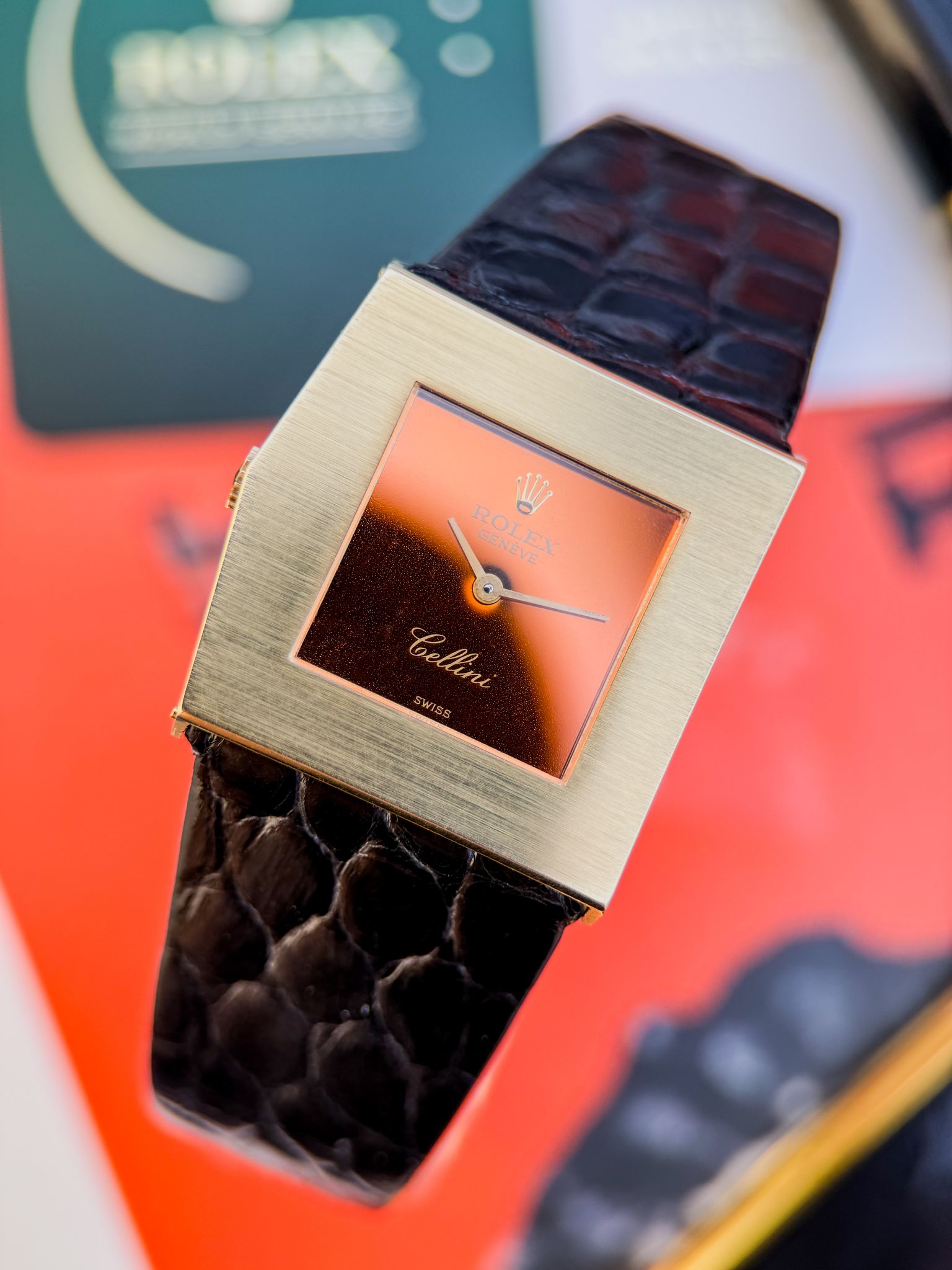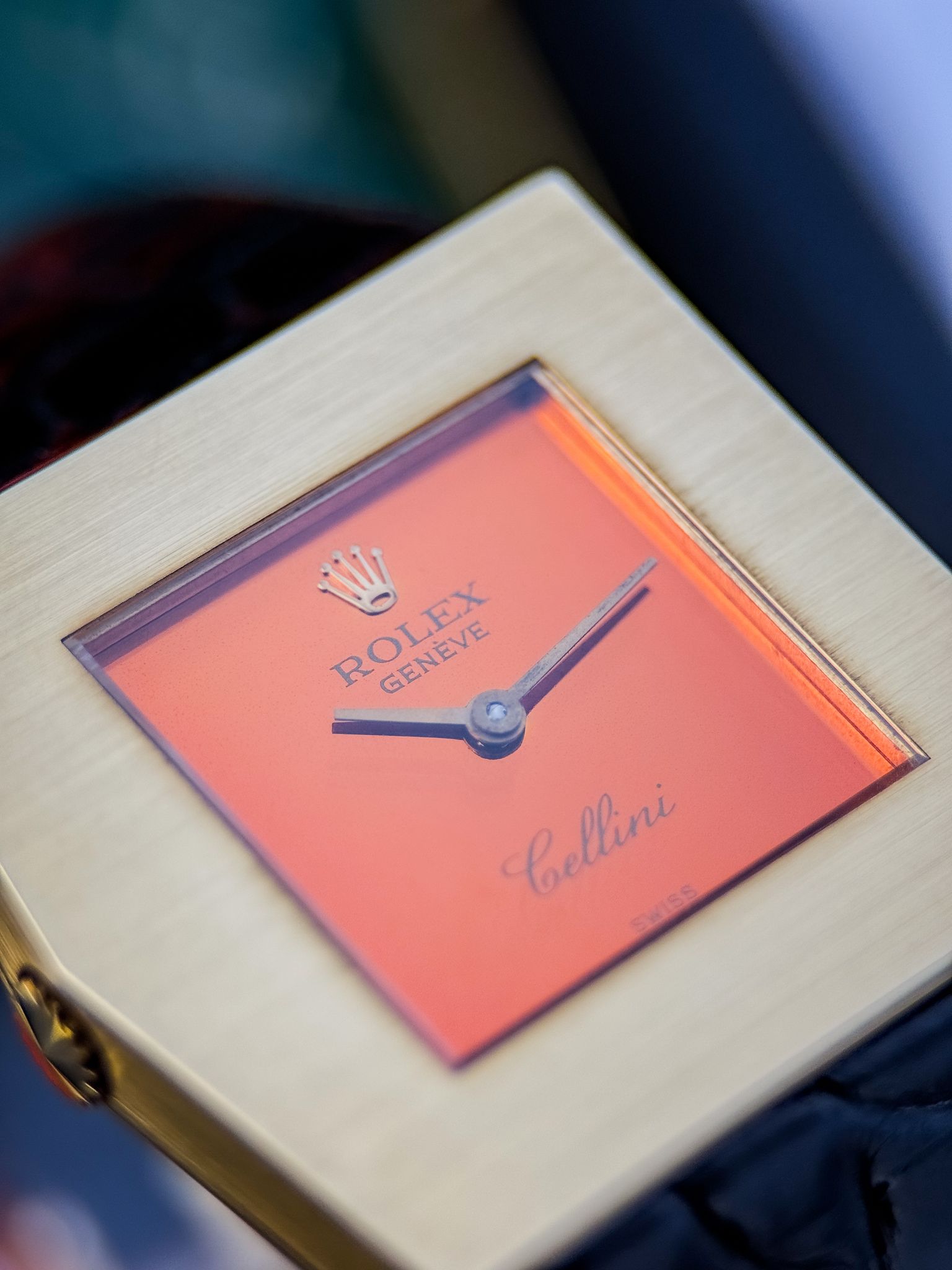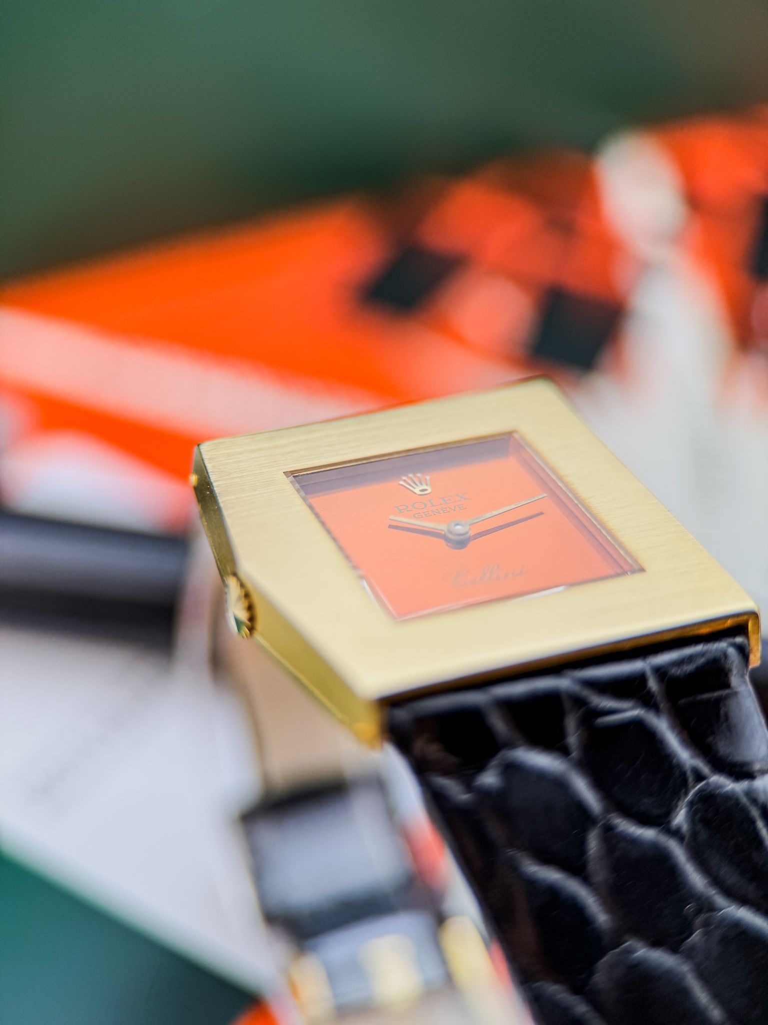In 1973, Rolex released the reference 4017/8, an evolution of the King Midas integrated into the Cellini collection. This version keeps the iconic asymmetrical case but features a leather strap with a Rolex buckle, offering a more refined alternative while maintaining the characteristic elegance of the Midas line. The sunburst brown dial and manual-winding caliber 1600 complete this rare piece, produced in very limited quantities.