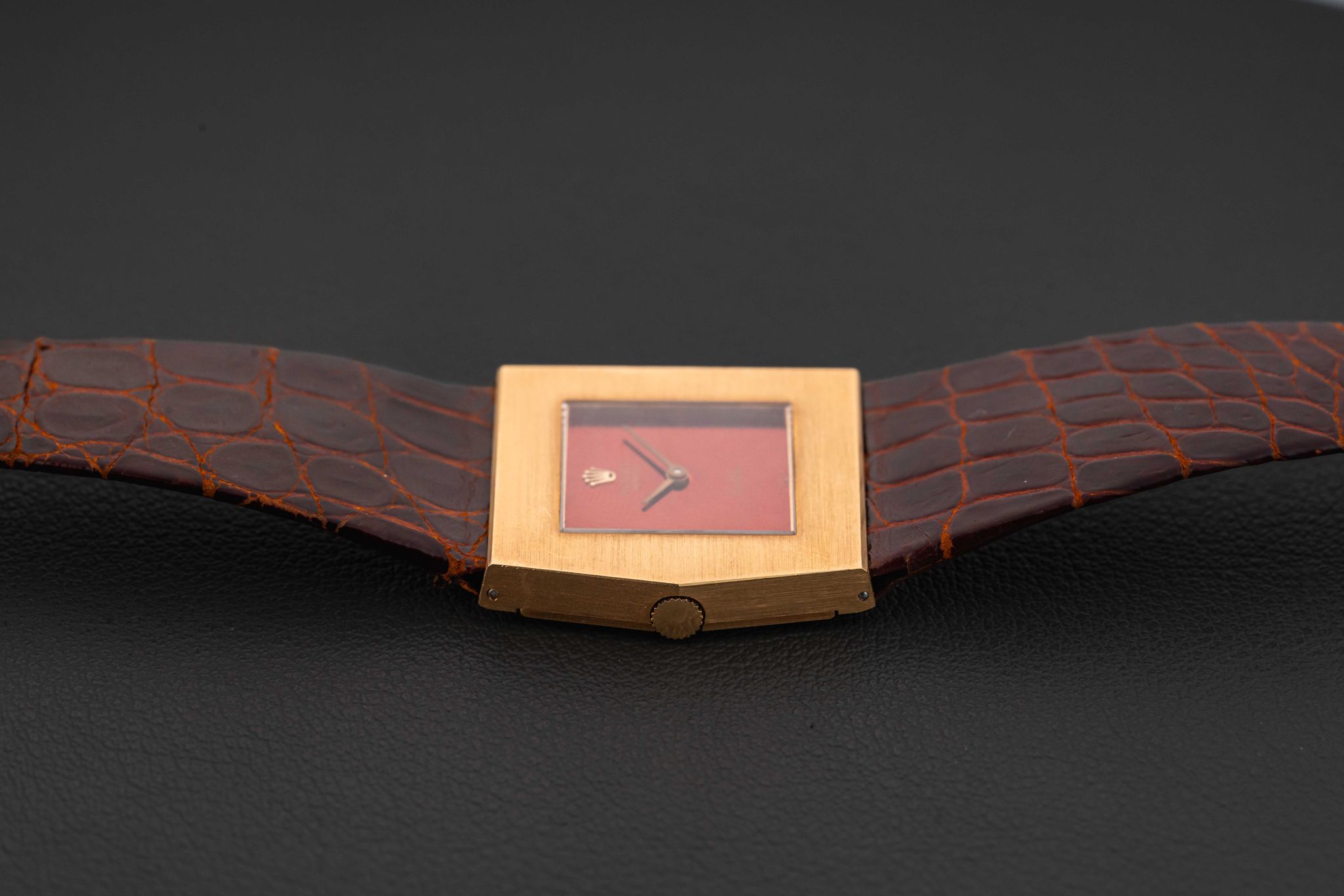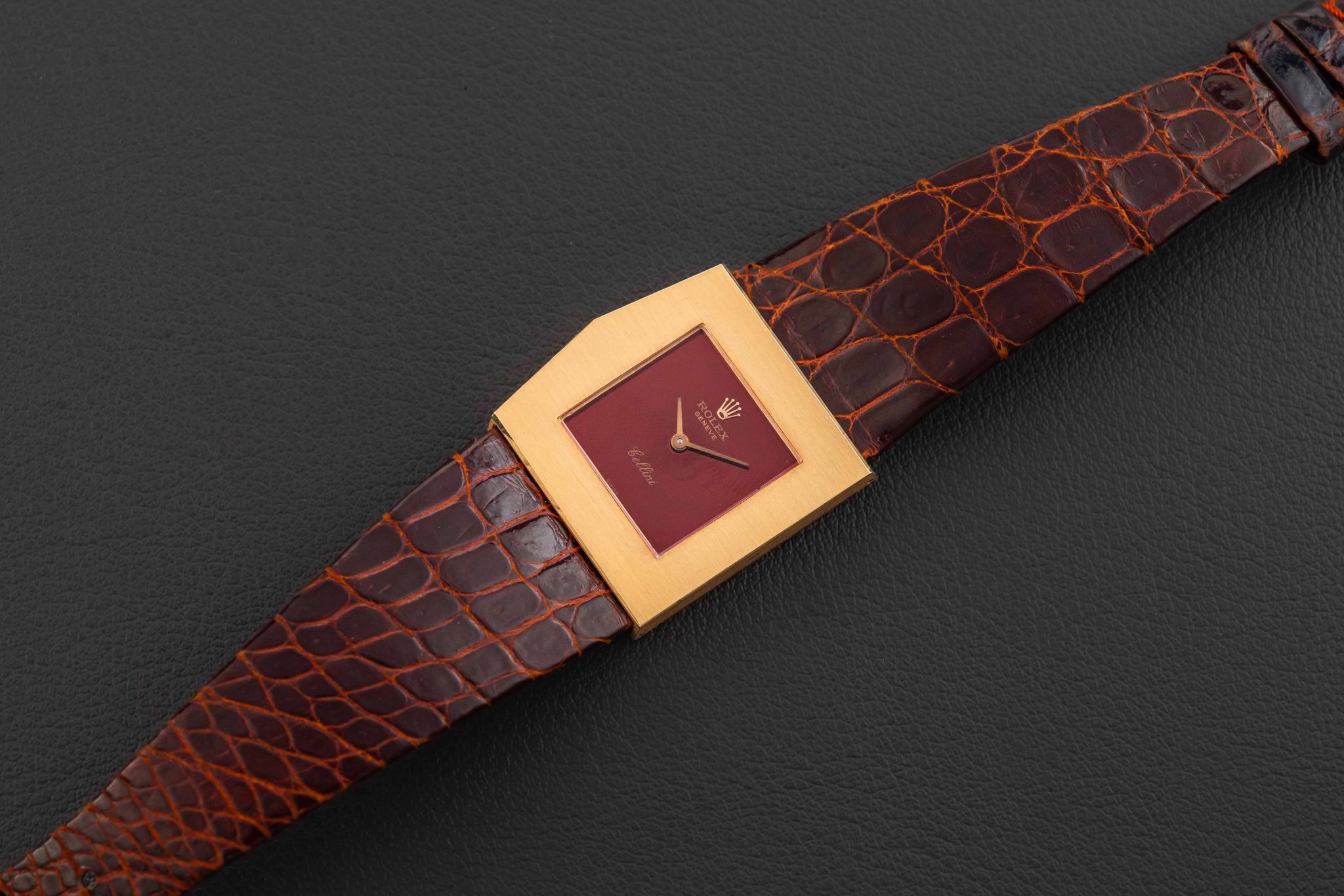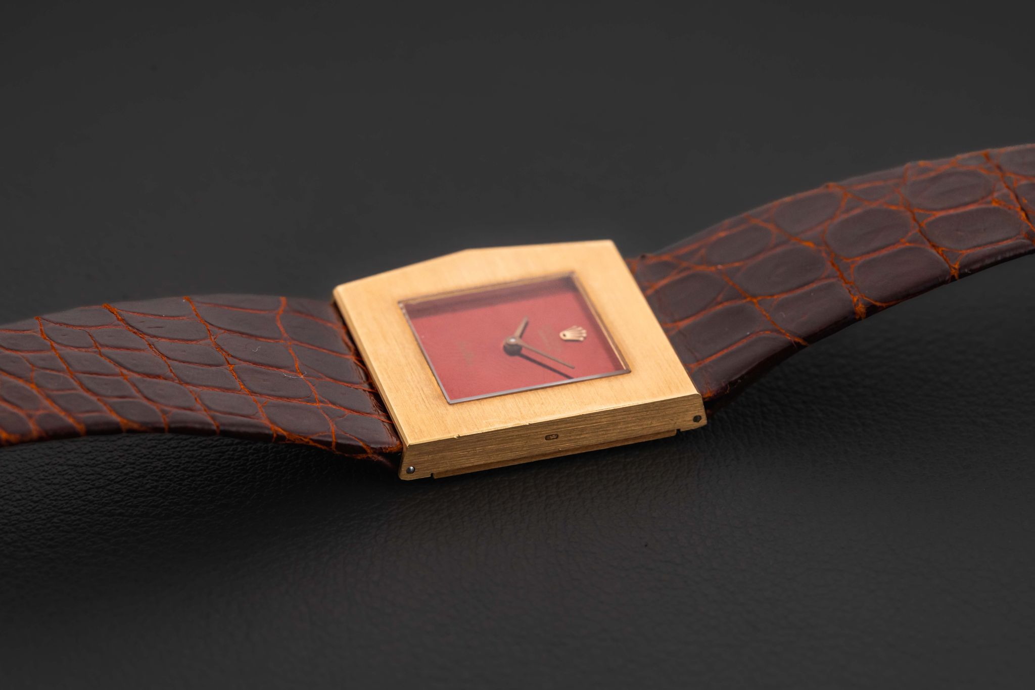Up for grabs is a quirky Rolex King Midas, from their later asymmetrical Cellini line, given the reference 4017, and produced circa 1972. This Rolex King Midas-Cellini is fitted in a solid 18kt yellow gold case and with a striking mirror-finish burgundy dial. The condition of this Rolex King Midas is great, remaining unpolished with its original caseback sticker; the dial shows extremely light aging. Finally, the watch comes fitted on its original Rolex leather strap and matching Rolex gold buckle.