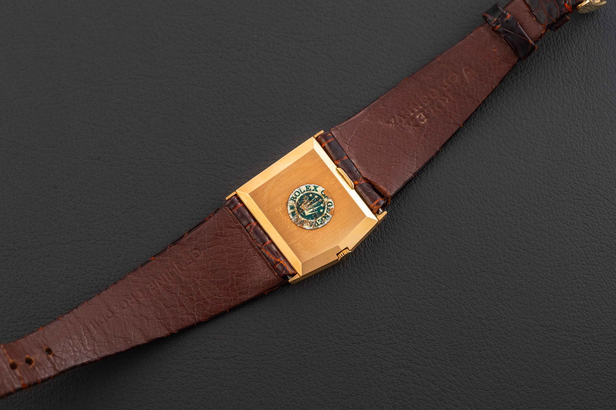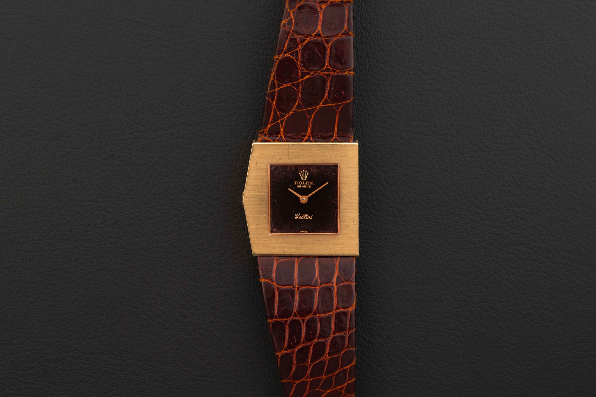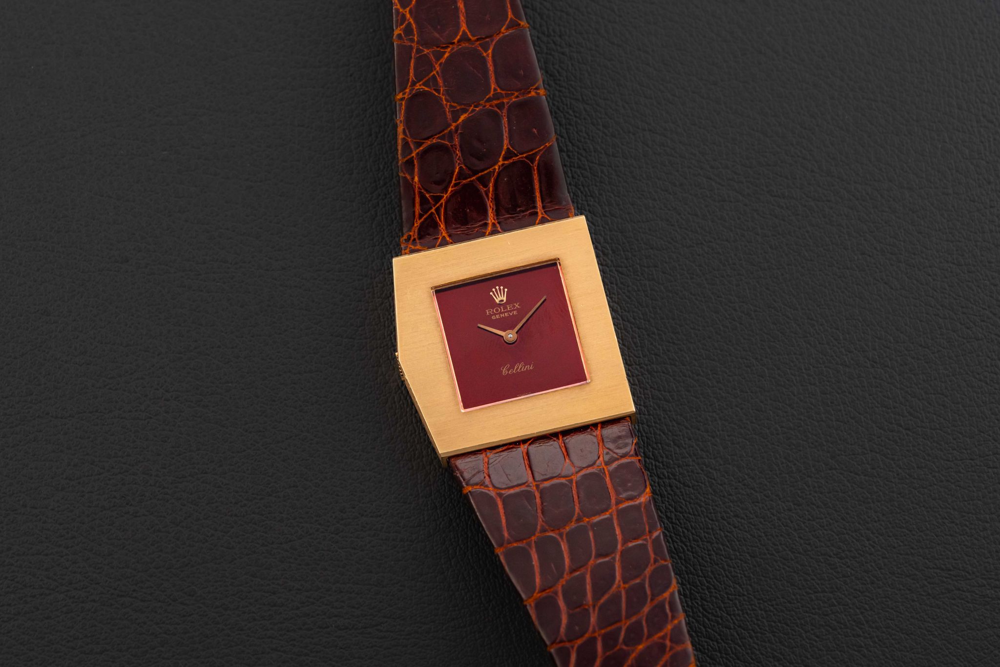 Up for grabs is a quirky Rolex King Midas, from their later asymmetrical Cellini line, given the reference 4017, and produced circa 1972. This Rolex King Midas-Cellini is fitted in a solid 18kt yellow gold case and with a striking mirror-finish burgundy dial. The condition of this Rolex King Midas is great, remaining unpolished with its original caseback sticker; the dial shows extremely light aging. Finally, the watch comes fitted on its original Rolex leather strap and matching Rolex gold buckle.
