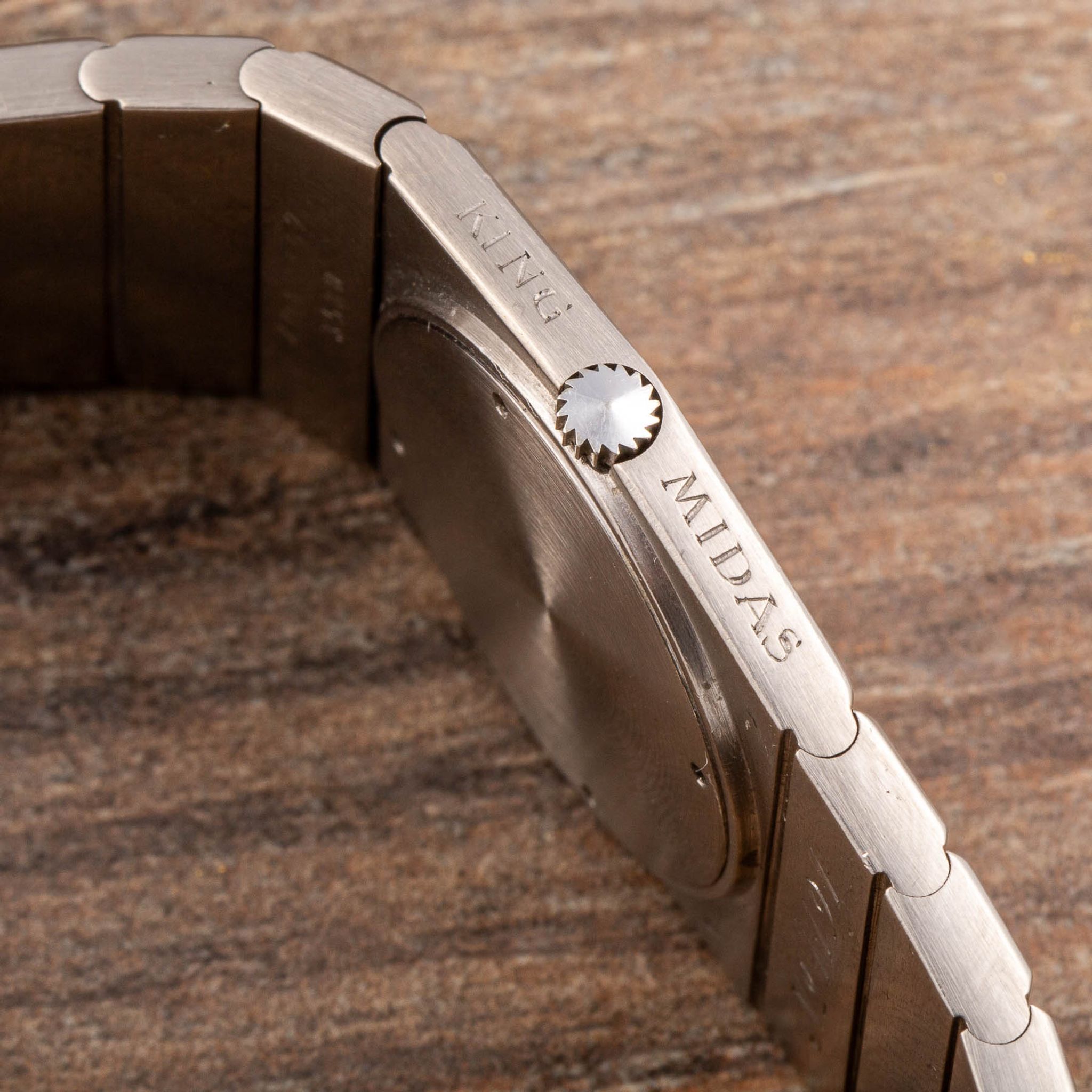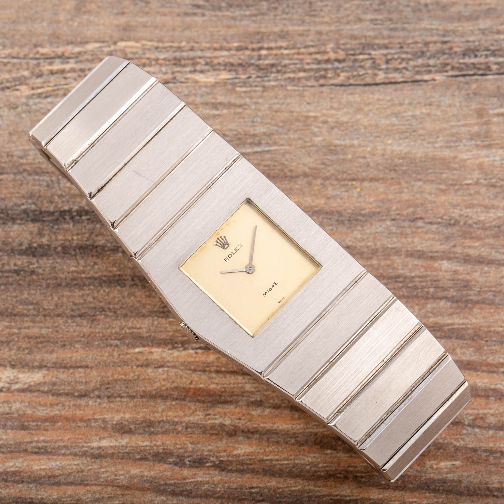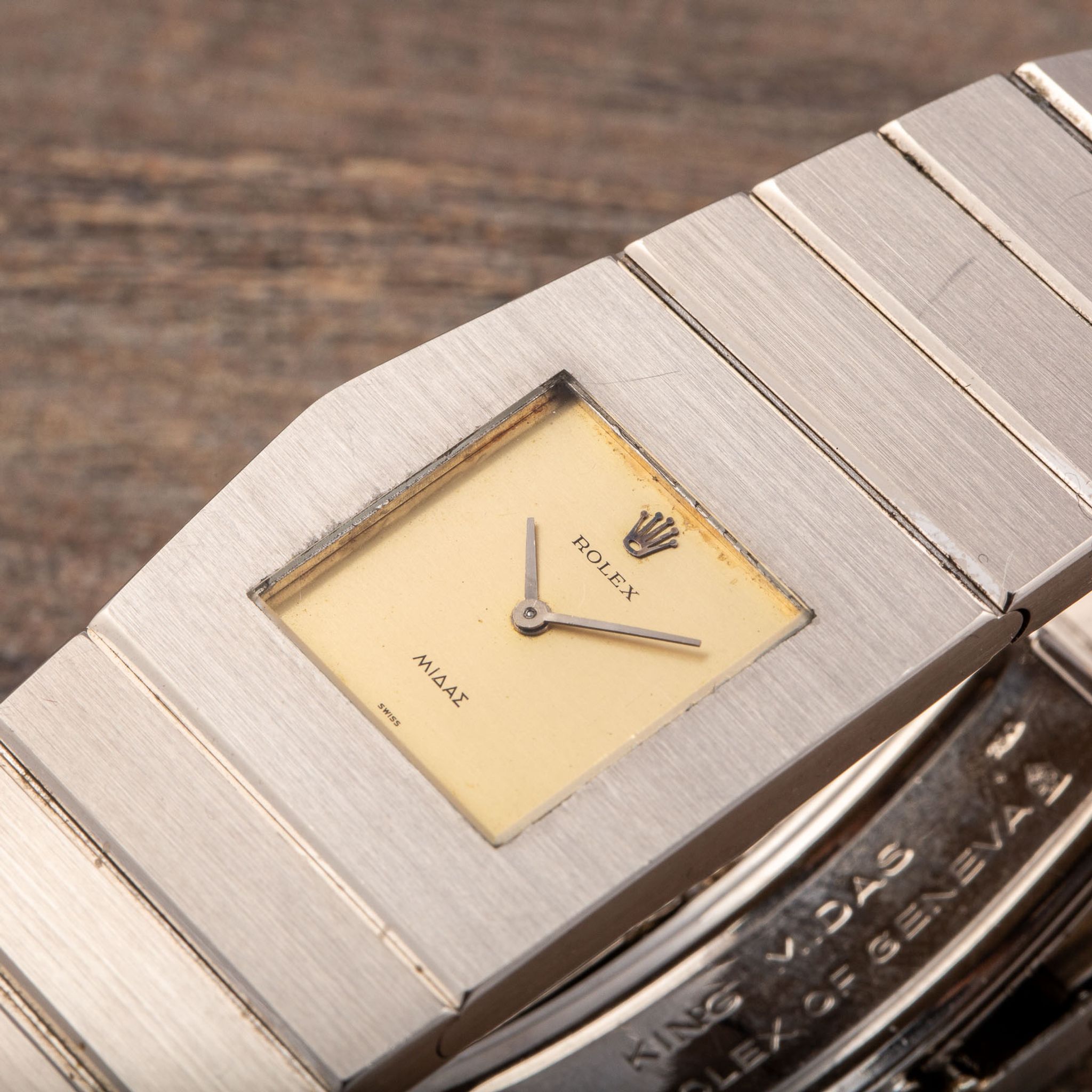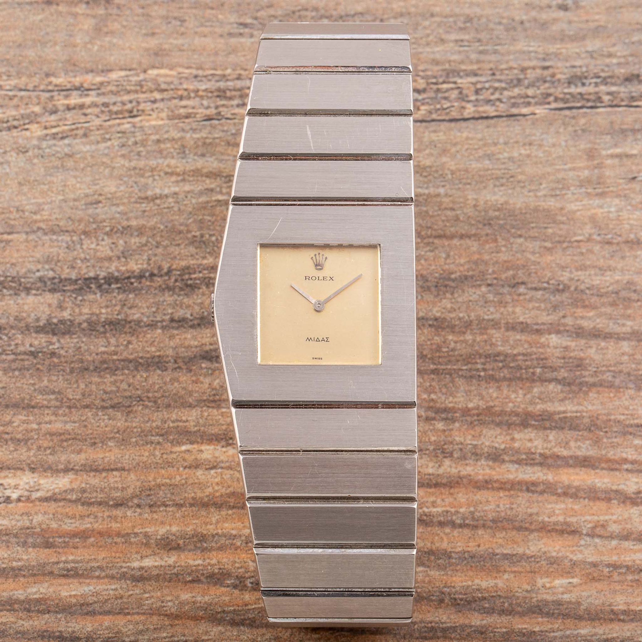 The Rolex King Midas reference 3580 was the second model marketed in the iconic Rolex King Midas series. Manufactured from the early 1960s, this model bears the creative touch of its designer, the master himself: Gerald Genta. Drawing inspiration from ancient Greek aesthetics, Genta crafted the watch case to echo the silhouette of the Parthenon, while the left-sided winding crown symbolizes the sun atop Mount Olympus, adding a distinctive flair. An exceptional aspect of the Rolex King Midas is its original box set, which also reflects the ancient Greek theme. The outer box features typical Greek decorations and figures, shaped like an urn with printed pictograms reminiscent of authentic Greek artifacts. Reference 3580 gradually replaced the original reference 9630, with minor differences such as the gradual replacement of “Midas” on the dial with “Cellini.” However, some examples of the 9630 retain the “Midas” wording on the dial, making them particularly special, like the present example.