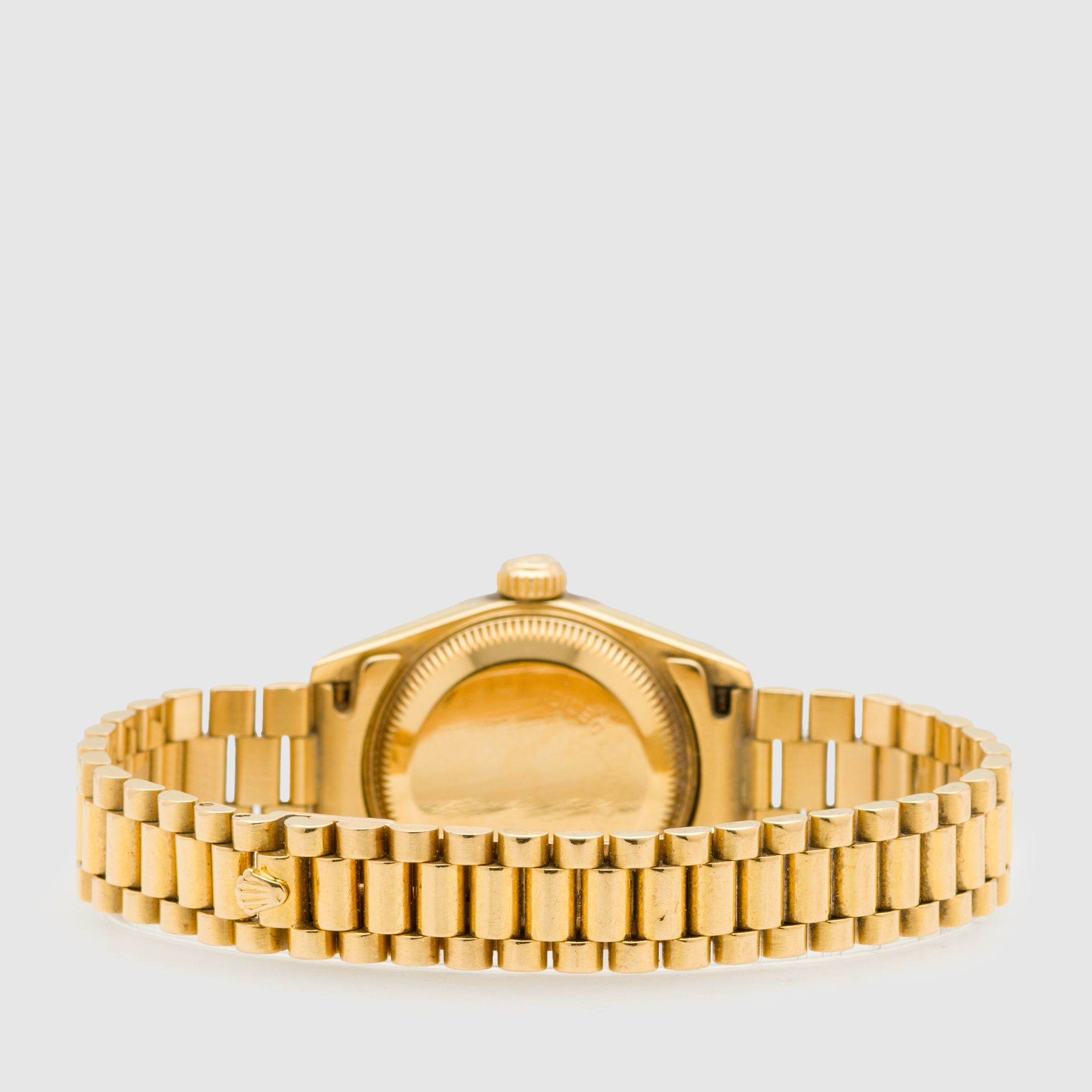Bracelet/Strap: Matching Ladies President bracelet showing moderate wear from age. The bracelet is long with 36 links.