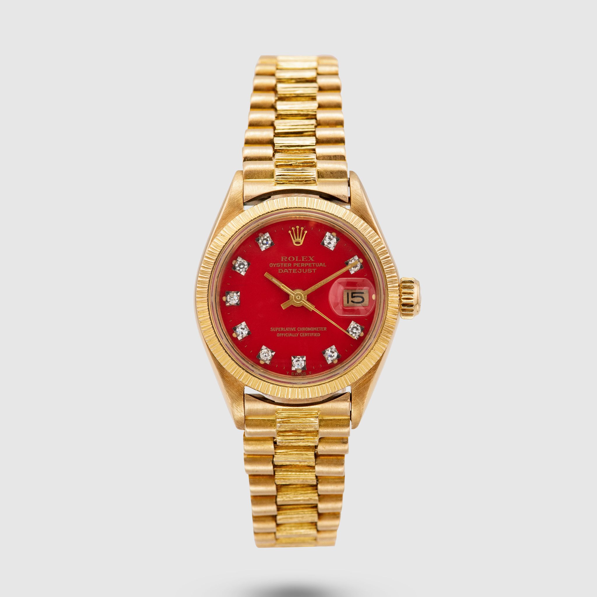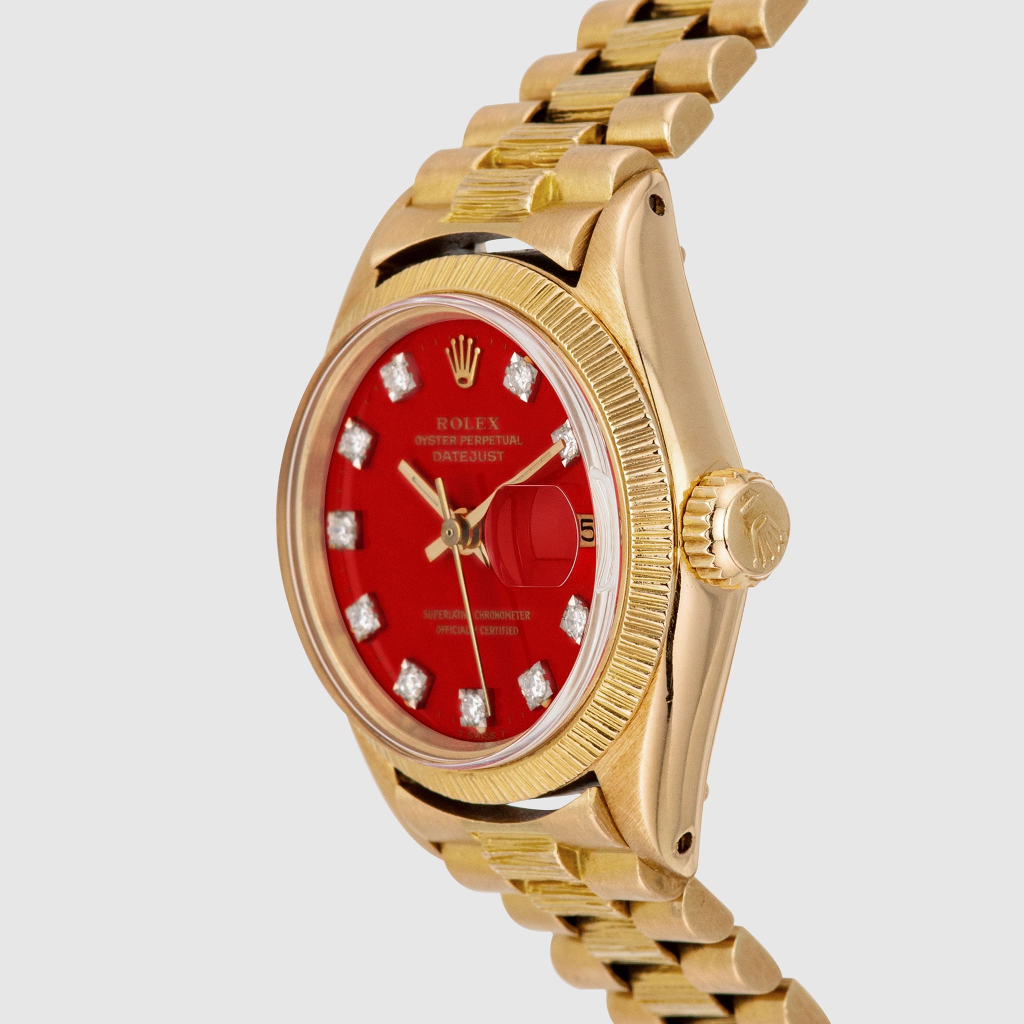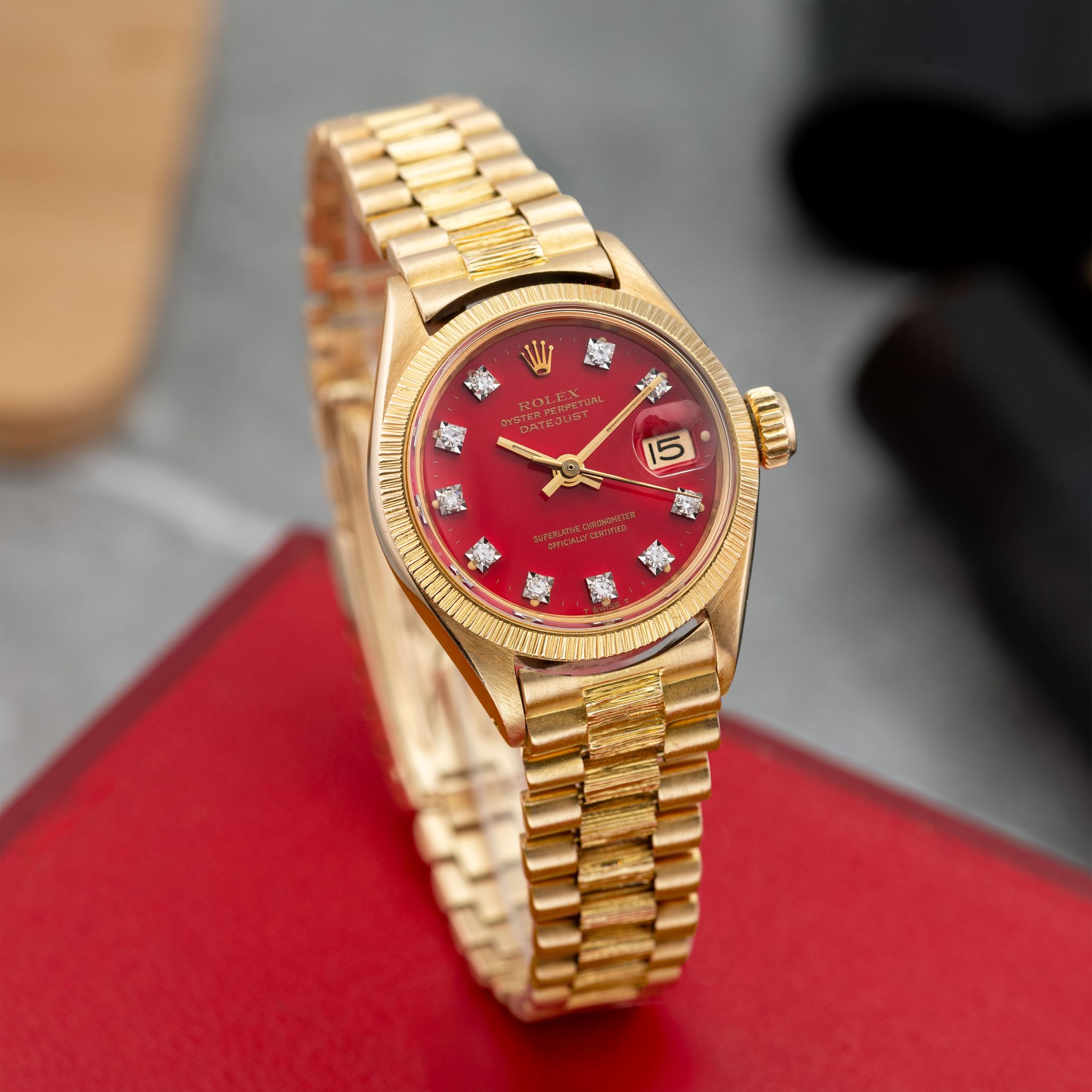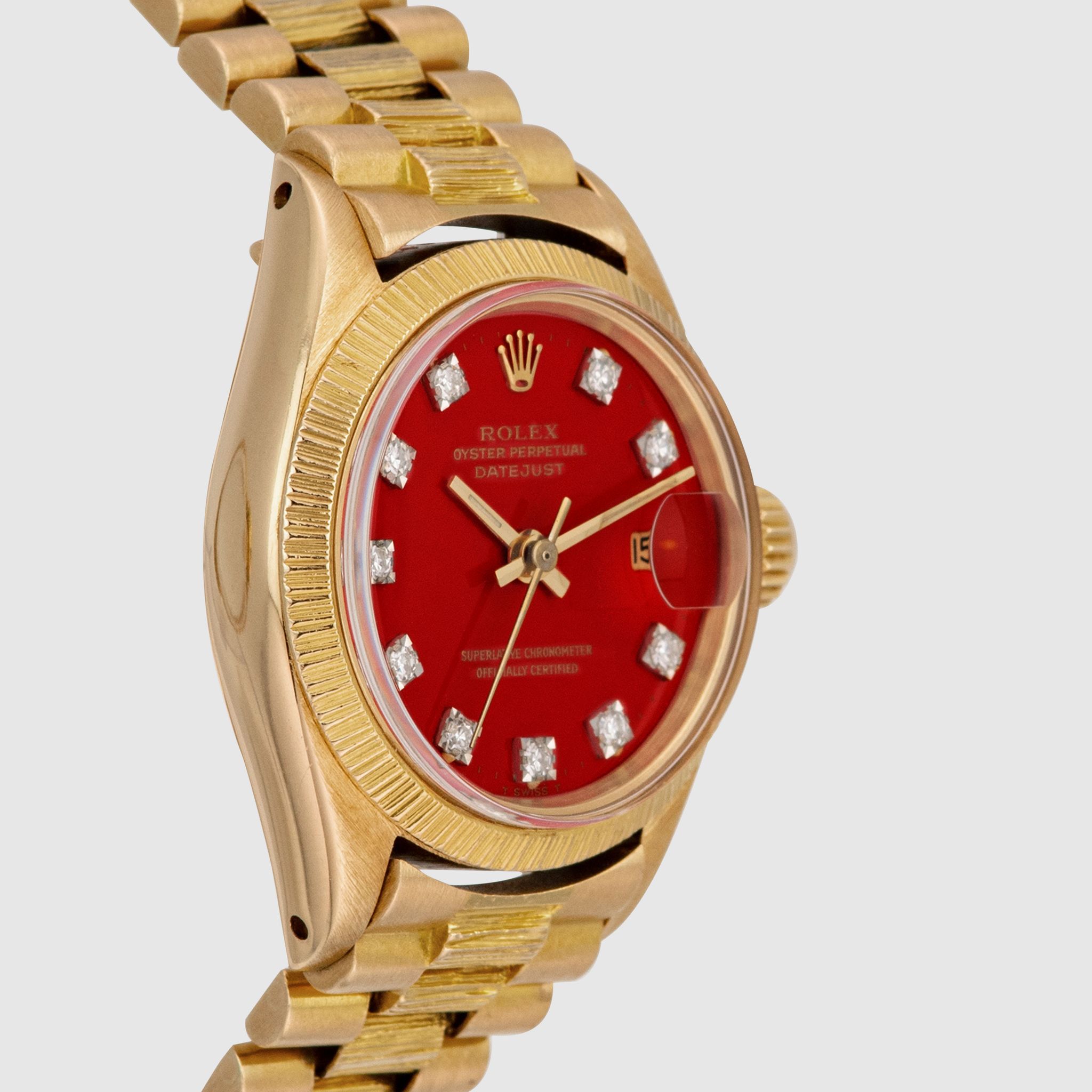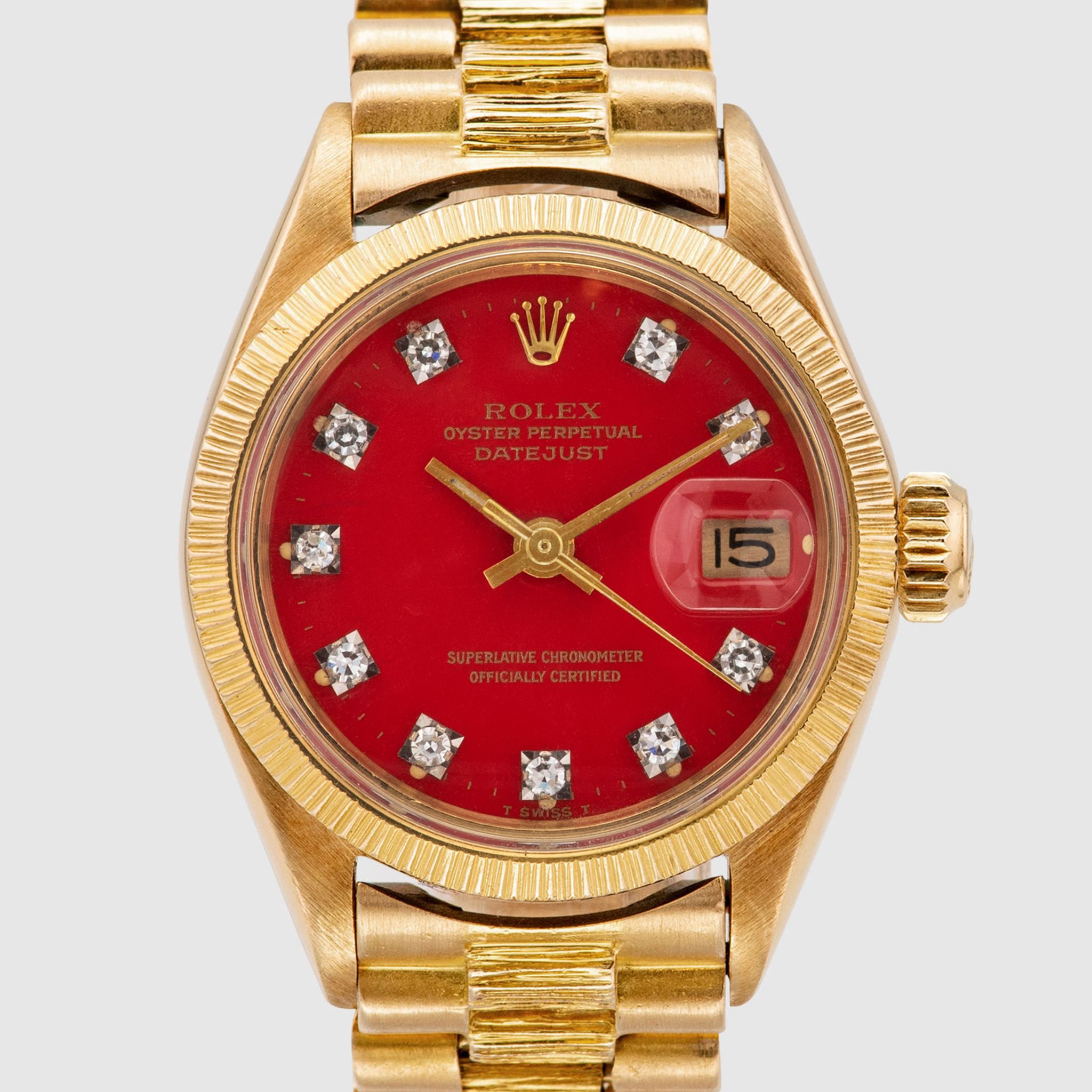 This exquisite Rolex Lady Datejust Ref. 6927 in solid 18k yellow gold is a masterclass in bold vintage elegance. Produced in the early 1970s, this timepiece features the rare and highly coveted Red Stella dial — a high-gloss enamel finish in deep lacquered crimson, punctuated by diamond-set hour markers that shimmer against the bold backdrop. The combination of rich red enamel and precious stones makes this one of the most beautiful dial configurations ever fitted to the Lady Datejust series.