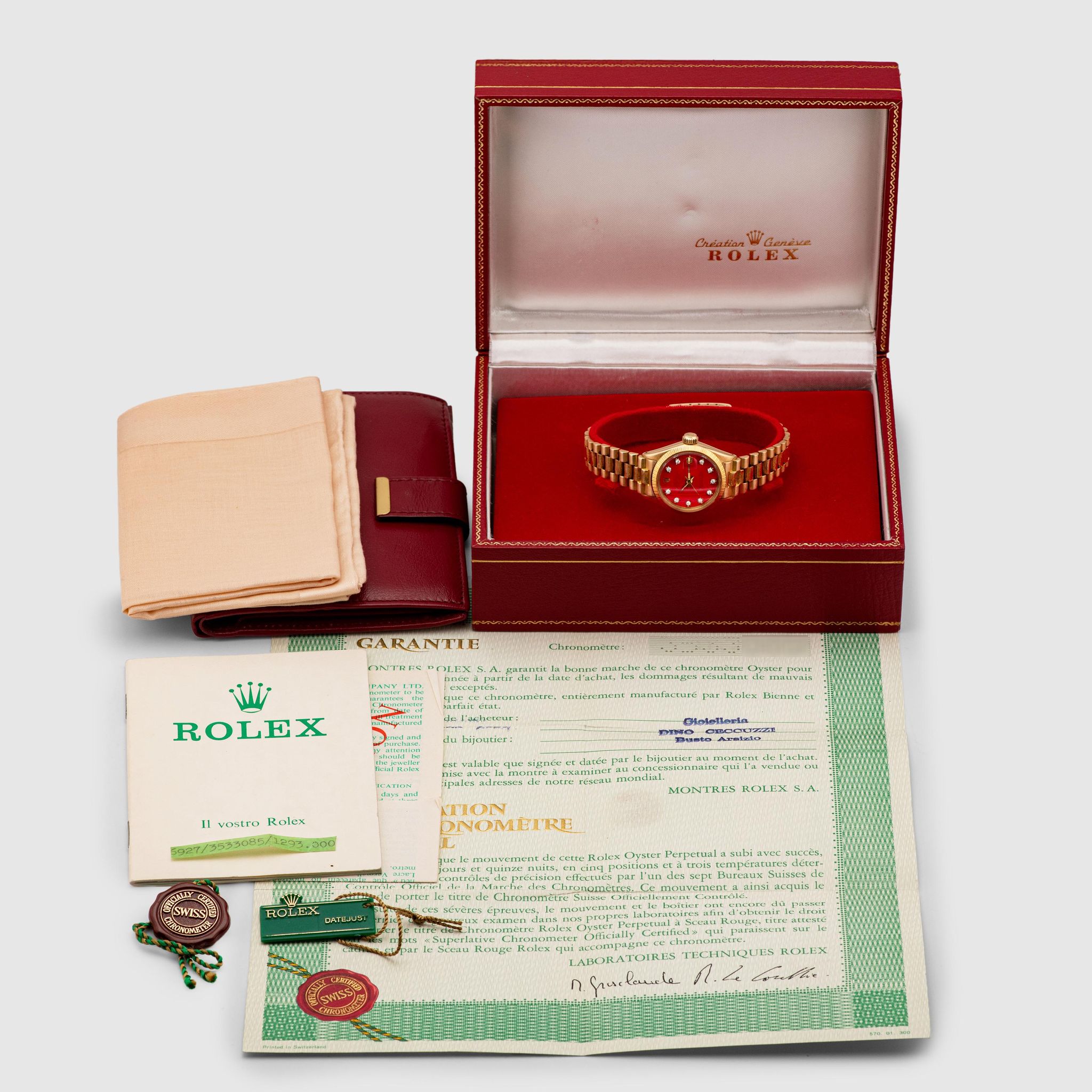 What truly sets this example apart is the full, collector-grade presentation it comes with — every detail drenched in a captivating red theme. The watch is housed in the extremely rare red Rolex box, embroidered with roses motif, perfectly echoing the boldness of the dial. Accompanying it is the original Italian-market punched warranty certificate, Rolex booklets, hang tags, vintage red ladies’ wallet and a Rolex cleaning cloth, — salute to the previous owner for keeping everything together, a beautiful set from a golden era.