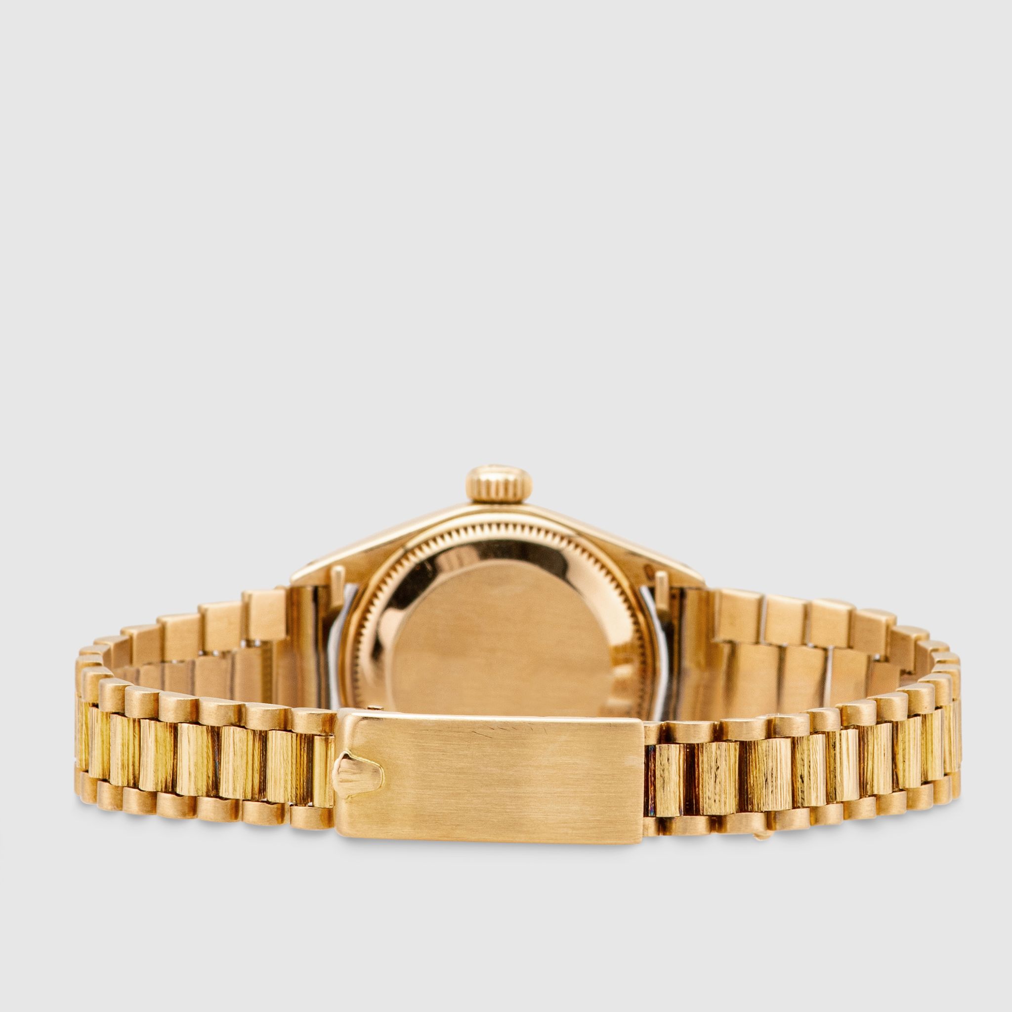 Adding to its rarity, the watch is adorned with Rolex’s distinctive “bark finish” — a textured engraving applied to both the bezel and the center links of the solid 18k gold bracelet. This artisanal finish, found only on a limited number of vintage Rolex models, evokes organic luxury and adds striking depth and contrast to the gold surfaces. The 26mm Oyster case remains in beautiful vintage condition, with sharp lugs, crisp edges, and a well-preserved dial untouched by time.