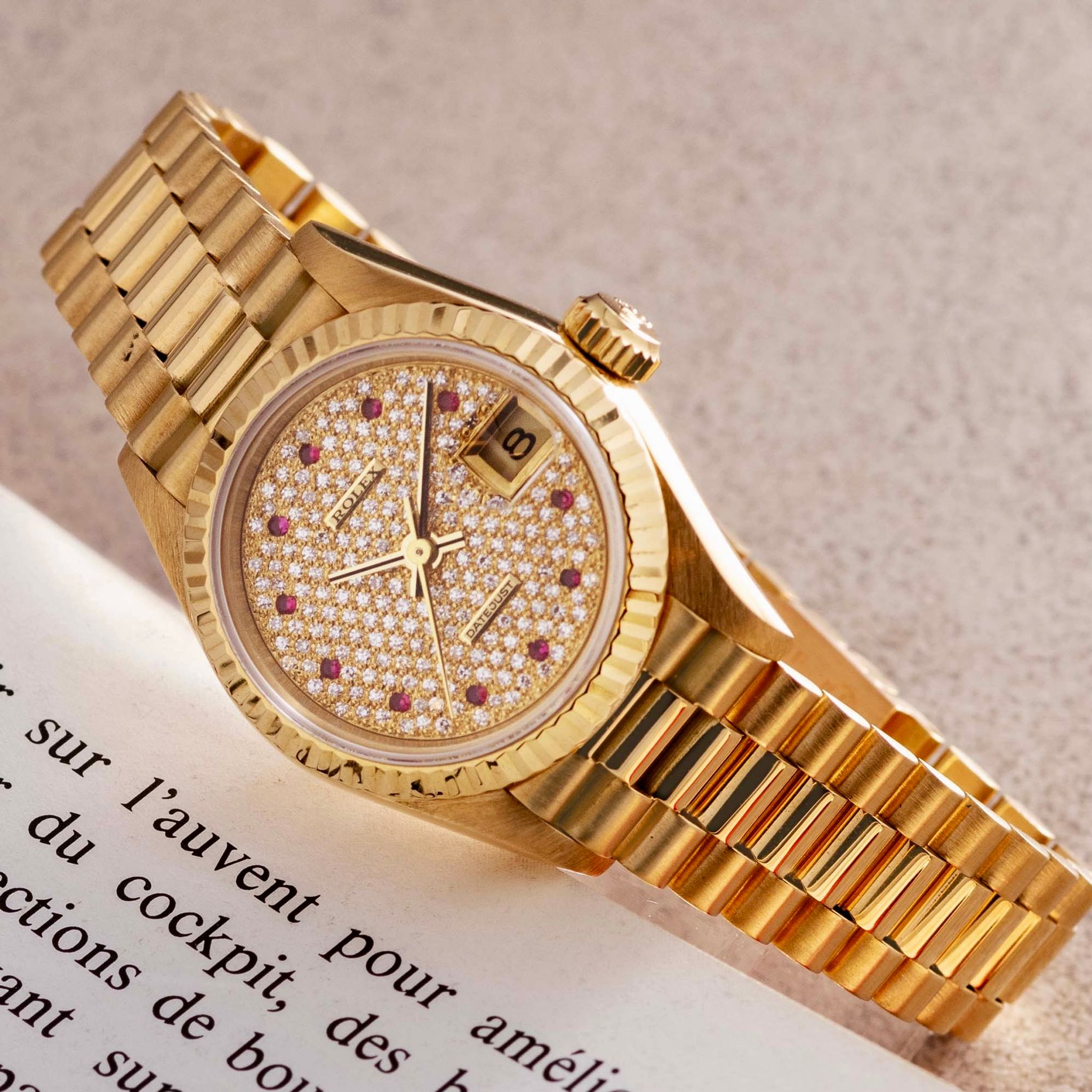 Here's a very glamorous version of the Lady Datejust reference 69178 from 1984. It is also called the Ladies President as the style of the bracelet is the same as for a Men's Day Date.