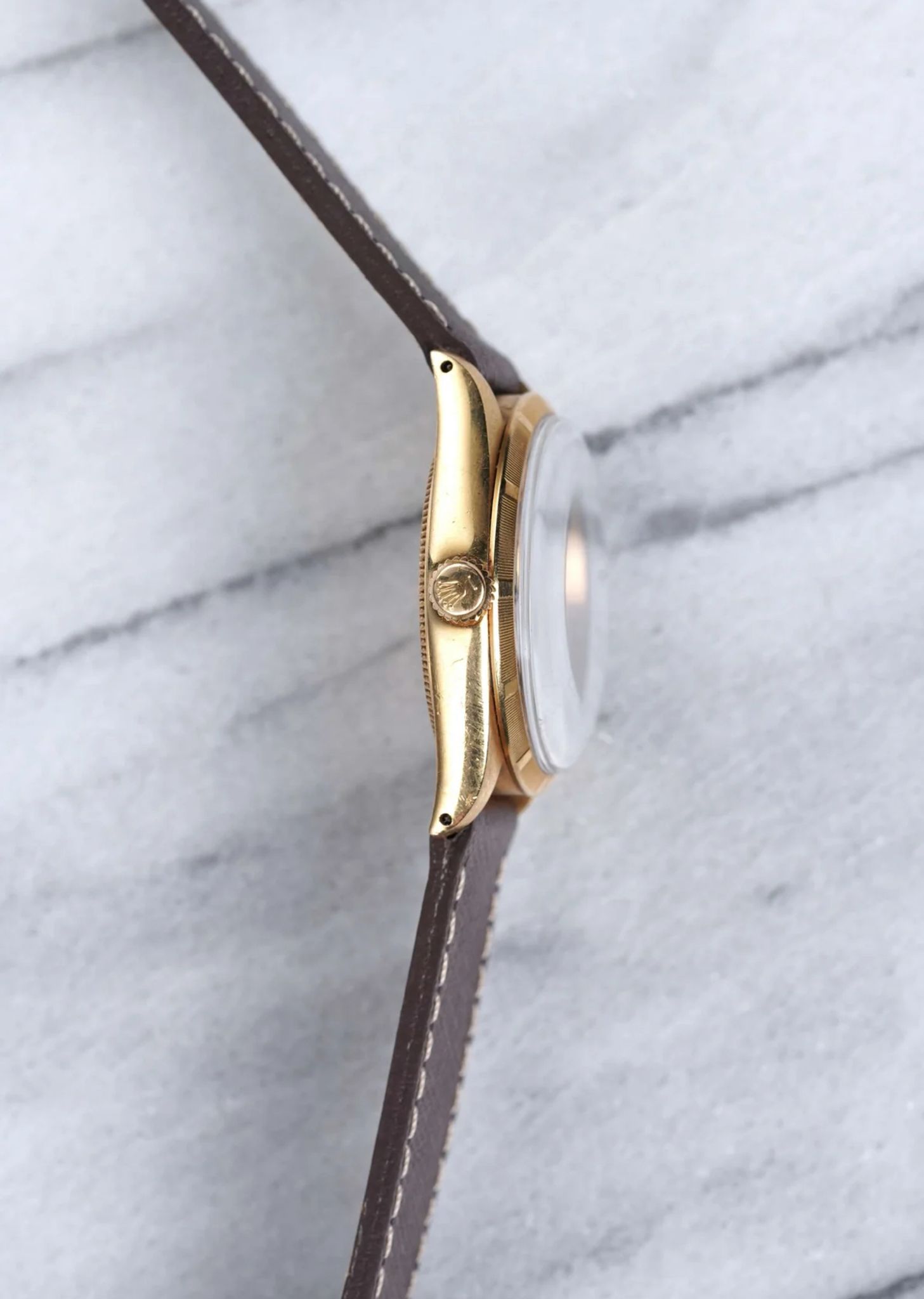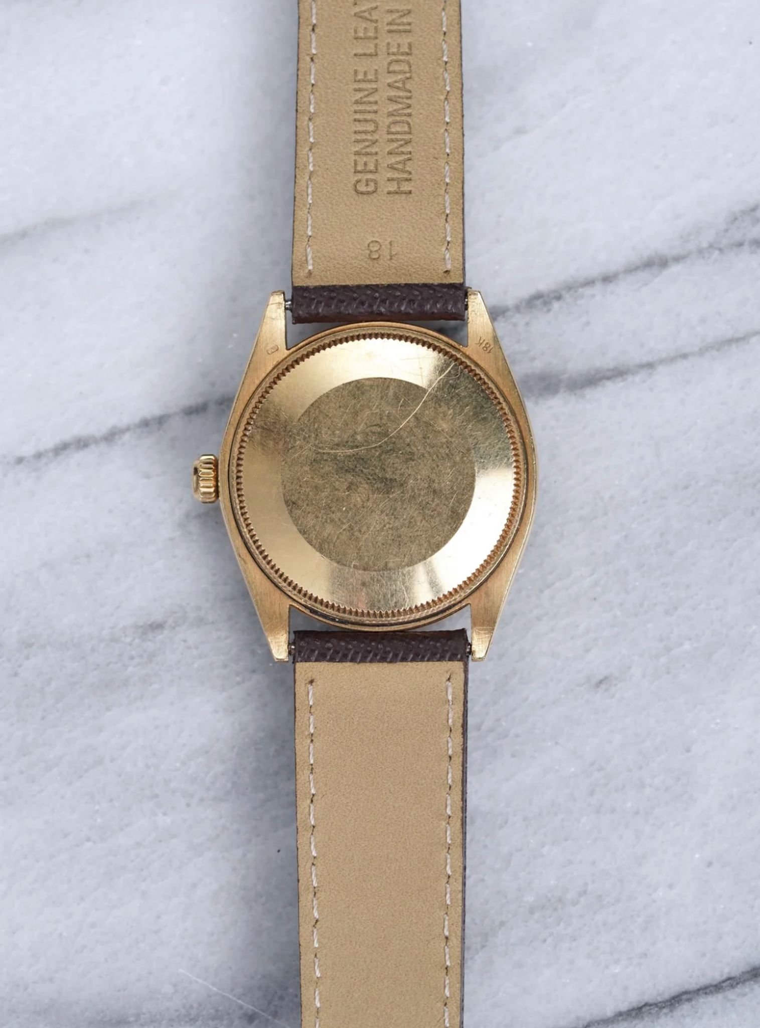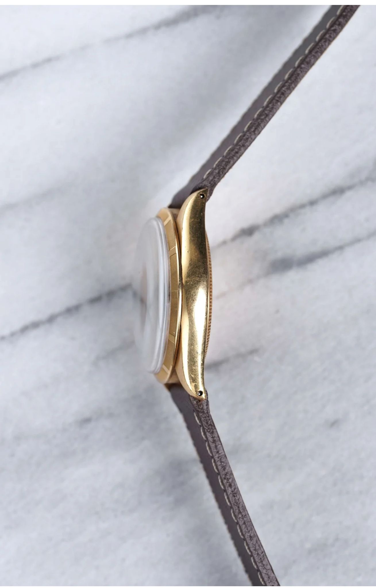 Here's a vintage Rolex reference 1003 Oyster Perpetual in 18K yellow gold from the 1970s Keeps great time and is fully functional. Measurements include a 34mm oyster case and 19mm lug width. On a brown pebble textured leather strap (Made in Italy). Time only. Lume in both the hands and lume plots developed a nice yellow patina. Gold engined turned bezel. Drilled lug holes. Matching hands and hour markers. Both the dial and crystal are free from any scratches or marks. All parts are original including the signed Rolex crown, caseback, dial, and movement. Both the dial and case are in great cosmetic, untouched condition.
