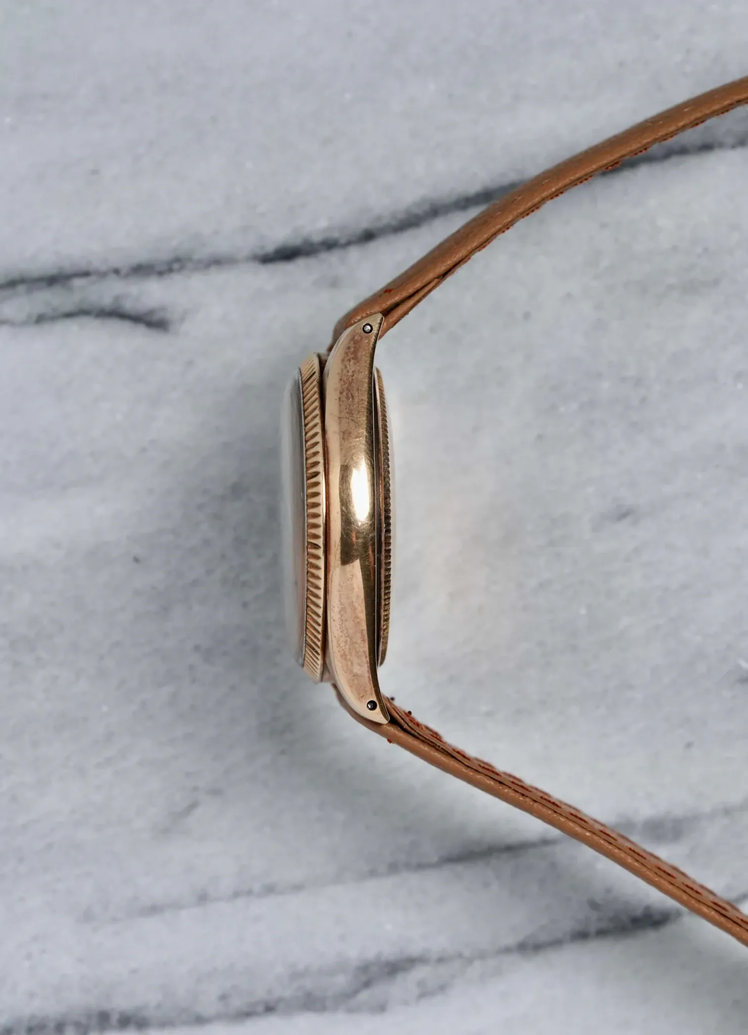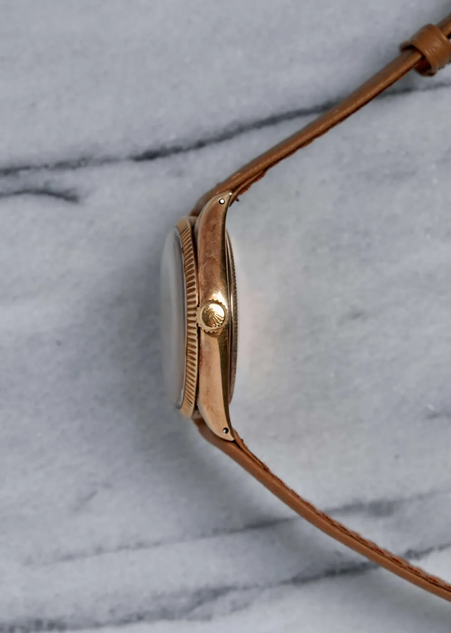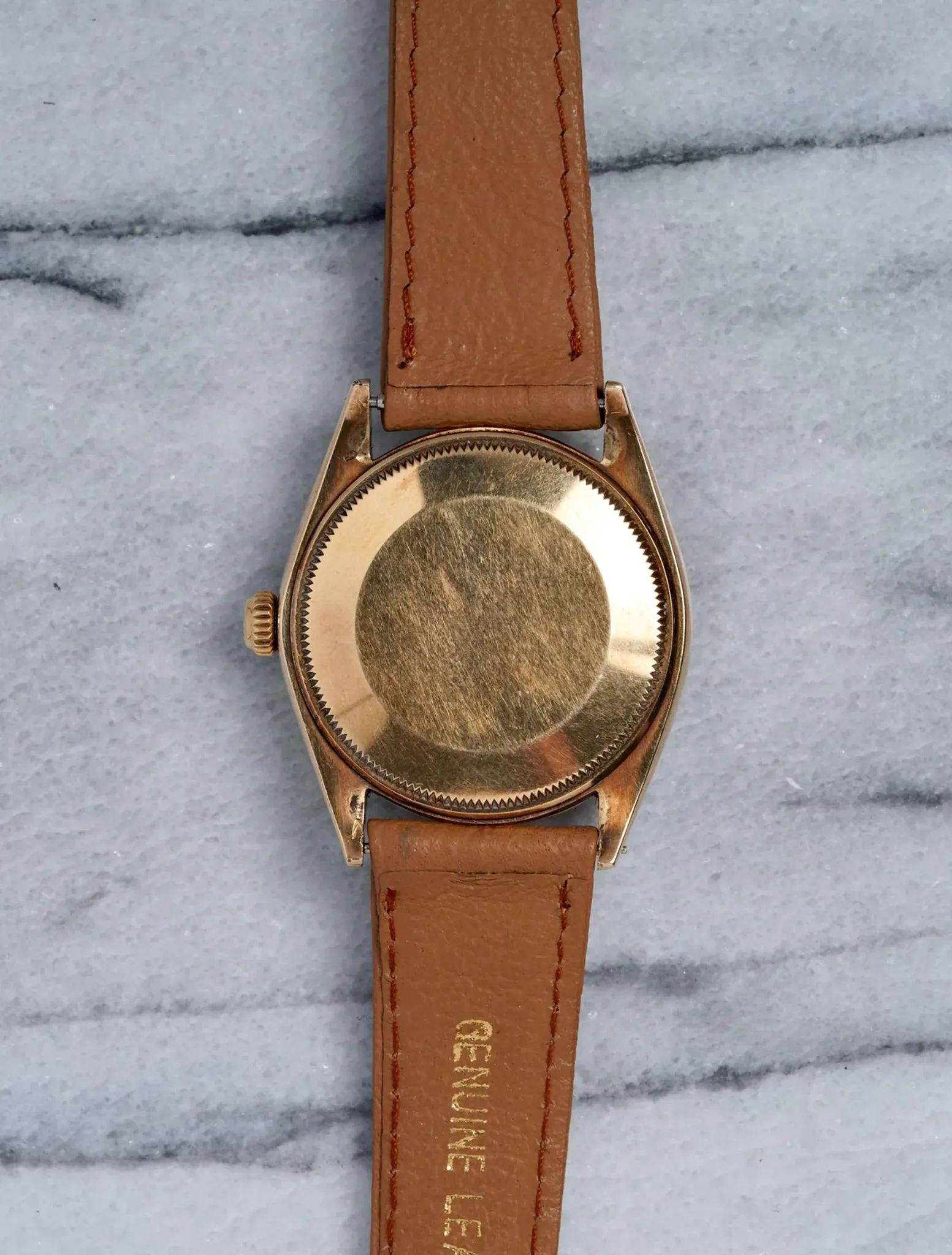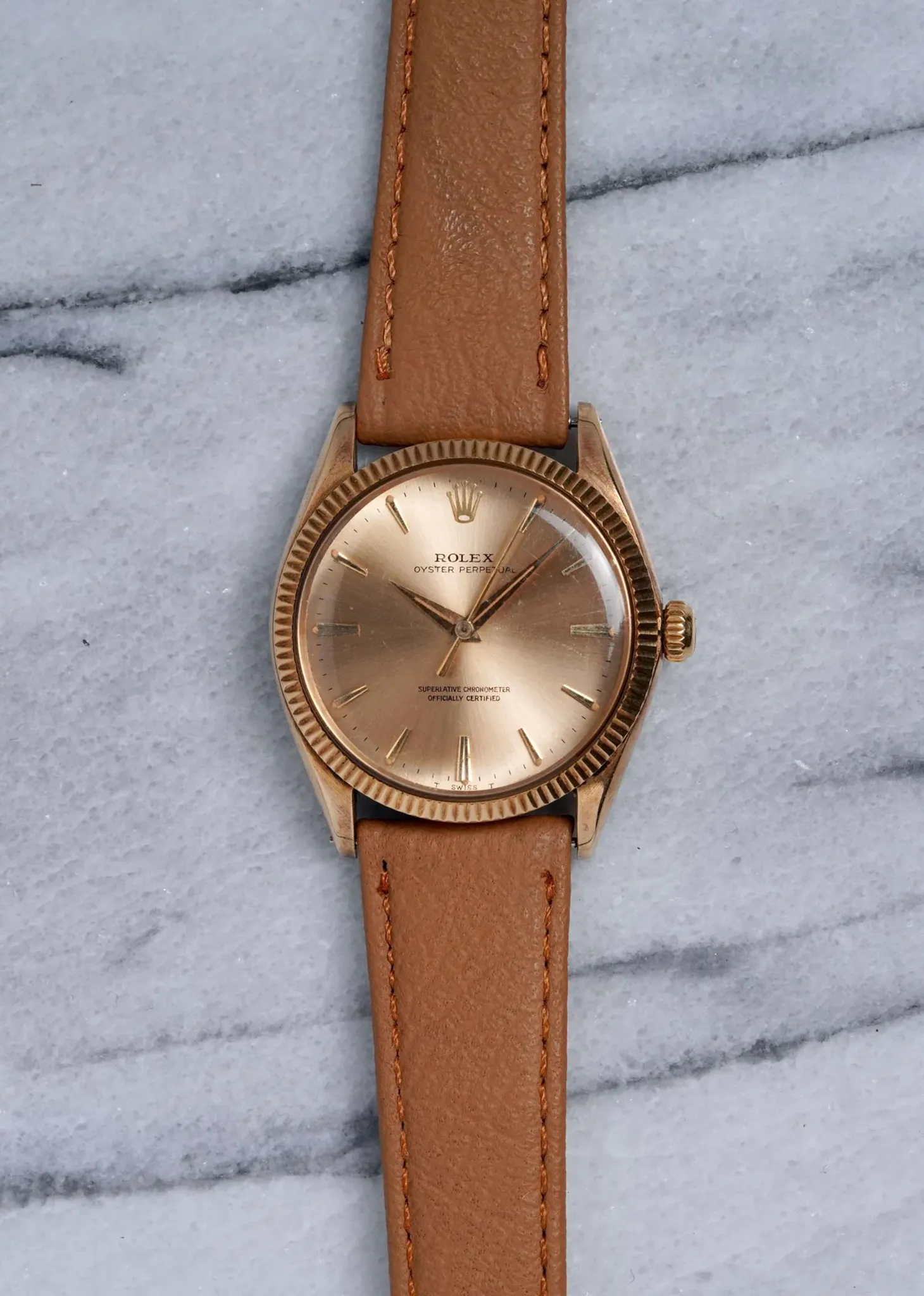 Here’s a vintage Rolex Oyster Perpetual from the 1970’s with a 14k yellow gold case and a clean Champagne dial with even creamy patina on the lume plots and the dauphine hands. The reference number is 1005. Keeps great time and is fully functional. Measurements of the case is 34mm. It's on a brown leather strap with a gold plated buckle. It has a solid 14k yellow gold case back. Dauphine hands. Both the dial and crystal are free from any scratches. All parts are original including the dial, crown, movement, and caseback. Both the dial and case are in great cosmetic, untouched condition.