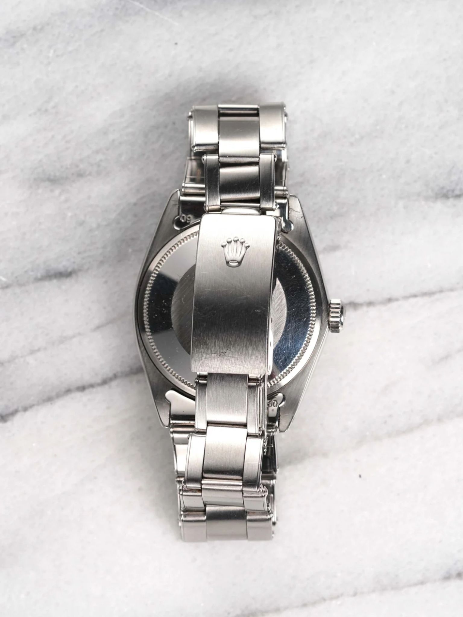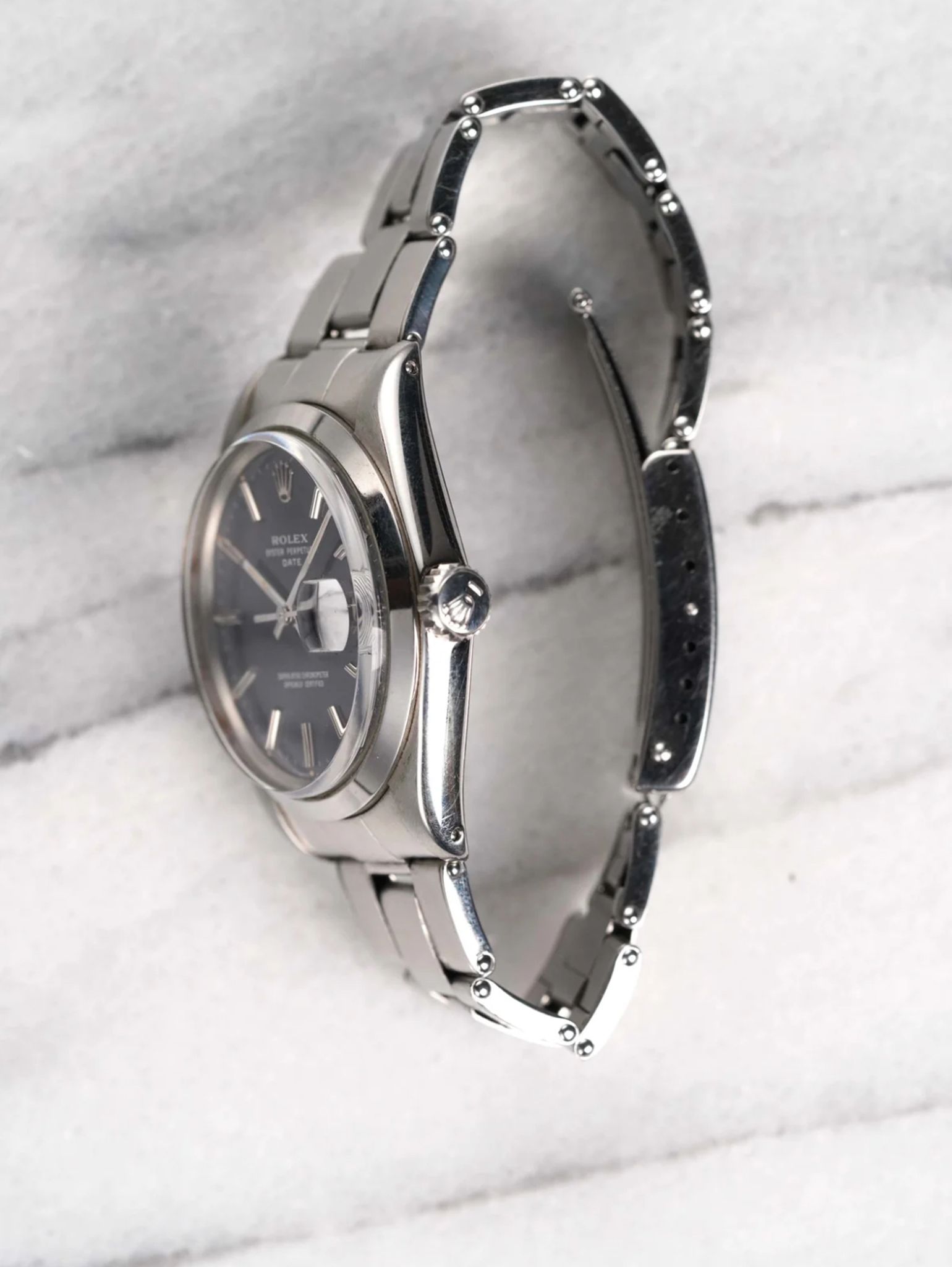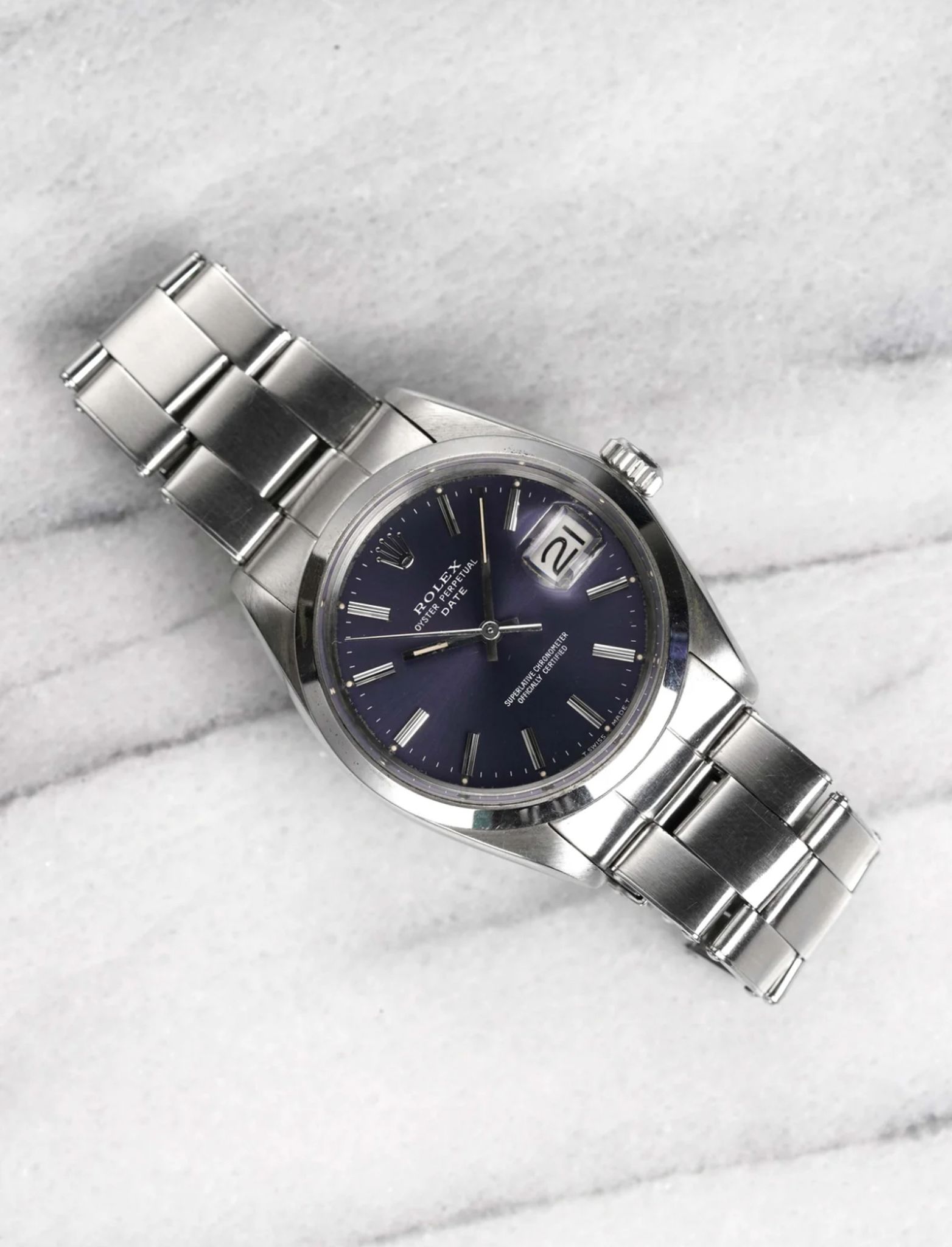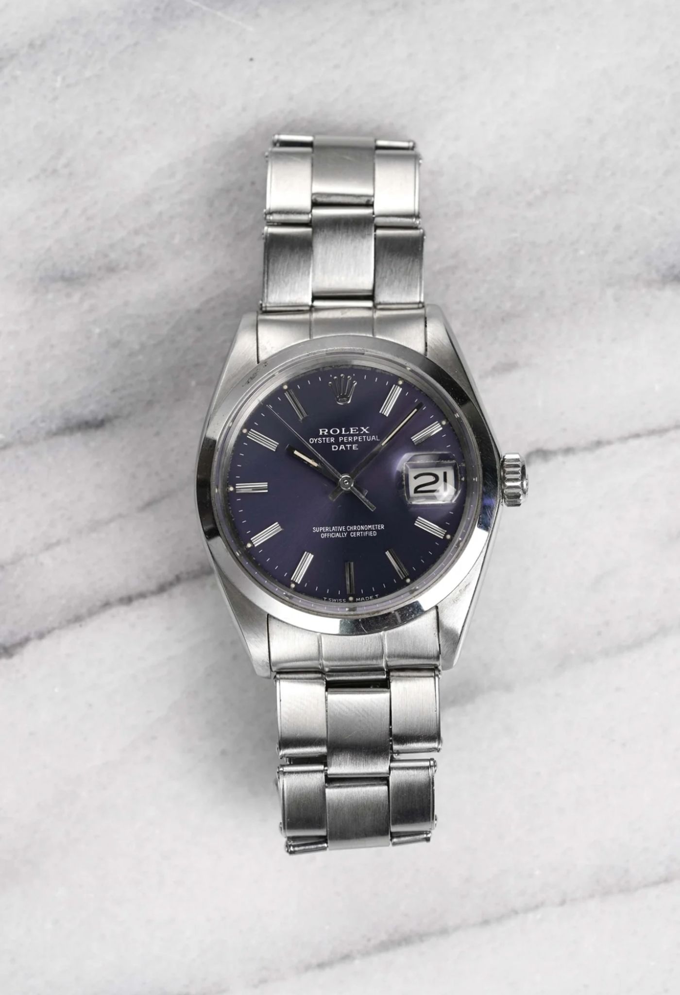 Here's a vintage Rolex Oyster Perpetual date reference 1500 automatic with a sunburst bluish purple dial from the 70s. Keeps great time and is fully functional. Measurements include a 34mm oyster case and 19mm lug width. It's on its original rivet oyster bracelet that fits up to a 7.25 inch wrist. Time and non-quick date function at 3 o'clock. Clean blue dial. The lume in both the hands and lume plots aged to a nice cream color. Both the dial and crystal are free from any scratches are marks. Drilled lug holes. Stainless steel case and caseback. Hard to find a clean blue dial in this condition. All parts are original including the signed Rolex crown, dial, movement, and caseback. Both the dial and case are in great cosmetic, untouched condition.