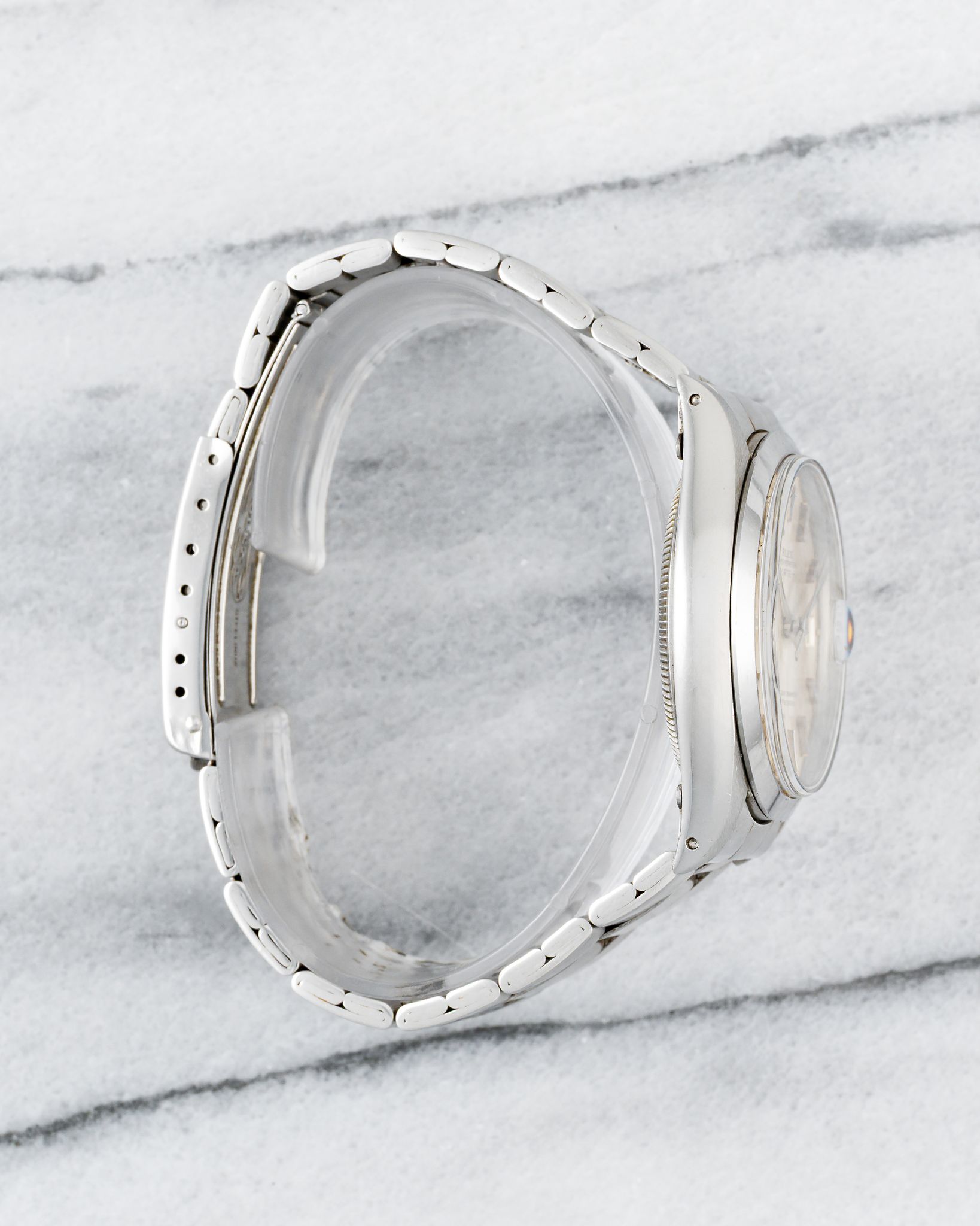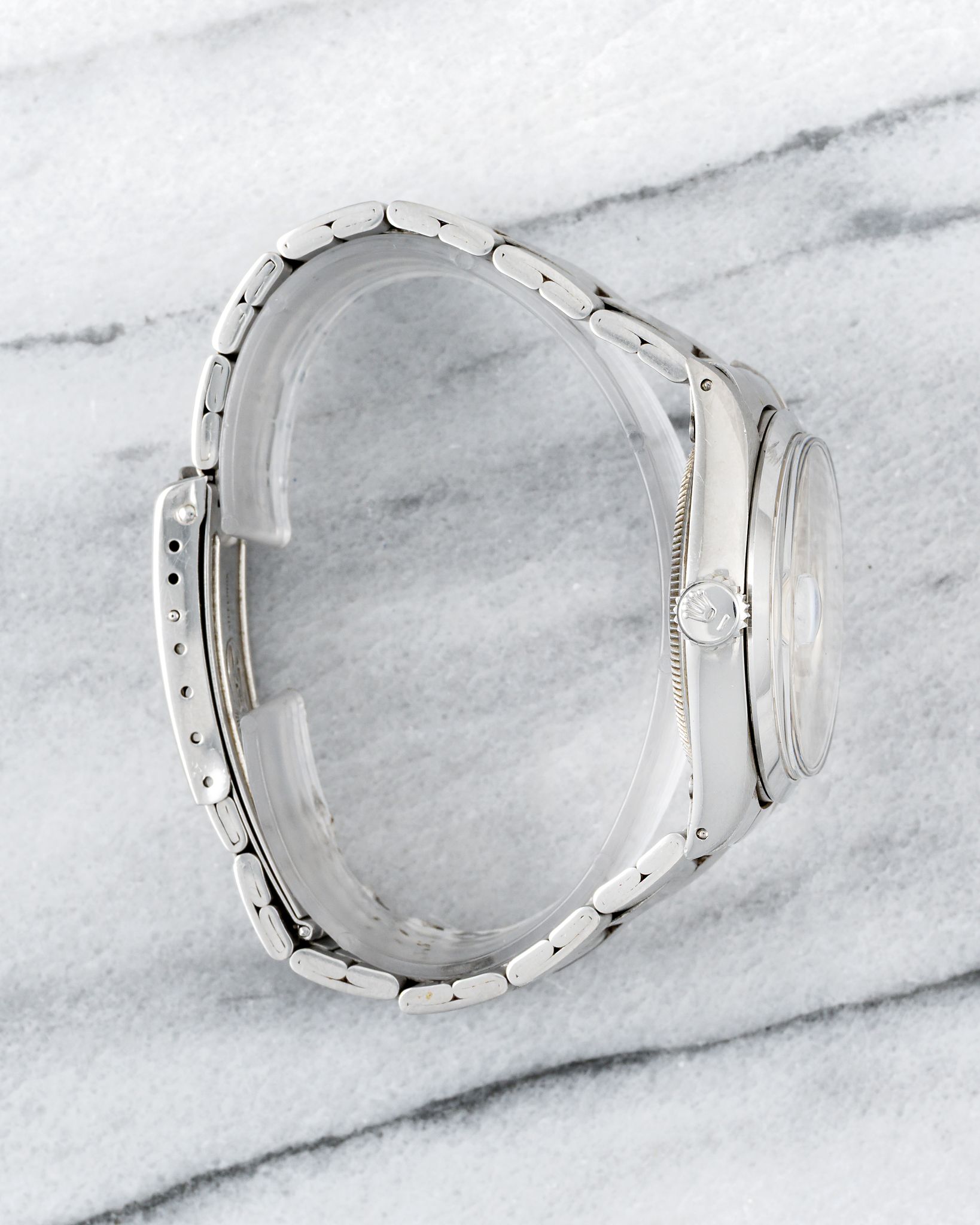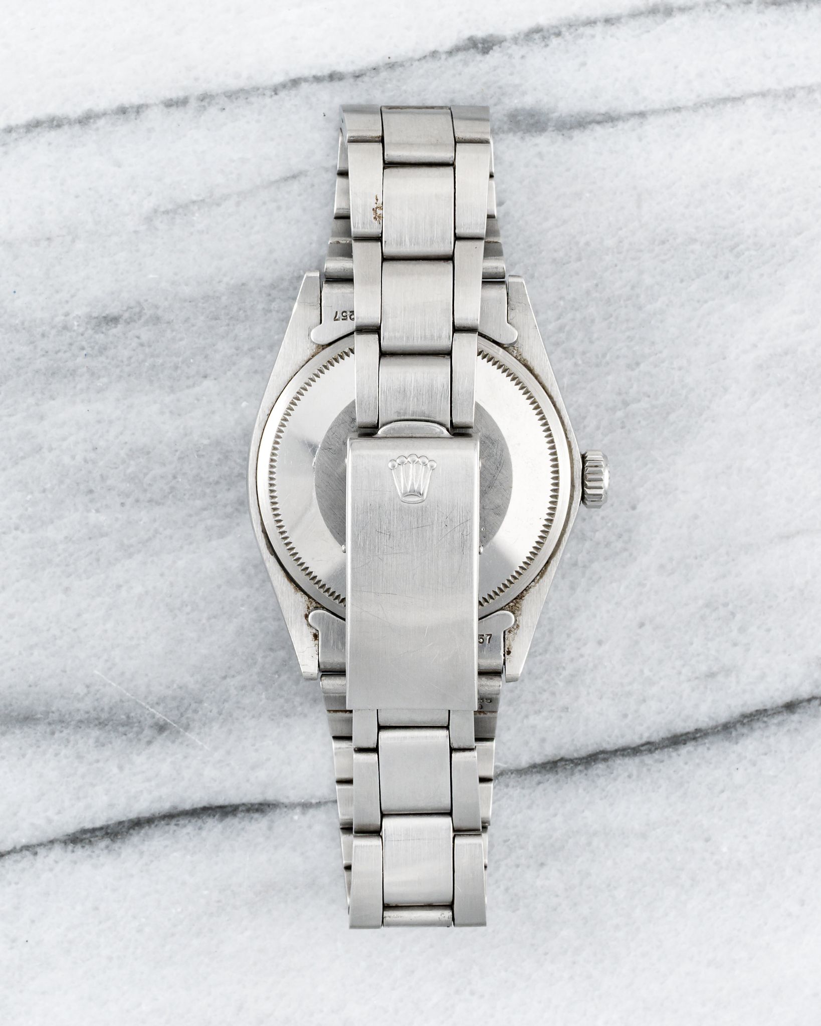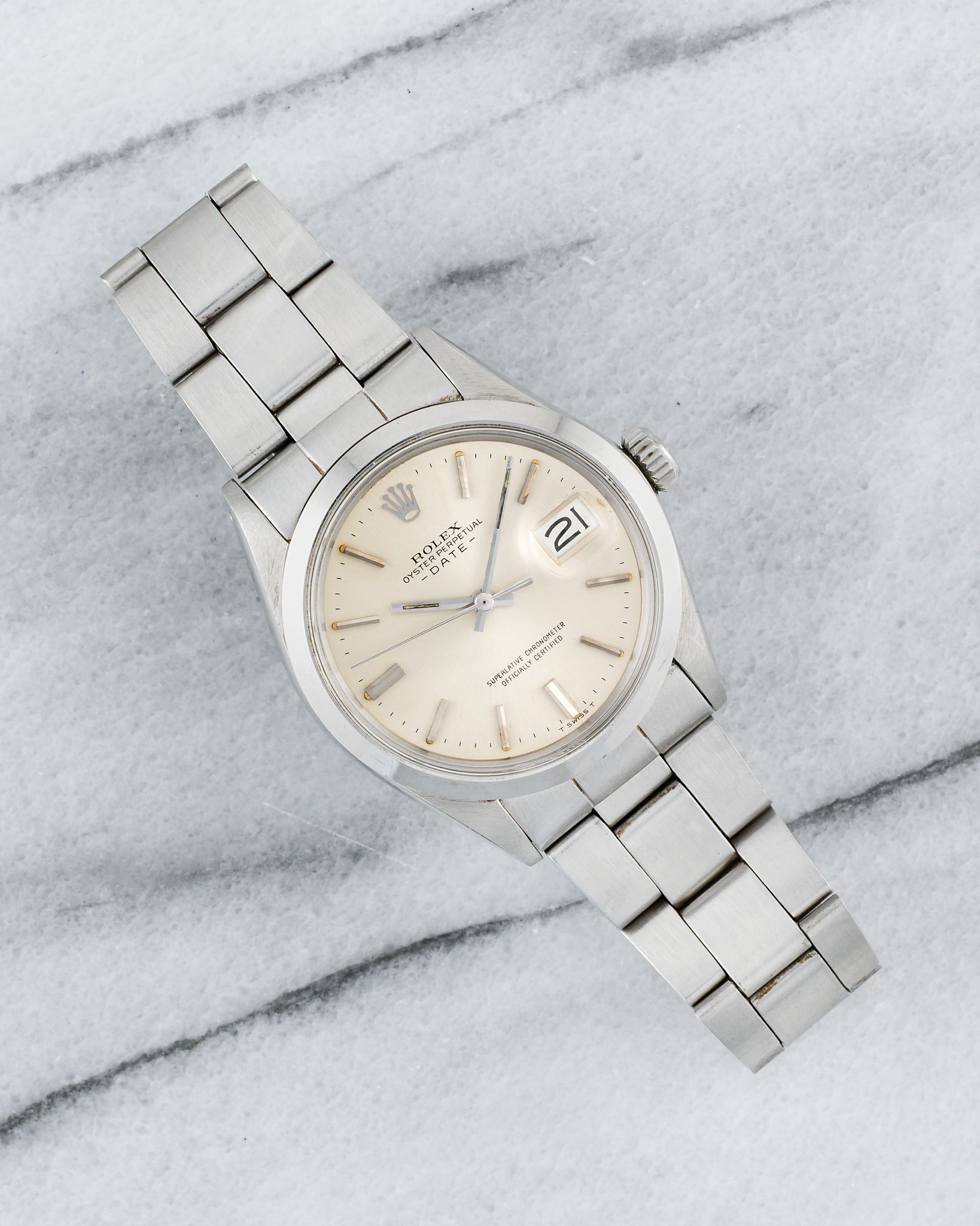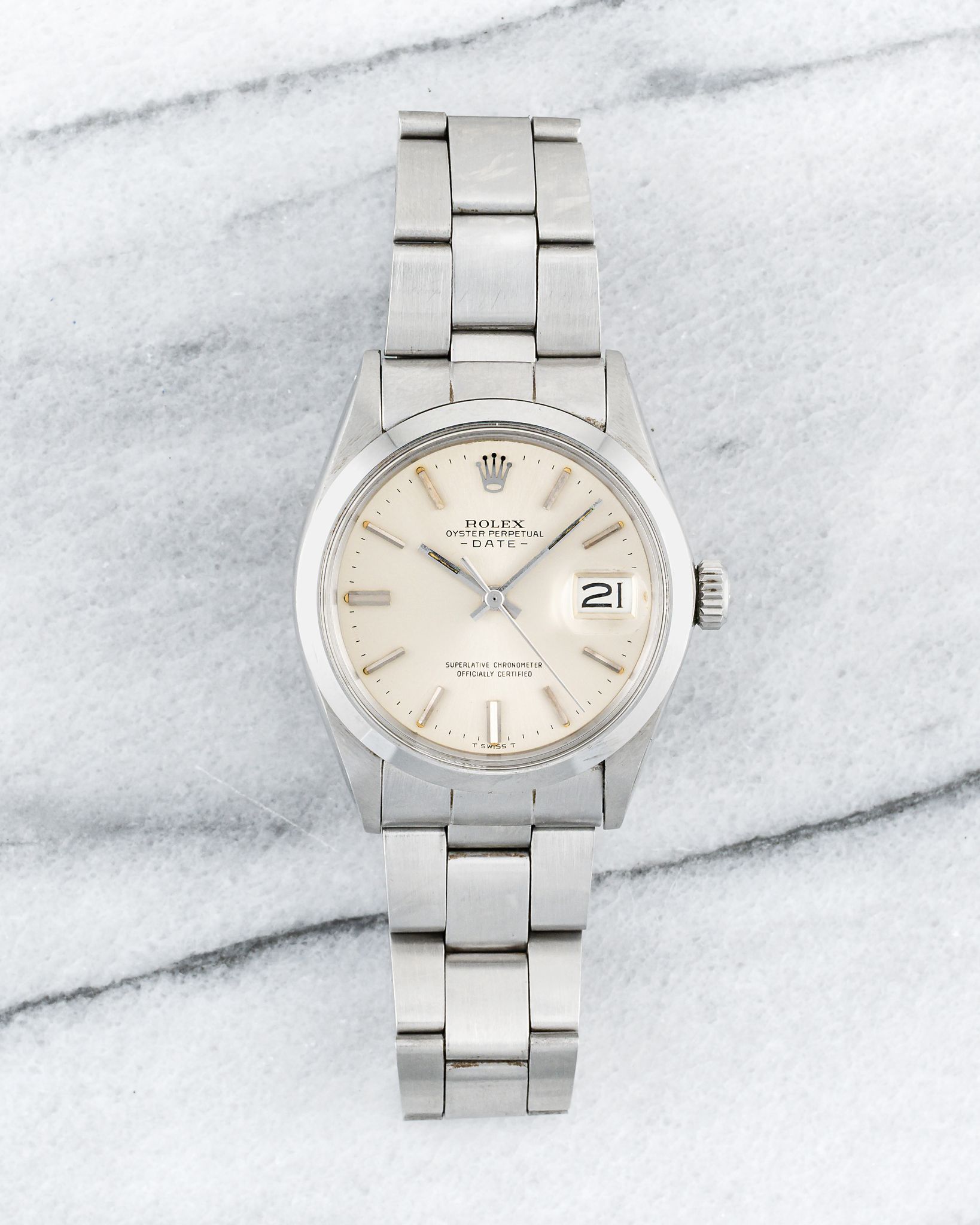 Here's a vintage Rolex Oyster Perpetual date reference 1500 automatic with a silver sunburst dial from the late 60s, early 70s. Keeps great time and is fully functional. Measurements include a 34mm oyster case and 19mm lug width. It's on its original oyster bracelet that fits up to a 7 wrist (57 endlinks) Time and non-quick date function at 3 a clock. Clean silver dial with dauphine hands. The lume in both the hands and lume plots aged to a nice cream color. Great condition on both the lugs and case. Both the dial and crystal are free from any scratches are marks. Drilled lug holes. Stainless steel case and caseback. All parts are original including the signed Rolex crown, dial, movement, and caseback. Both the dial and case are in great cosmetic, untouched condition.