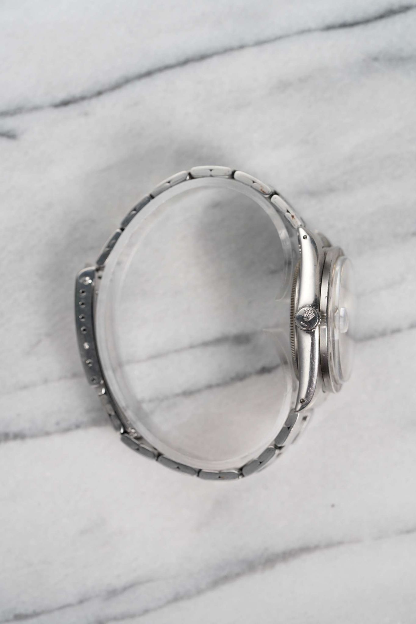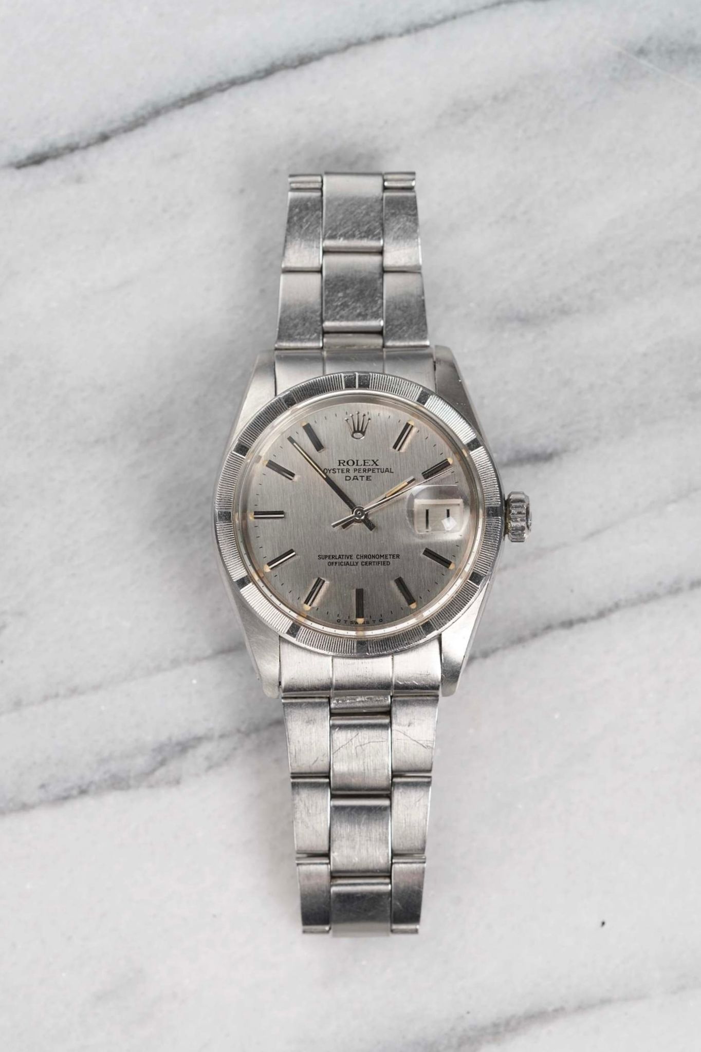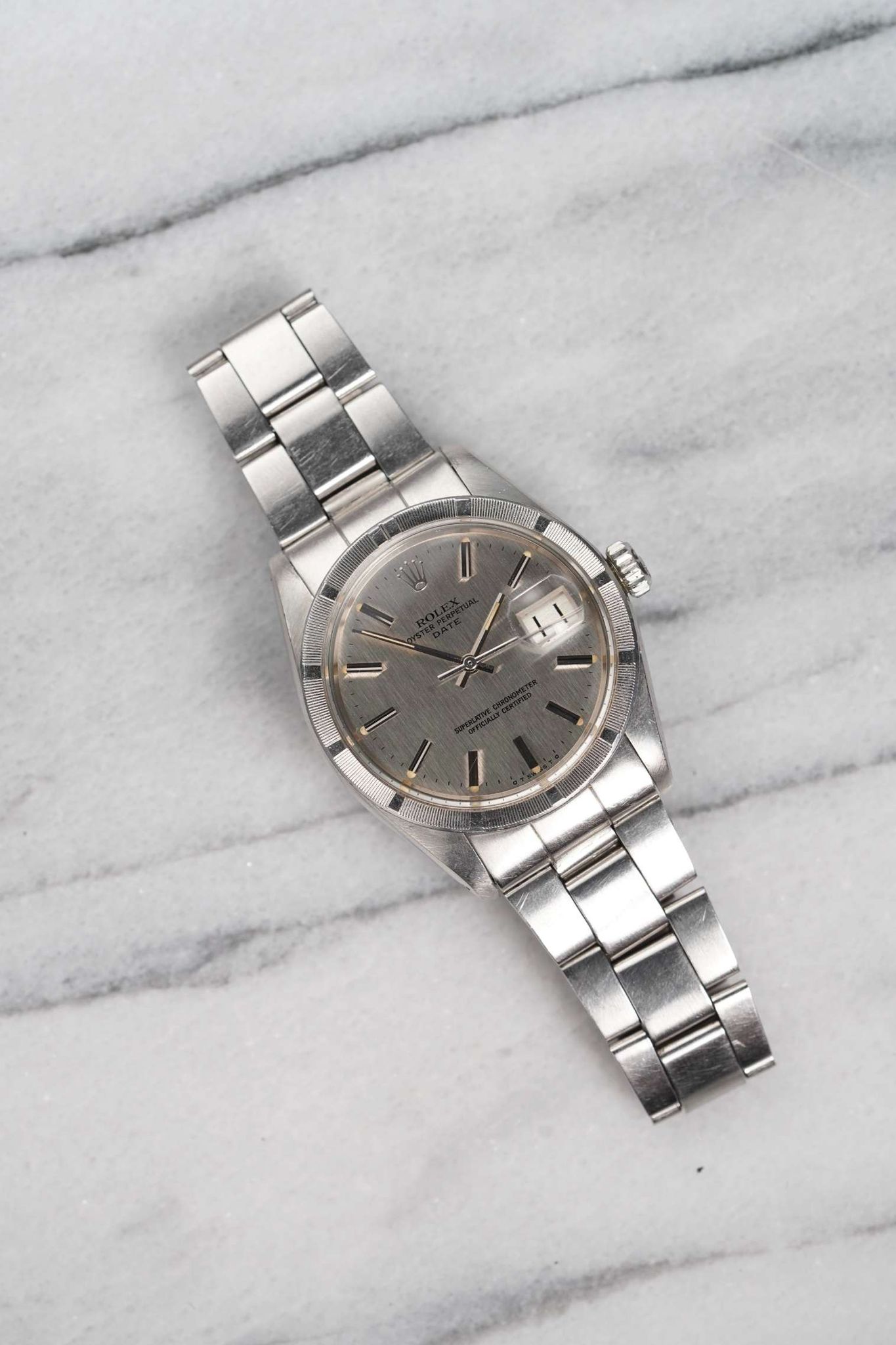 Here’s a vintage Rolex Oyster Perpetual reference 1501 automatic with a silver vertical stripe dial from the 1970s. 34mm stainless steel case with engined turned bezel and drilled lugs. Fitted on its steel rivet bracelet, sized to fit up to a 7 inch wrist. Time and non-quickset date function at 3 o’clock. Original dial, case, movement, and crown. Fully functional and keeping time.