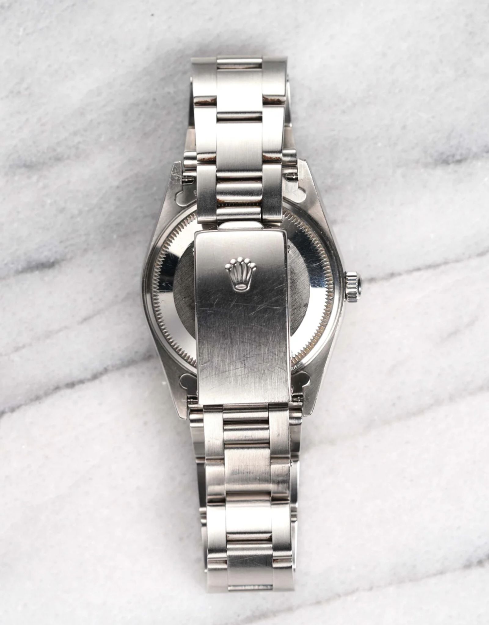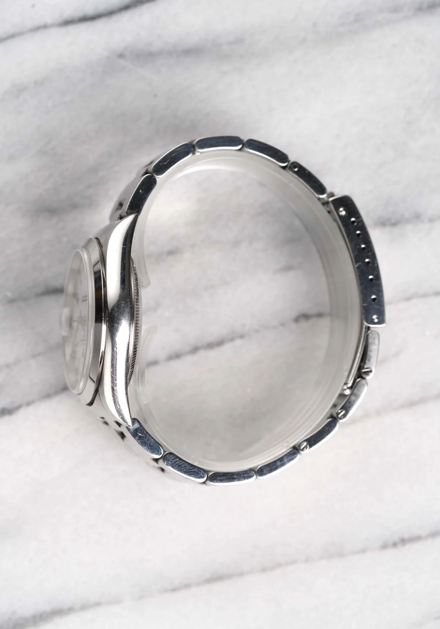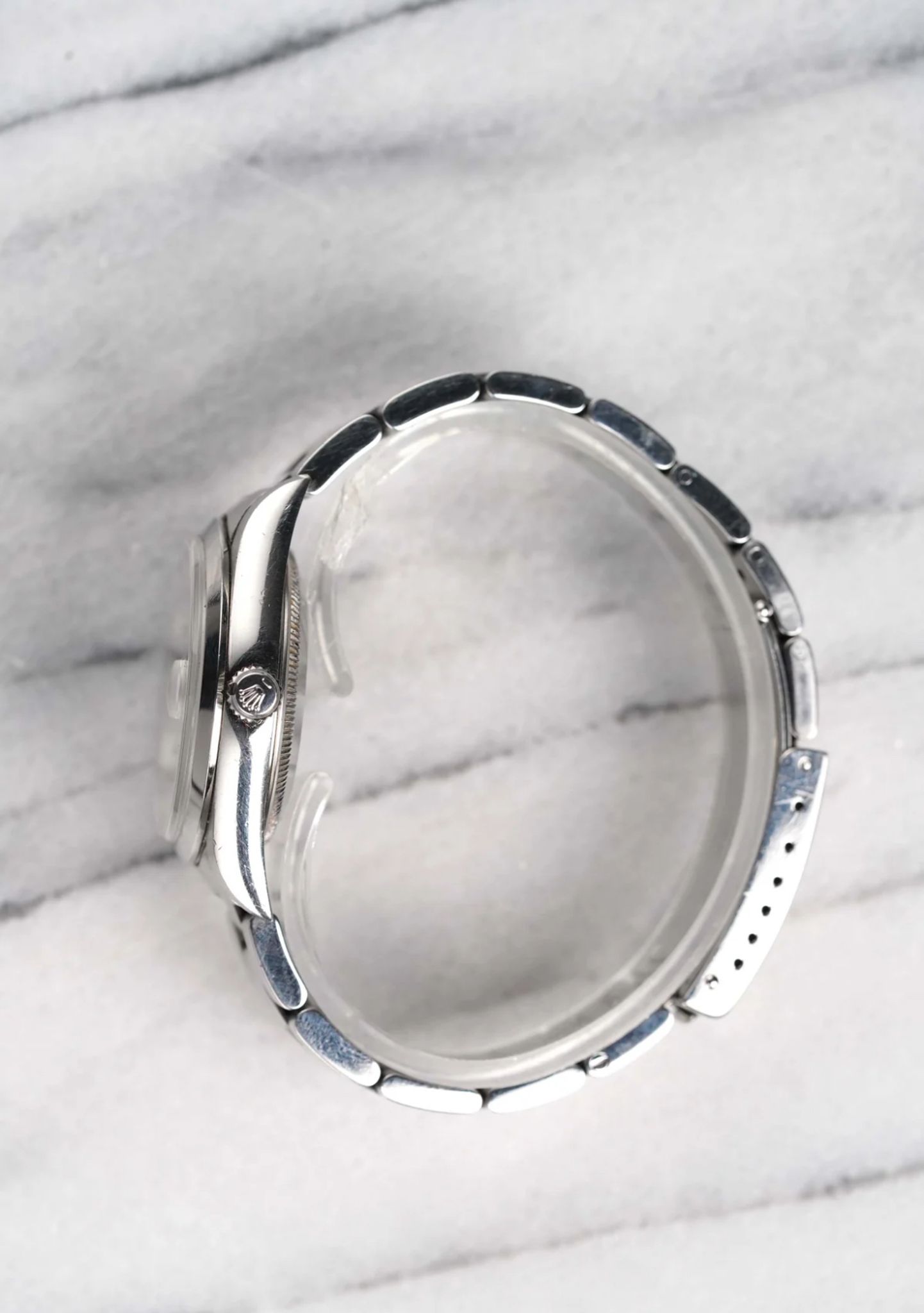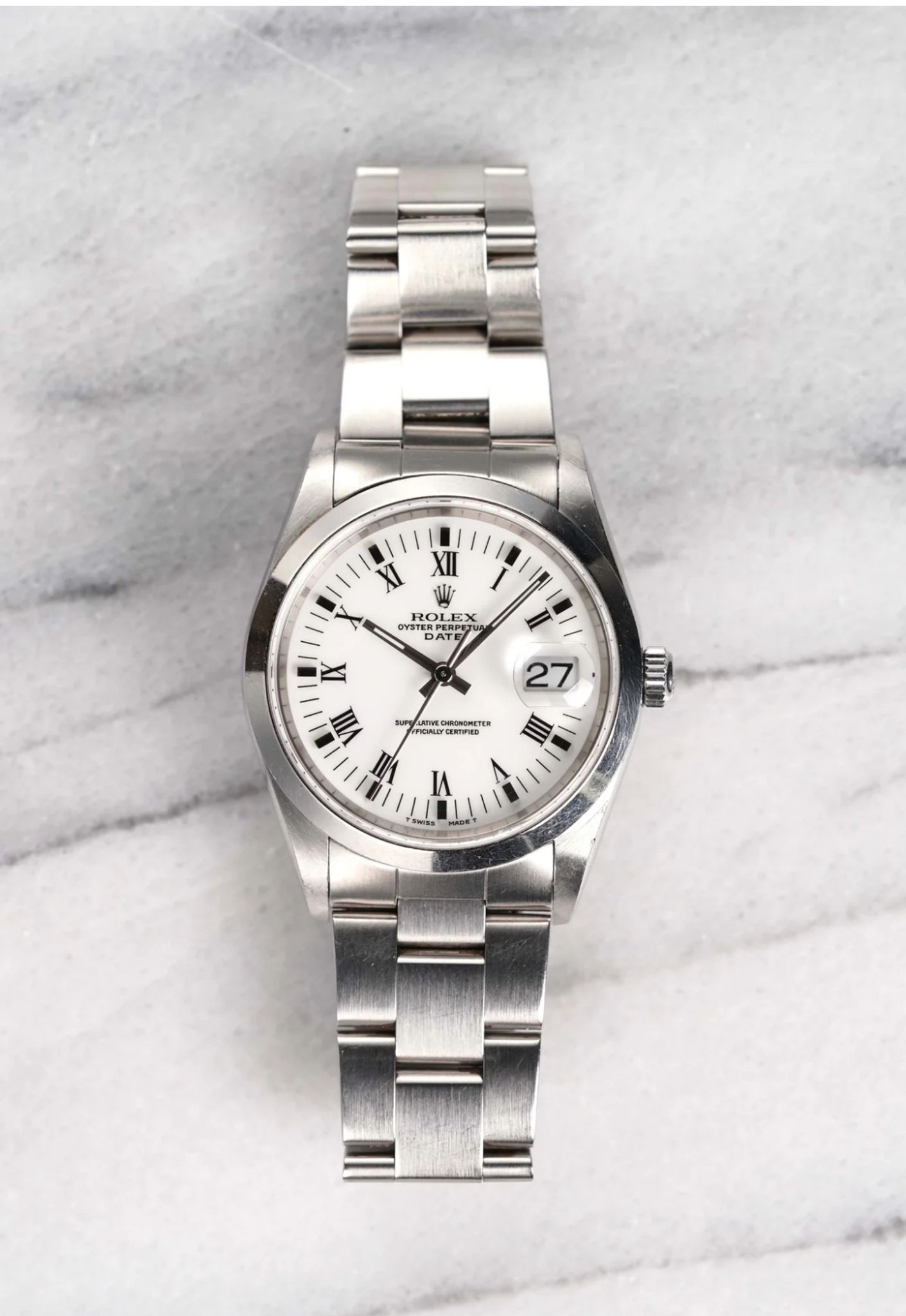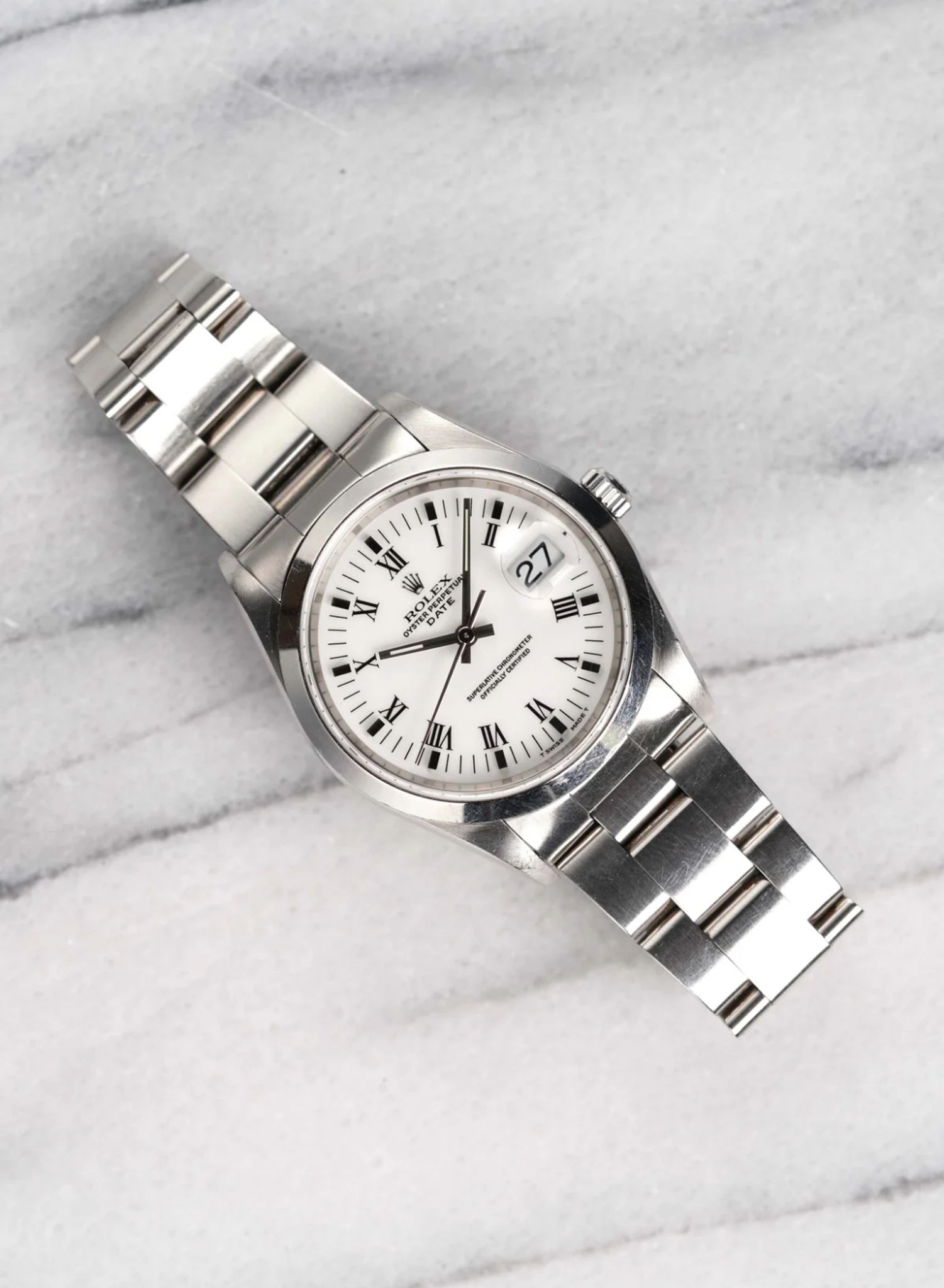 Here's a neo-vintage Rolex Oyster Perpetual date reference 15200 automatic with a matte white roman numeral dial from the 1990s-2000s Keeps great time and is fully functional. Measurements include a 34mm oyster case and 19mm lug width. It's on its original heavy oyster bracelet that fits up to a 7.25 inch wrist (557 B endlinks, 78350 bracelet). Time and quickset date function at 3 a clock. No holes case. Free from any scratches are marks. Stainless steel case and caseback. All parts are original including the signed Rolex crown, dial, movement, and caseback. Both the dial and case are in great cosmetic, untouched condition.