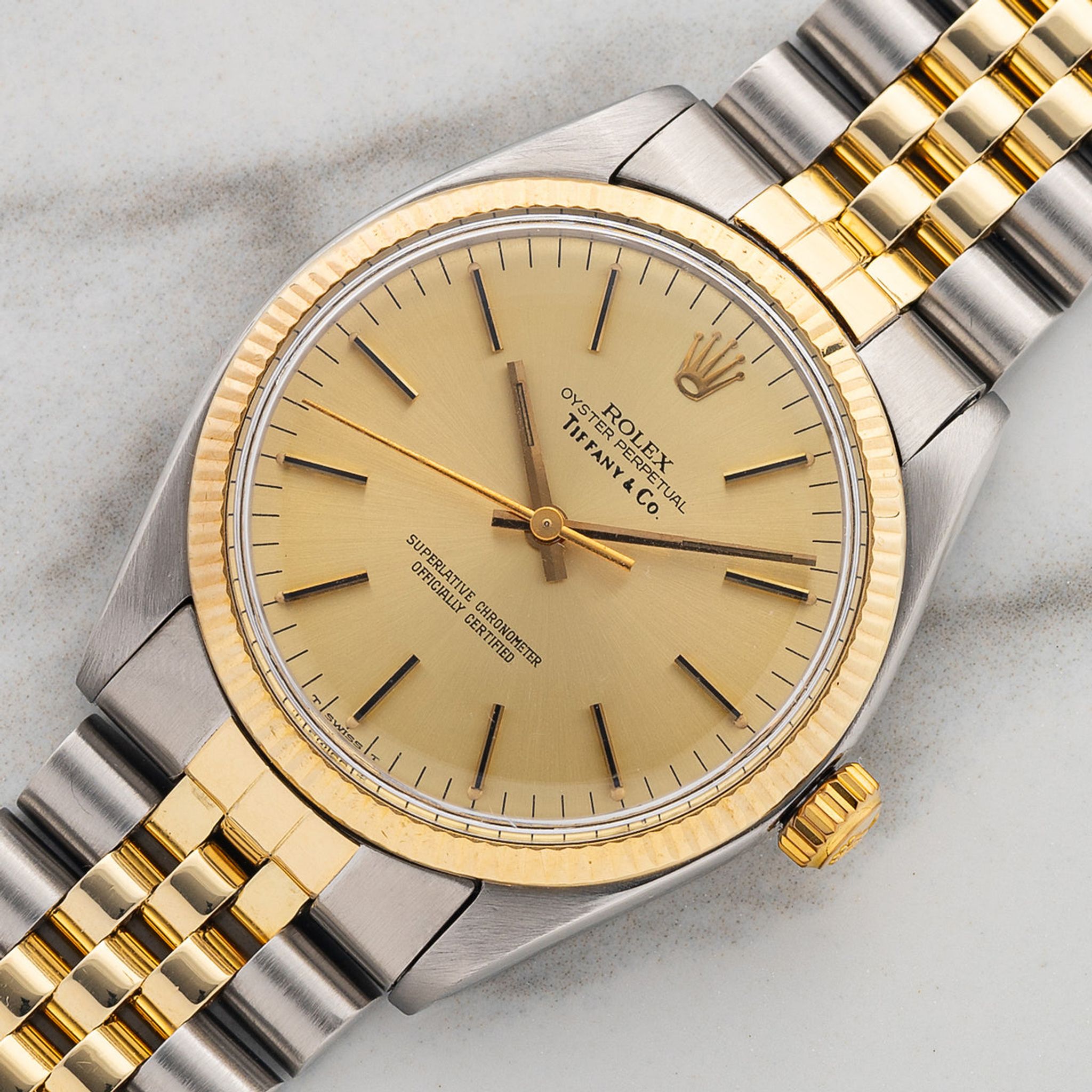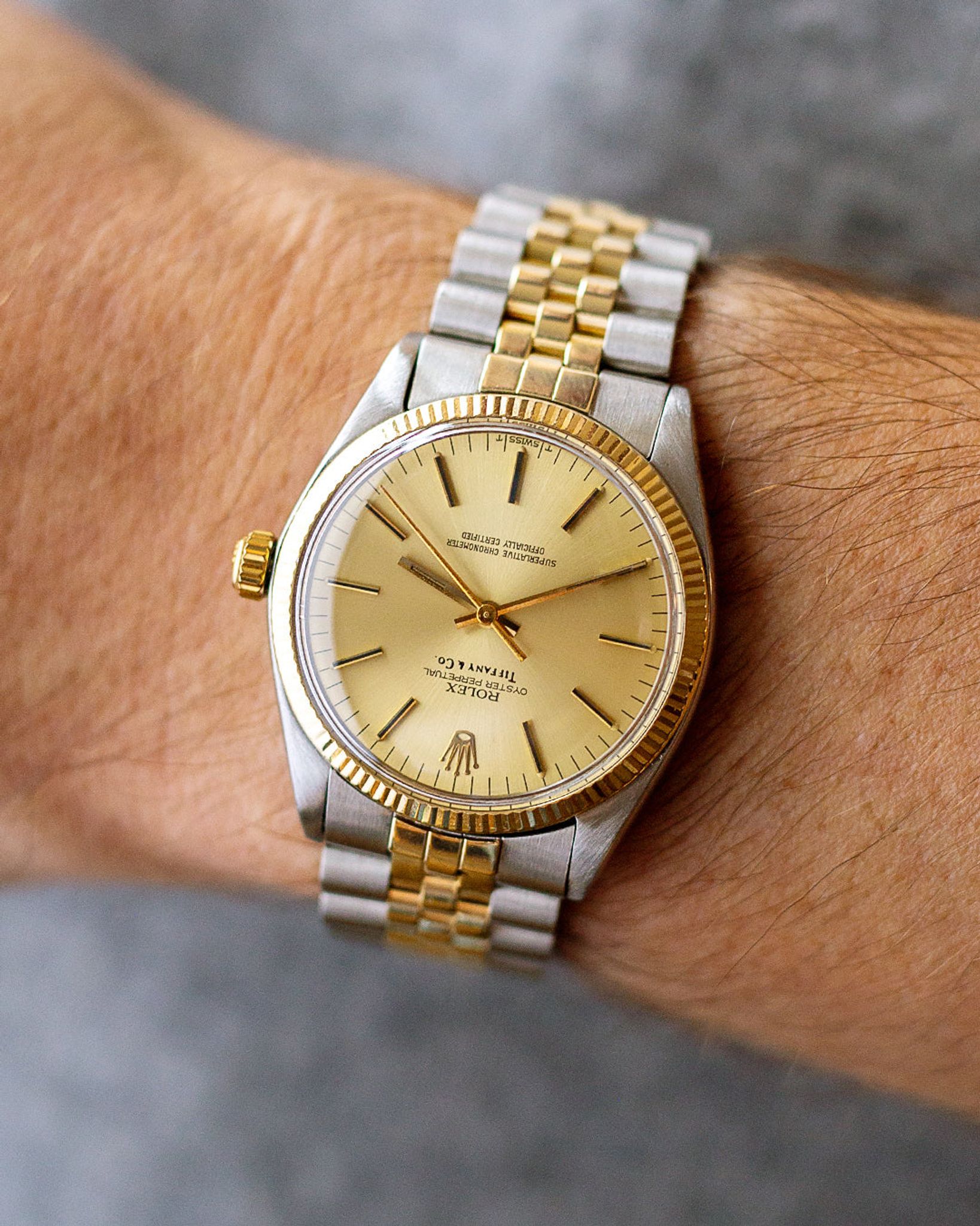This particular example, circa 1982 houses a very rare Tiffany & Co signed dial making it a true collector gem. This dial iteration features a fatter looking co-signature which we find to be one of the most attractive compared to other skinner font examples and it was carefully scrutinized to validate authenticity. The bracelet was also just completely rebuilt by one of the top restoration shops in the world: Classic Watch Repair based in Hong Kong and feels as tight as it was from factory. Overall, this piece has an incredible amount of charm and if you've been looking for a special Rolex addition that easily jumps from sport to dressier settings, don't overlook this stunning Oyster Perpetual.