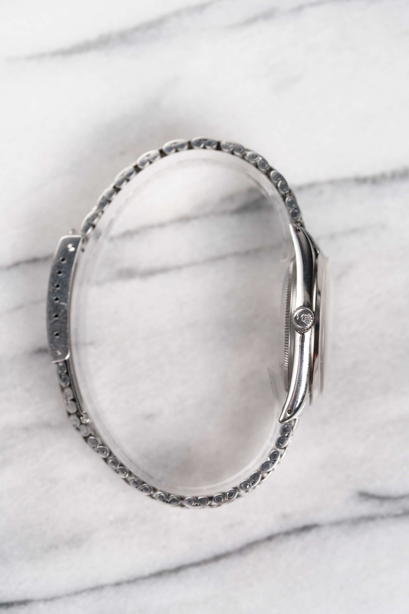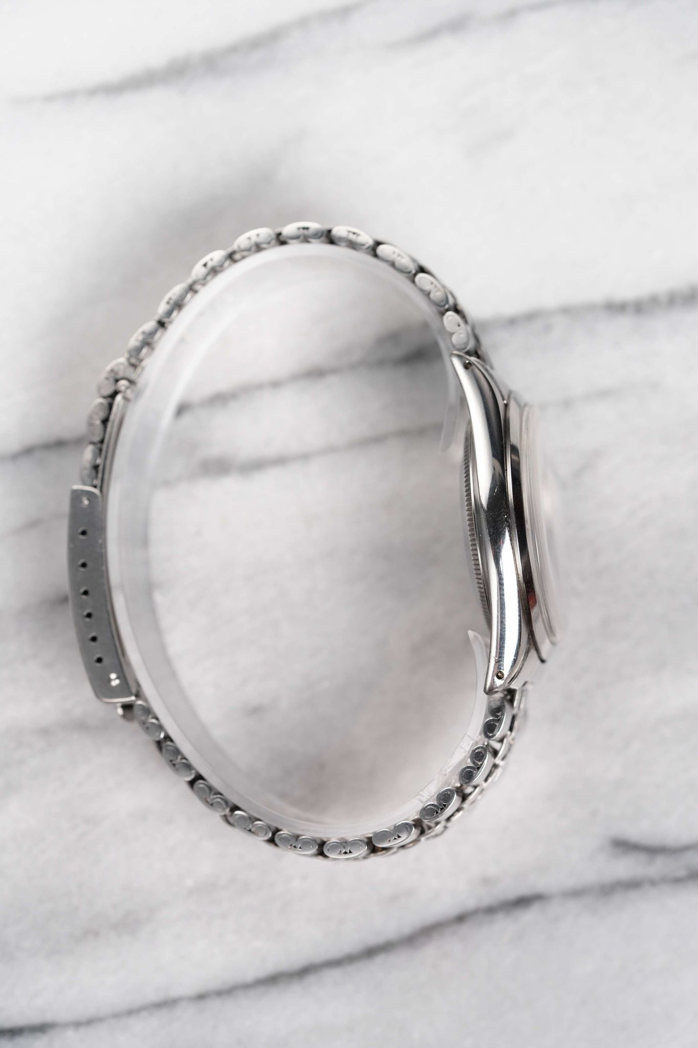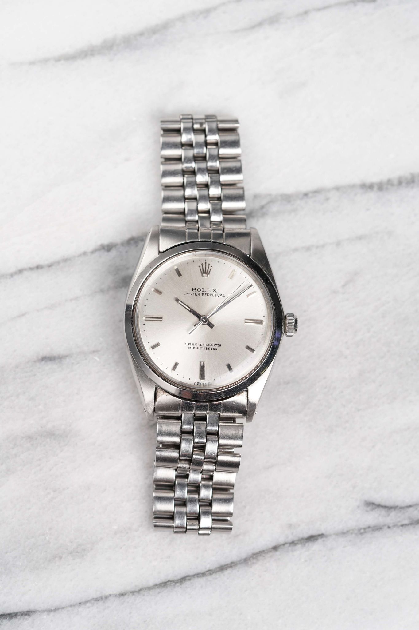 Here's a vintage Rolex Oyster Perpetual Reference number 1018 automatic with a silver sunburst dial from the 70s. Keeps great time and is fully functional. Measurements include a 36mm oyster case and 20mm lug width. It's on a jubilee bracelet that fits up to a 7.25 inch wrist. Time only. Beautiful sunburst silver dial. Matching stick hands and hour markers. Drilled lug holes. Stainless steel case and caseback. All parts are original including the signed Rolex crown ,dial, movement, and caseback. Both the dial and case are in great cosmetic condition.