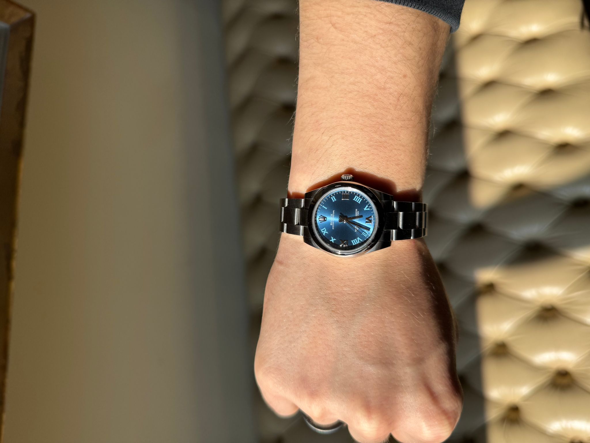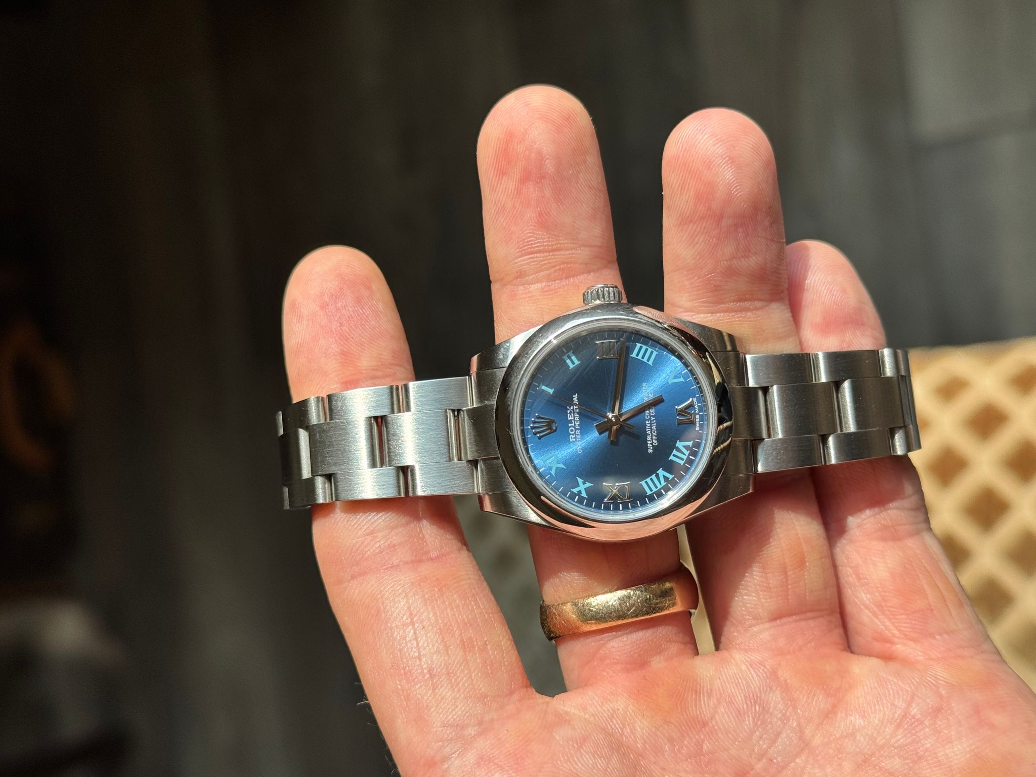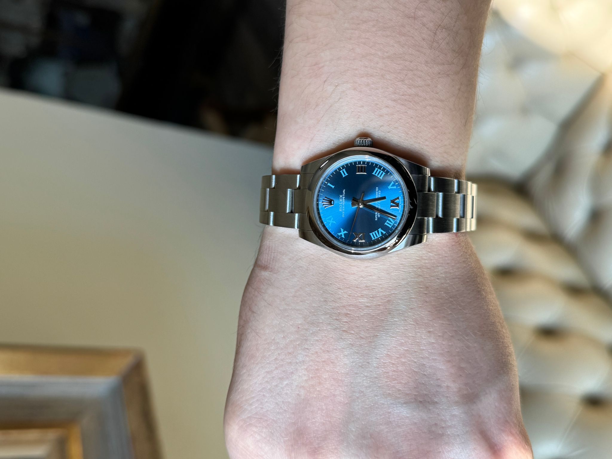 Rolex Oyster Perpetual 31mm Azzuro Blue 177200. Watch was purchased in January of 2020. Excellent pre owned condition with minor wear. Full links.