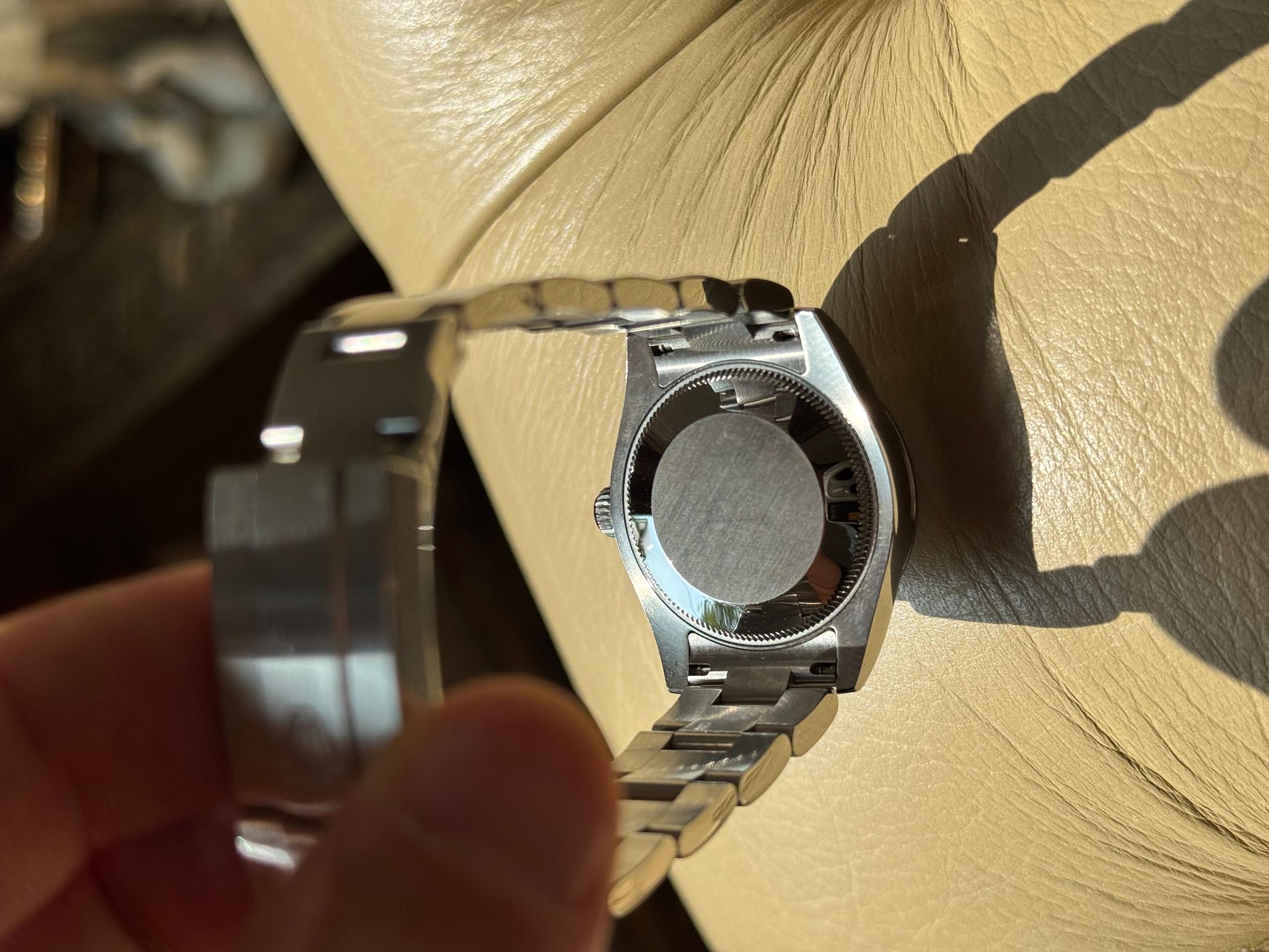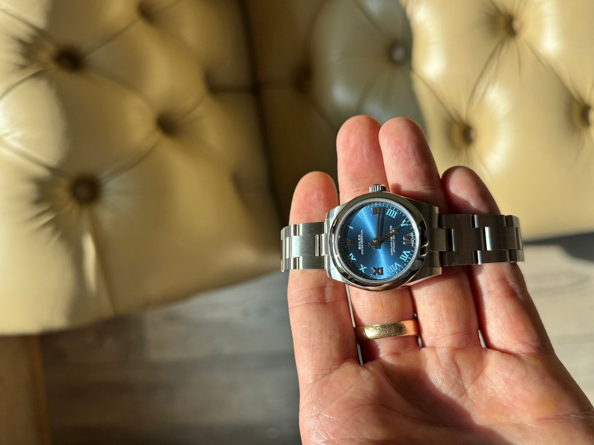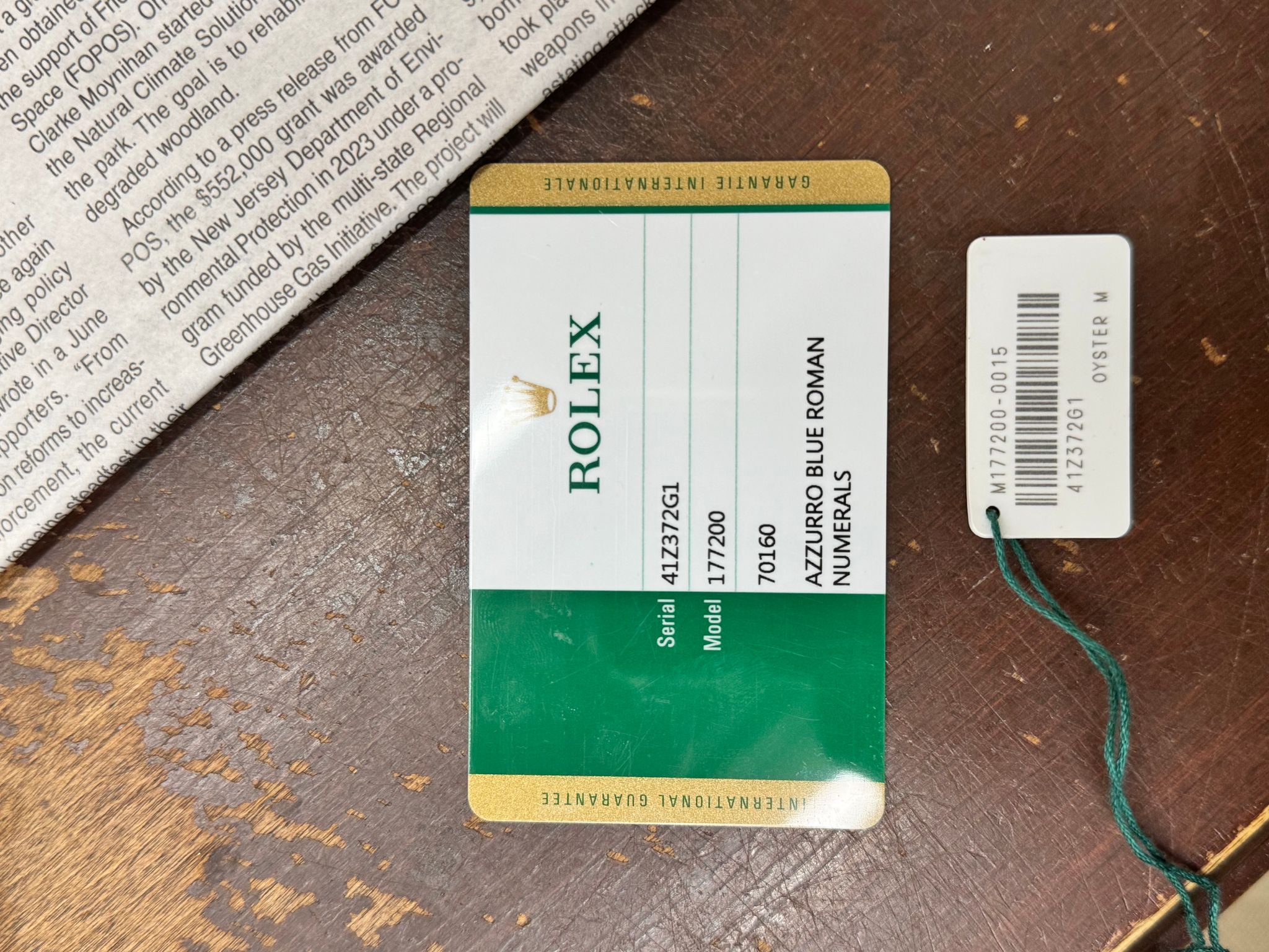 Rolex Oyster Perpetual 31mm Azzuro Blue 177200. Watch was purchased in January of 2020. Excellent pre owned condition with minor wear. Full links.